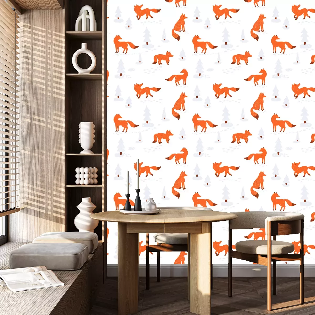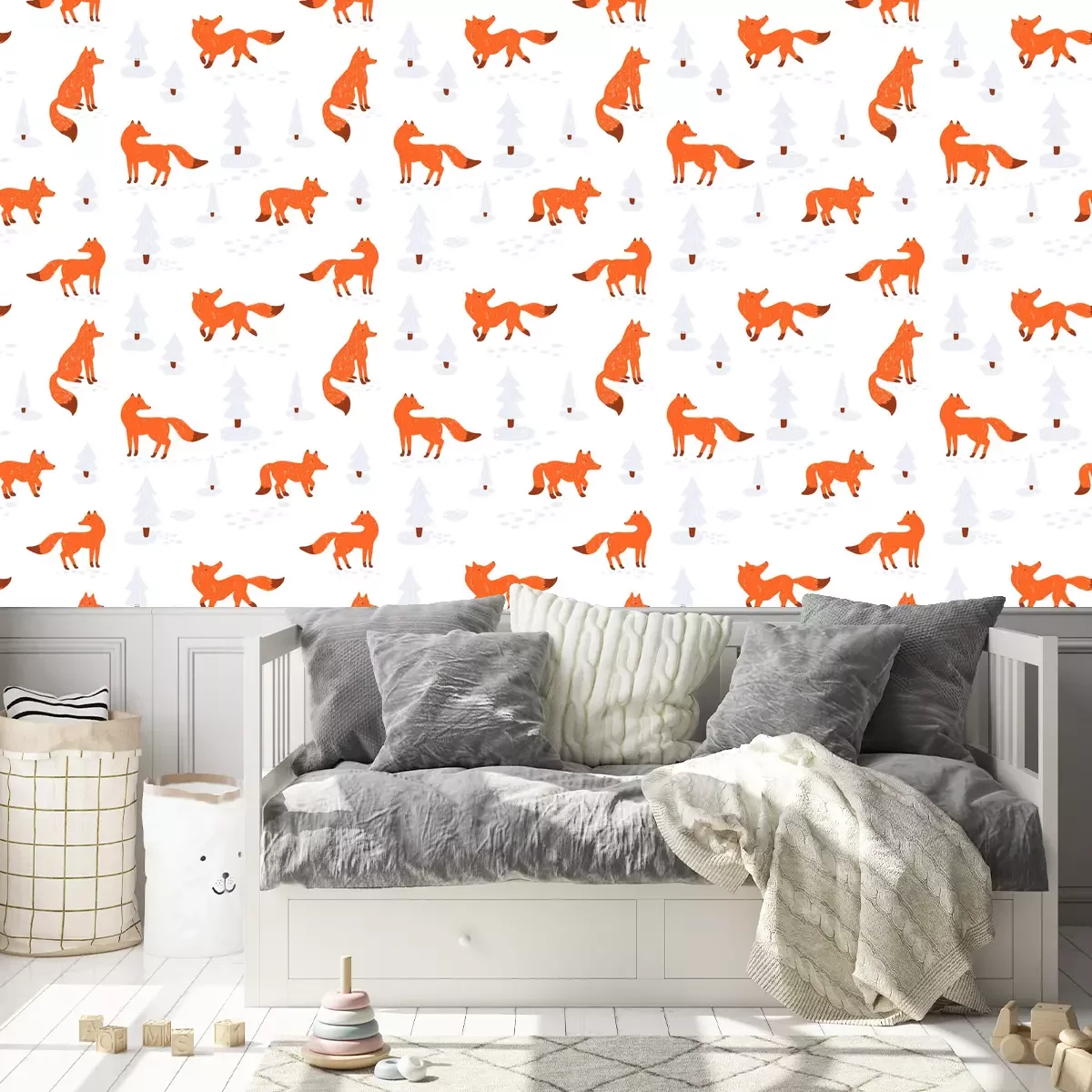 Vos behang voor kinderen in een winterse omgeving is een schattige toevoeging die perfect past bij een kinderkamer, een kleuterschool of een andere kinderlijke ruimte. Dit schilderachtige landschap trekt de aandacht en brengt een aangename, sprookjesachtige sfeer in het interieur. Het behang met vossen toont roodharige vossen omringd door met sneeuw bedekte bomen. Het winterse landschap creëert een rustige sfeer en behoudt tegelijkertijd de kinderlijke vreugde en nieuwsgierigheid. De sneeuw vormt een perfecte achtergrond voor pootafdrukken achtergelaten door de vos. Het vos behang ziet er hierdoor ongetwijfeld schattig uit en het patroon krijgt extra charme. Het kijken naar deze schattige pootjes kan de verbeelding van een kind stimuleren en aanzetten tot creatieve spelletjes en plezier. Het vossenbehang heeft vele voordelen, maar de veelzijdigheid en universaliteit zijn zonder twijfel de belangrijkste. Het past zowel in een jongens- als meisjeskamer vanwege het schattige en neutrale thema. Het vossen- en sneeuwthema kan een perfecte achtergrond zijn voor zowel pasgeborenen als oudere kinderen. Dankzij het ingetogen kleurenpalet kan het behang vos gemakkelijk gecombineerd worden met andere interieuraccenten. Dit thema past het beste bij stijlen die natuurlijke charme en gezelligheid benadrukken. De Scandinavische stijl, die eenvoud en functionaliteit waardeert, gaat perfect samen met zo'n thema. Je kunt ook een vleugje rustieke charme toevoegen door te kiezen voor meubels en accessoires van natuurlijke materialen zoals hout en linnen. In combinatie met pastelkleuren zullen de vos, behang en het winterse landschap een gezellige en harmonieuze omgeving creëren. Bij het kiezen van accessoires voor de voorgestelde decoratie is het de moeite waard om te kiezen voor elementen die het thema van het winterbos voortzetten. Je kunt zachte kussens toevoegen, bij voorkeur in beige of oranje kleuren die overeenkomen met de kleur van de vacht van vossen, om een extra charmant element toe te voegen. Houten decoraties, zoals fotolijsten of planken, benadrukken de natuurlijke aard van het thema. Kinderdekens of dekbedden in pastelkleuren zullen een ideale aanvulling zijn, waardoor een gevoel van warmte en comfort wordt geboden. Goed gekozen lampen of lantaarns die de vorm van bomen of ijspegels nabootsen, voegen een sfeervolle verlichting toe aan de kamer en brengen het behang vos met vossen nog beter tot zijn recht.