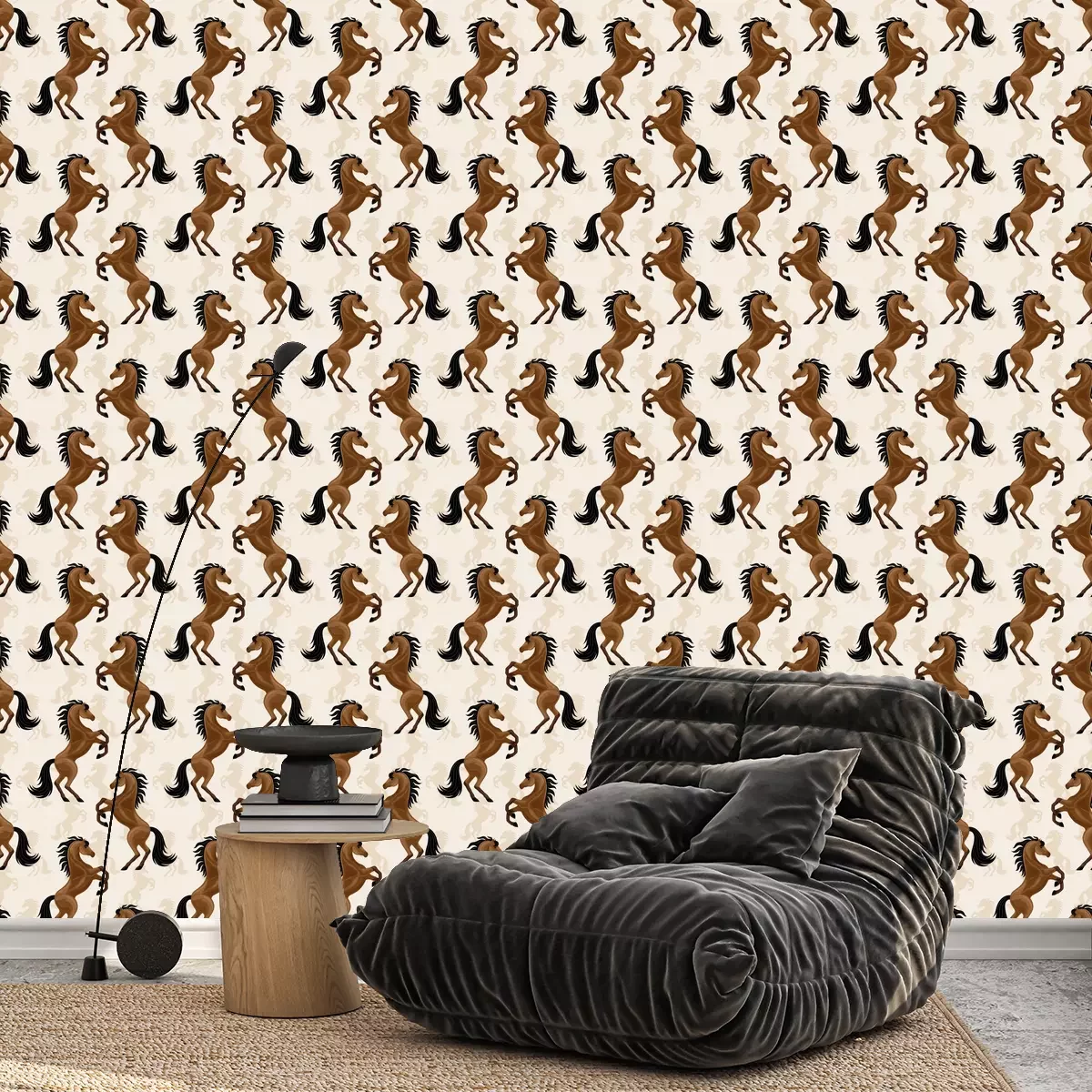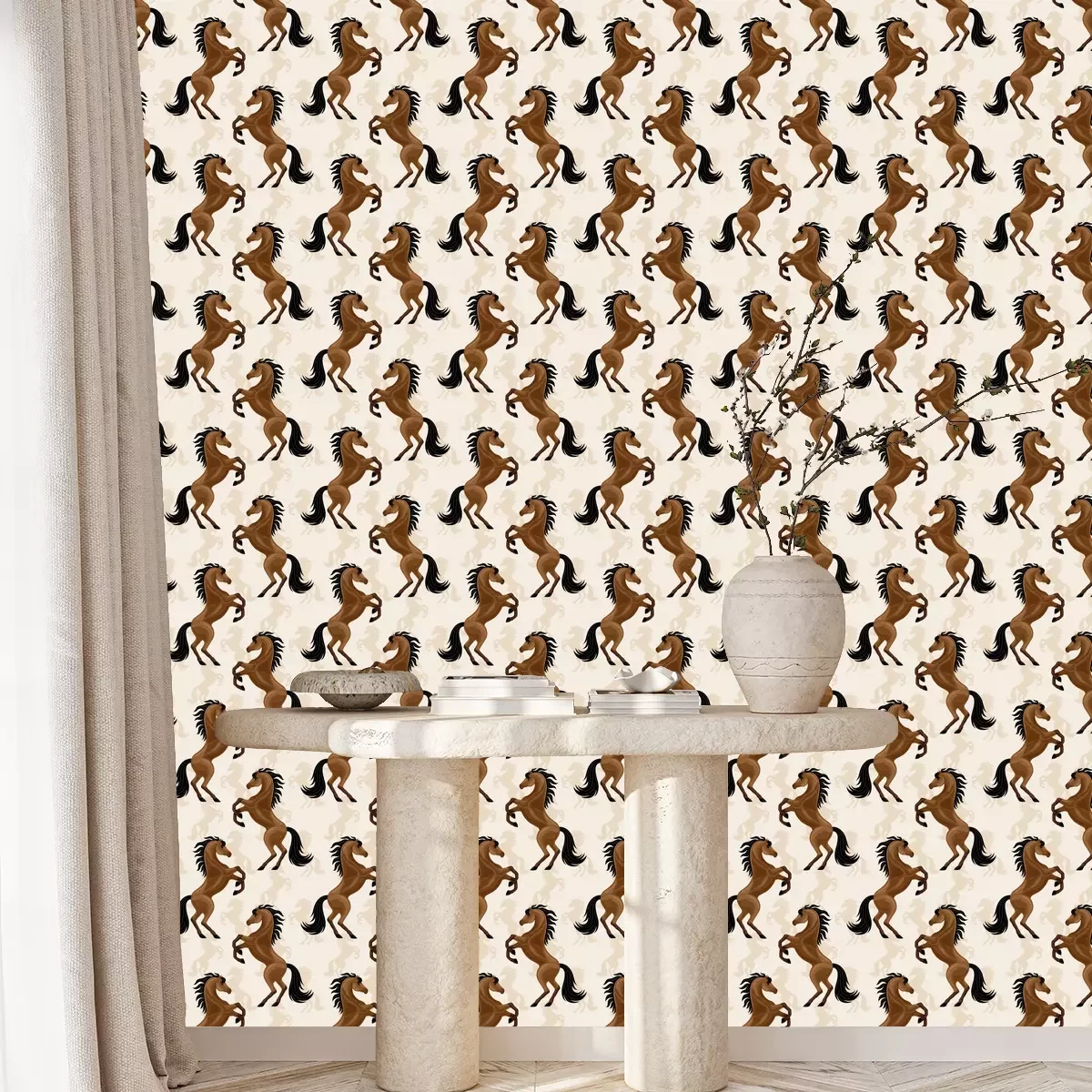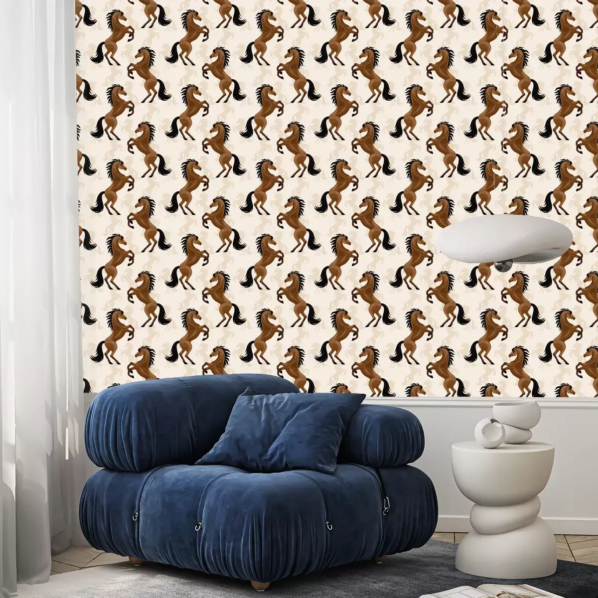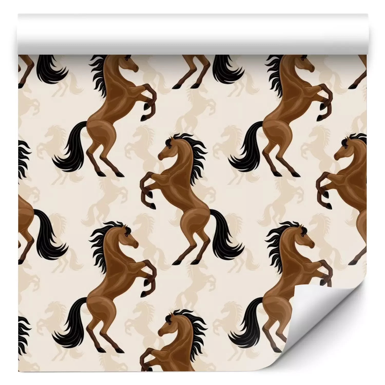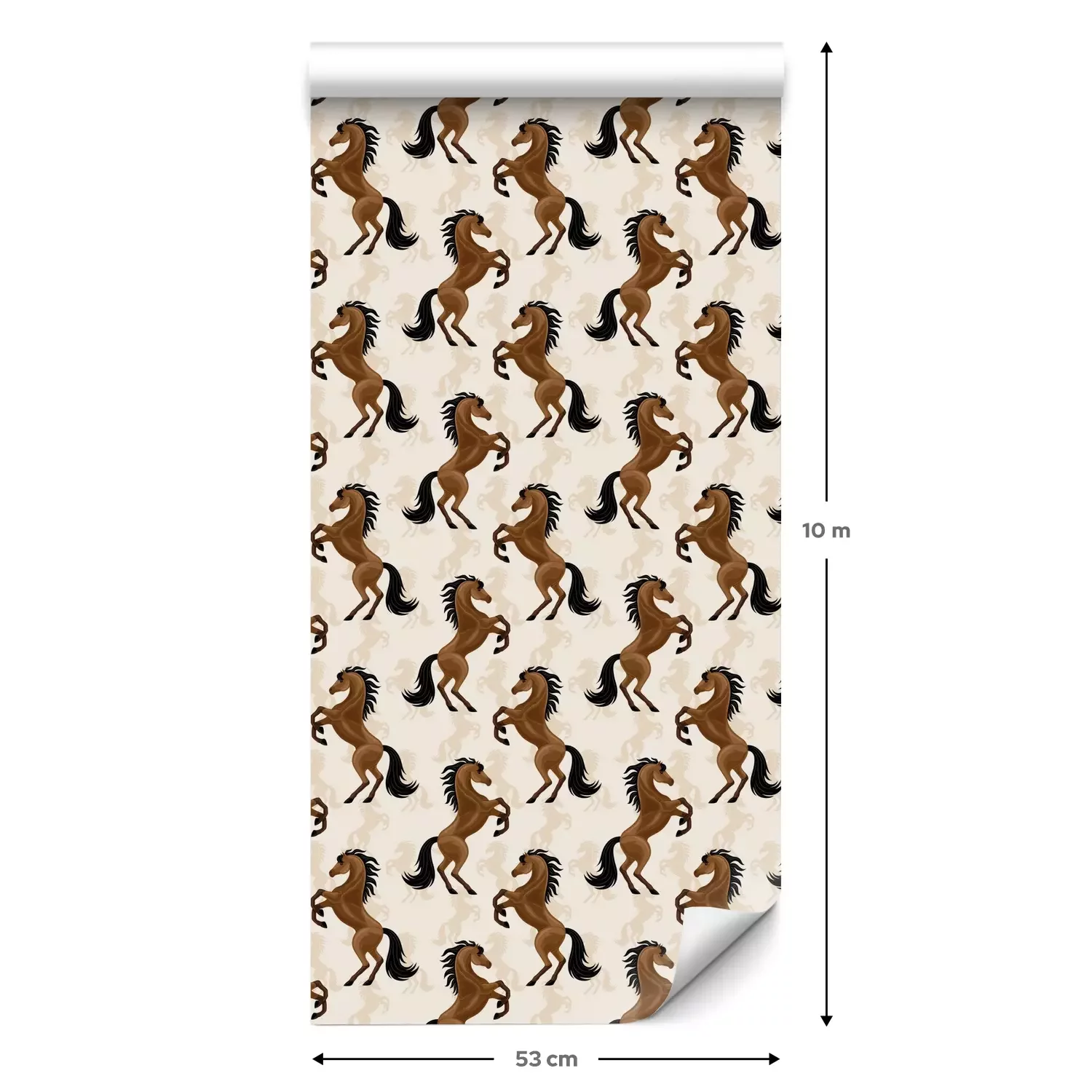 Behang paarden op een beige achtergrond is een prachtige decoratie die in verschillende interieurs past. Zijn unieke patroon valt op en voegt charme toe aan de kamer door de majestueuze en trotse staande figuren van paarden in volle glorie te laten zien. Dit behang met paarden is perfect voor de kamer van een kleine dierenliefhebber, zeker als iemand van paarden houdt. Het paarden behang kan worden geplaatst op een van de muren en creëert zo een visueel middelpunt. Kinderen zullen gefascineerd zijn door een ruimte vol paarden, die hun verbeelding en passie voor paardrijden kunnen stimuleren. Om het paard te accentueren kan paarden behang worden gedecoreerd met houten planken voor boeken en speelgoed. Zachte kussens in aardse kleuren accentueren het bed van de kleine ruiter. Daarnaast kunnen canvasen met scènes van velden en weiden of foto's met lievelingspaarden een persoonlijk tintje aan een kamer geven. Dit behang paarden zal ook perfect passen in een ruiterclub. Je kunt het in de lobby of lounge aanbrengen om een paardensfeer te creëren. Het zal een aangename plek zijn om te ontspannen na een training of clubbijeenkomst. Om deze stijl nog beter te benadrukken, kun je grote canvassen met paarden aan de muur hangen, houten meubilair zoals tafels en stoelen een rustieke charme geven en paardgerelateerde decoraties zoals tafellampen in de stijl van hoofdstellen en zadels toevoegen. Planten in potten, vooral die met een natuurlijk, bosachtig karakter, kunnen een vleugje frisheid brengen in een clubinterieur. Paardenbehang is een uniek decoratief element dat charme en karakter kan toevoegen aan verschillende ruimtes. De juiste accessoires, zoals meubels, schilderijen, kussens en decoraties, kunnen helpen om een samenhangend en inspirerend decor te creëren in zowel een kinderkamer als een manege clubhuis. Behang met paarden herinnert ons aan de passie voor deze prachtige dieren en creëert een unieke sfeer waarin paardenliefhebbers zich in hun natuurlijke omgeving zullen voelen.