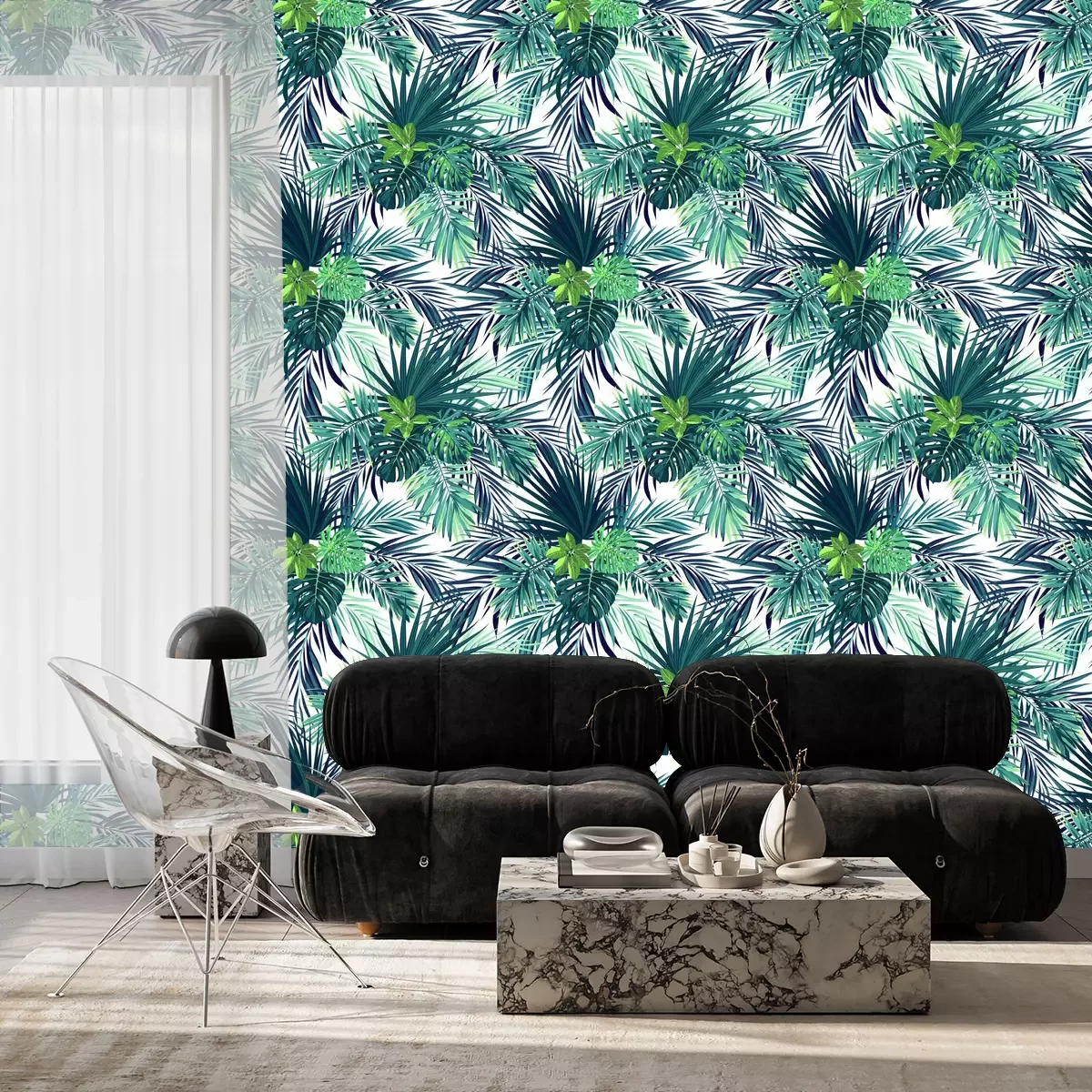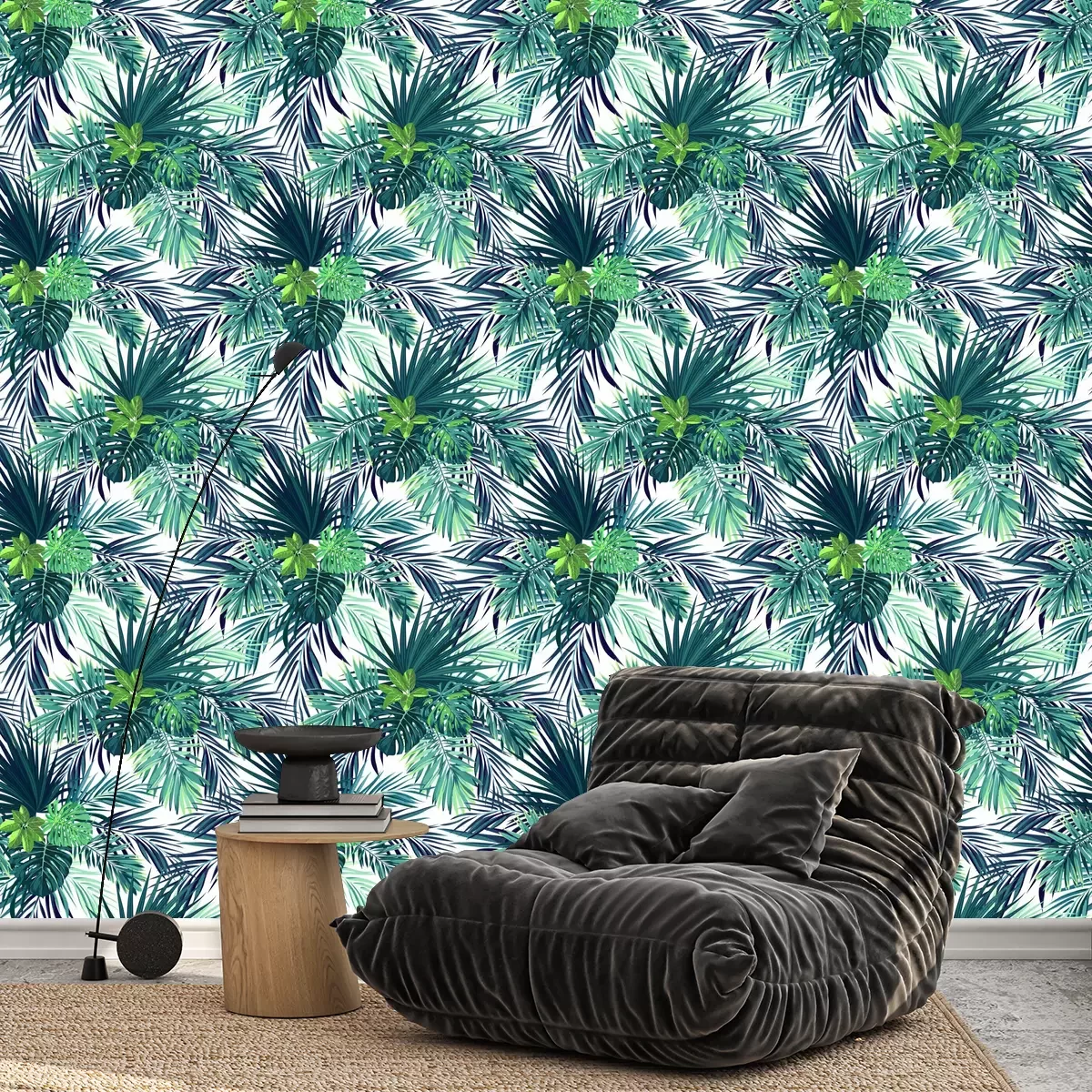 Blauw patroon met jungle plantenFotobehang
