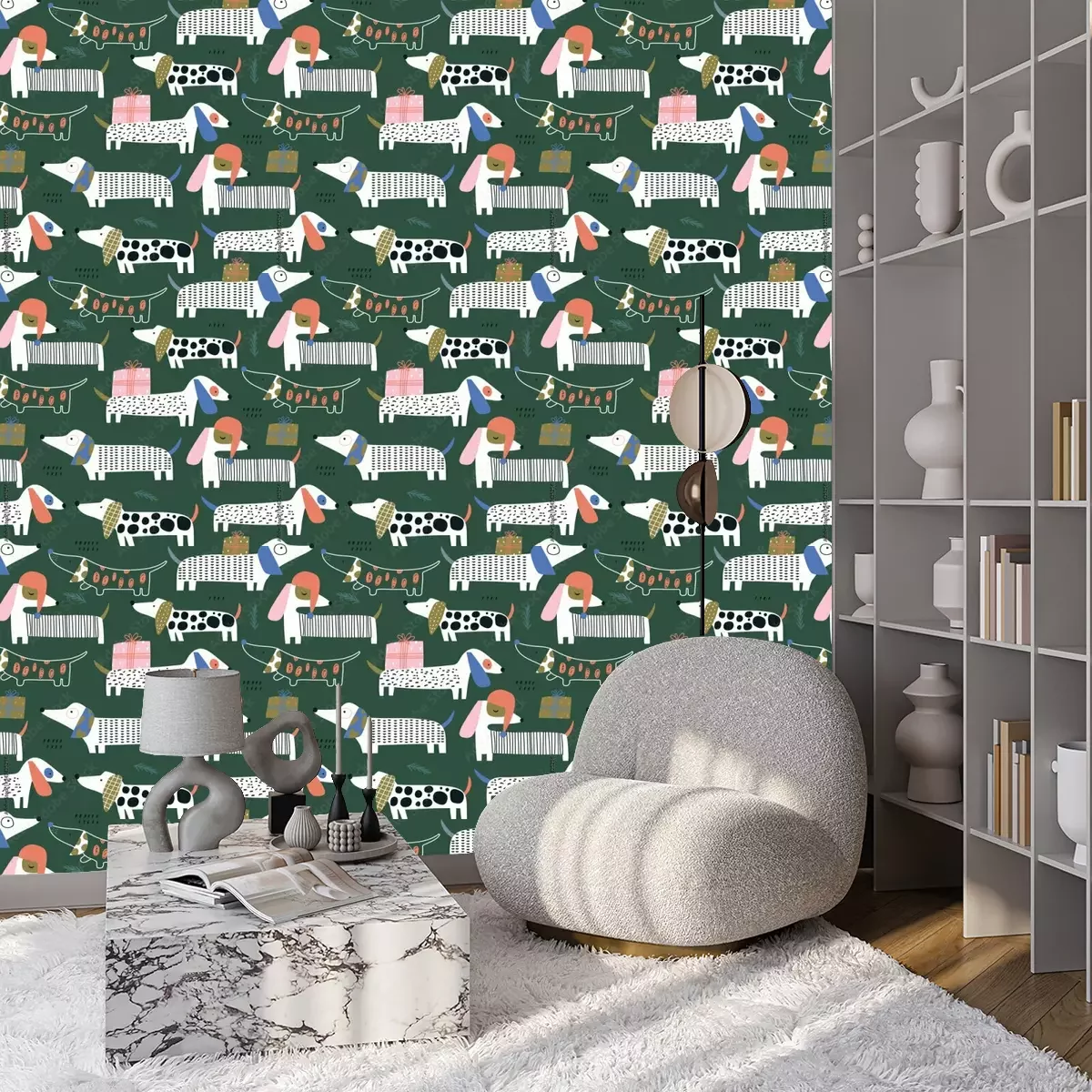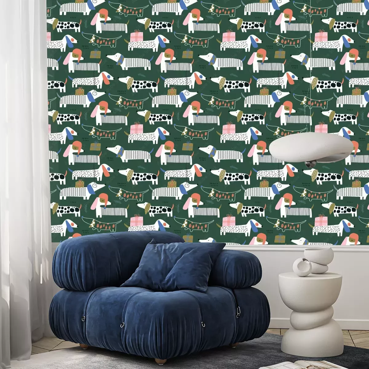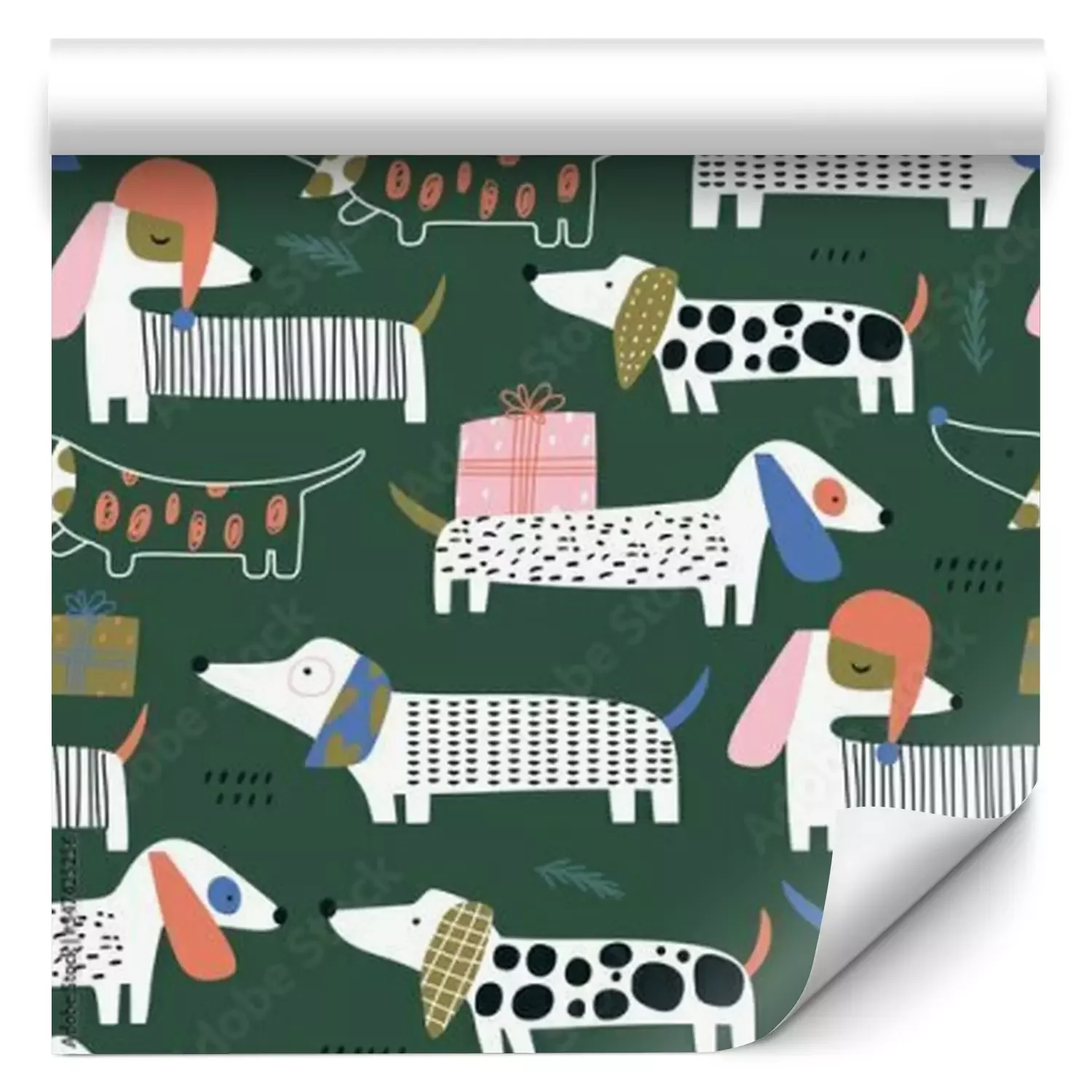 Grappige kleine hondenDit schattige hondenbehang met getekende teckels op een donkergroene achtergrond neemt je mee naar de wereld van plezier, vreugde en onvoorwaardelijke liefde die honden ons kunnen bieden. Het patroon van het behang met honden toont teckels versierd met vlekken of strepen, wat een dynamische en charmant asymmetrische compositie creëert. Het bijzondere aan dit honden behang is dat het niet alleen honden afbeeldt, maar ook feestelijke toevoegingen heeft, zoals kleurrijke cadeautjes en delicate takjes. Deze elementen geven het behang een uniek karakter en creëren een sfeer van vreugdevolle verwachting voor magische momenten. Dit schattige hondenbehang met getekende teckels op een donkergroene achtergrond betovert met zijn unieke uitstraling en details. De teckels hebben verschillende gekleurde oren, wat hen nog meer schoonheid en karakter geeft. Elke teckel heeft oren in een andere opvallende kleur, wat een spectaculair contrast creëert en extra aantrekkelijkheid toevoegt. Het patroon van het behang met honden toont teckels in verschillende patronen, zoals stippen, strepen en lijnen. Ongeacht het patroon, heeft elke teckel unieke gezichtsuitdrukkingen, die speelsheid en humor toevoegen. Sommige teckels lijken blij, andere verrast of geïnteresseerd, wat een interessante galerij van uitdrukkingen creëert. Deze levendige patronen, kleurrijke oren en gevarieerde gezichtsuitdrukkingen van de teckels maken dit hondenbehang niet alleen schattig, maar ook vol persoonlijkheid. Als je nadenkt over muurdecoratie, kies dan voor honden. Behang met dit patroon zal zeker aan je verwachtingen voldoen. Het zal een unieke inrichting creëren en een aangename sfeer van vreugde en zorgeloosheid in de ruimte brengen. In de kinderkamer zullen schattige honden, omringd door knuffels, een uitstekende keuze zijn. De vrolijke en kleurrijke teckels zullen de aandacht van de kleintjes trekken en tegelijkertijd een vriendelijke en warme omgeving creëren. Het honden behang zal speelgenoten worden voor avonturen en zal met de feestelijke toevoegingen een vleugje magie en vreugde aan de kamer toevoegen. Niet alleen in de kinderkamer, maar ook in de woonkamer zal behang met honden een unieke inrichting creëren. De donkergroene achtergrond geeft de ruimte rust en harmonie, waardoor het een knusse plek wordt om te ontspannen. De zwarte teckels, in verschillende vormen en maten, voegen dynamiek en karakter toe aan de ruimte. De feestelijke toevoegingen, zoals kleurrijke cadeautjes en takjes, zullen een vleugje magie en vrolijke sfeer aan de woonkamer toevoegen. Dit honden behang met getekende teckels op een donkergroene achtergrond, versierd met feestelijke accenten, zal niet alleen charme en vreugde aan je huis brengen, maar ook je passie voor honden en liefde voor gezellige, creatieve interieurs benadrukken. Laat het honden behang een centraal punt worden in de kinderkamer of woonkamer, waardoor ze een unieke charme, vrolijkheid en onvergetelijke momenten van plezier krijgen.