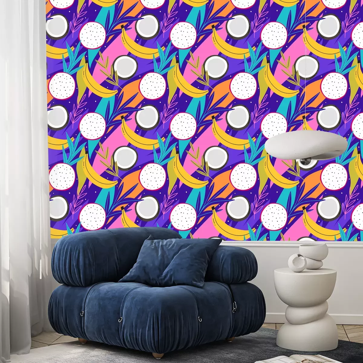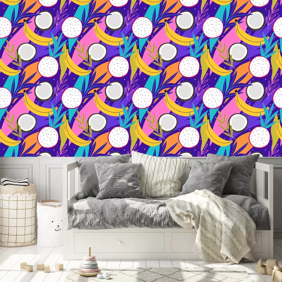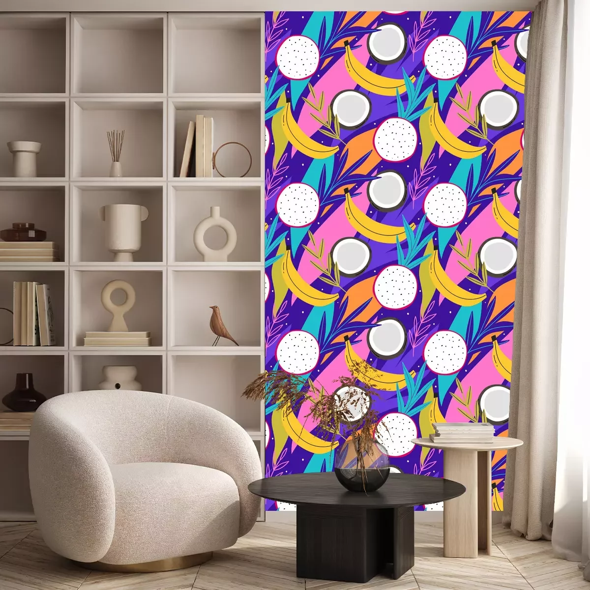 Behang met fruit zoals bananen, kokosnoten en pitaja is een uiting van een vrolijke zomerse sfeer, vol kleuren en positieve energie. Dit dynamische patroon, dat tropisch fruit combineert dat de vakantiesfeer weerspiegelt met exotische kleuren, resulteert in een origineel en vrolijk ontwerp van behang. Fruit is een uitstekende toevoeging aan vele interieurs die een beetje frisheid en karakter nodig hebben. Het is de perfecte aanvulling voor een hal, die het visitekaartje van het huis is, voor de kamer van een charismatische tiener of voor de woonkamer! De levendige kleuren van het patroon passen perfect bij ruimtes met neutrale basiskleuren, zoals witte, beige of grijze muren. Behang met fruit voegt direct leven toe, waardoor het interieur een unieke uitstraling krijgt. Het fruitpatroon past vooral goed in interieurs in tropische, boho of vintage stijl. In een tropische stijl zal het behang banaan, kokos en pitaja perfect samengaan met natuurlijke materialen, zoals rotanmeubelen, houten vloeren en lichte textiel. Het kan ook worden gecombineerd met kamerplanten zoals palmen, bananenbomen of orchideeën om de exotische sfeer te benadrukken. Ook in bohostijl zullen patronen met dit thema perfect zijn voor fruit. Behang met zo'n motief kan worden aangevuld met zachte stoffen, zoals macramé, kleurrijke kussens en tapijten met etnische patronen. Je kunt ook handgemaakte decoratieve elementen toevoegen, zoals houten beeldjes of handgeweven manden, om het artistieke karakter van het interieur te versterken. In vintage stijl zal dit patroon charme en nostalgie toevoegen. Het kan worden gecombineerd met retro meubels en decoraties, zoals klassieke fauteuils, houten bureaus of oude fotolijsten. Het fruit behang wordt dan een centraal punt in het interieur, waardoor het een uniek en vrolijk karakter krijgt. De voordelen zijn talrijk, maar vooral zal het interieurs energie en vitaliteit geven, waardoor ze aangenamer en positiever worden. Het kleurrijke patroon kan ook de stemming verbeteren en een glimlach op het gezicht toveren. Behang fruit is ook een uitstekende manier om een thematisch interieur te creëren dat zich onderscheidt van andere. Hiermee kun je een ruimte creëren die vakantieherinneringen oproept en positieve associaties wekt.
