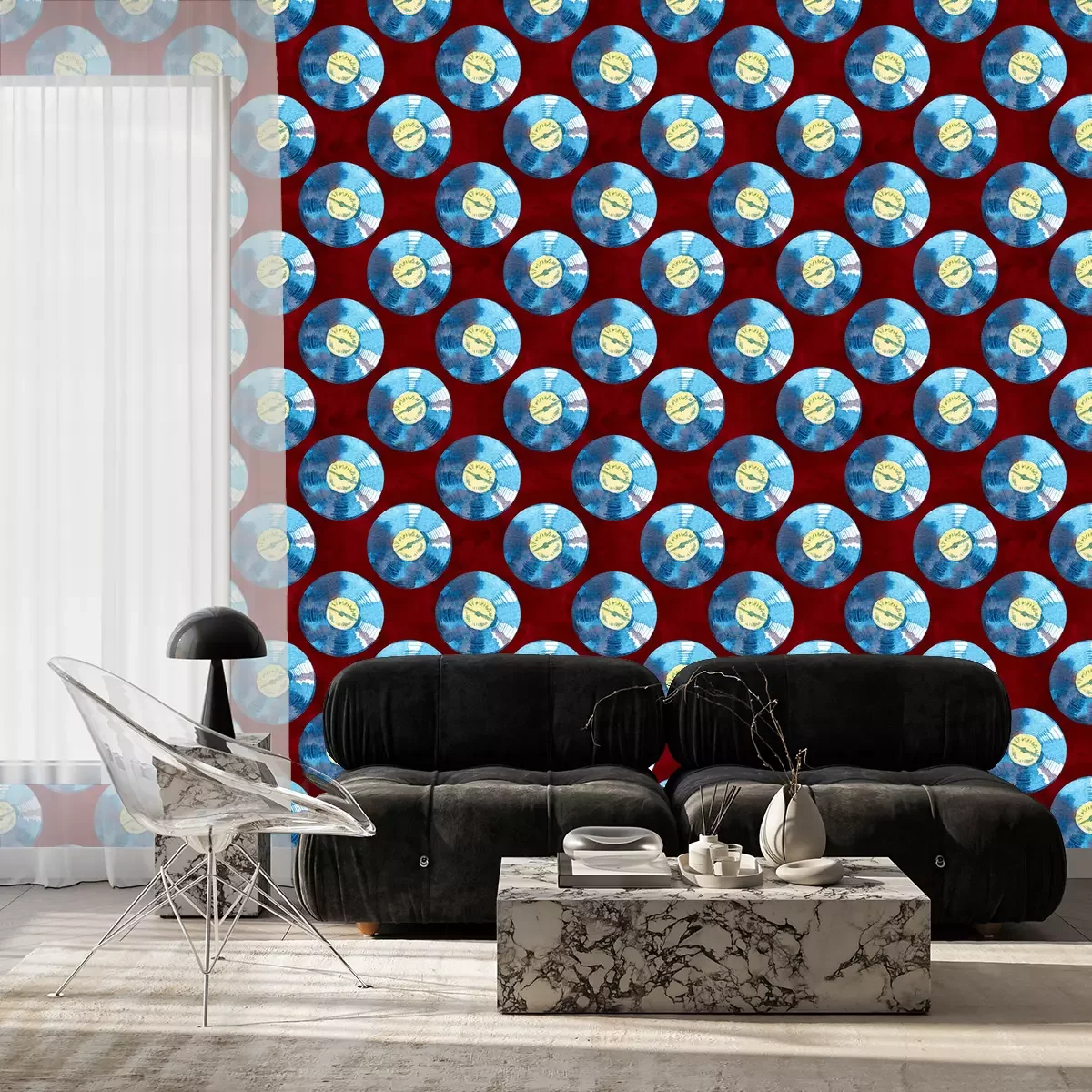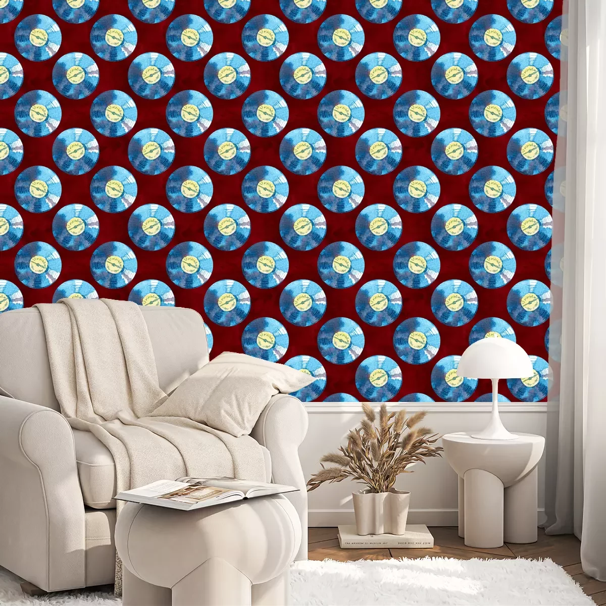Aquarel behang "vinylplaten" met blauwe platen op een rode achtergrond is een uitstekende manier om een interieur op te frissen en het een uniek karakter te geven. De artistieke compositie op het patroon is veelzijdig en past perfect in verschillende ruimtes en decorstijlen. Het belangrijkste element zijn de vinylplaten. Behang zoals dit lijkt muziekgolven na te bootsen. De vormen van de platen en het feit dat ze lichtjes vervaagd zijn, creëren een gevoel van vloeibaarheid en beweging. Ze contrasteren met de intense rode achtergrond, die het geheel energie en expressiviteit geeft. De aquareltechniek geeft een subtiele en artistieke uitstraling aan dit behang. Vinylplaten maken het visueel zeer aantrekkelijk. Behang vinylplaten kan in verschillende ruimtes worden gebruikt, afhankelijk van persoonlijke voorkeuren en decorstijl. Ze zijn perfect voor in de woonkamer of de huiskamer, waar ze dynamiek en kleur toevoegen. Ze kunnen ook een interessant element in de slaapkamer vormen, en creëren een sfeer van creatieve inspiratie. Als je een muziekliefhebber bent, is dit ontwerp ideaal voor het decoreren van een muziekkamer of studio. Om het karakter van behang vinylplaten nog meer te benadrukken, kunnen ze worden gecombineerd met verschillende accessoires. Meubels in een minimalistische stijl, zoals eenvoudige, zwarte of witte rekken, tafels of stoelen, vormen een geweldige achtergrond, waardoor de expressiviteit van het patroon wordt benadrukt. Het toevoegen van een paar blauwe accenten, zoals kussens, decoratieve elementen of lampen, garandeert consistentie en harmonie in de ruimte. Als je de voorkeur geeft aan meer gewaagde en eclectische combinaties, kan het behang worden gecombineerd met meubels en accessoires in andere kleuren. Meubels in een intense tint groen, oranje of geel, zullen de kamer levendigheid en uitstraling geven. Je kunt ook metalen elementen toevoegen, zoals messing of koper, om de ruimte een moderne en industriële uitstraling te geven.