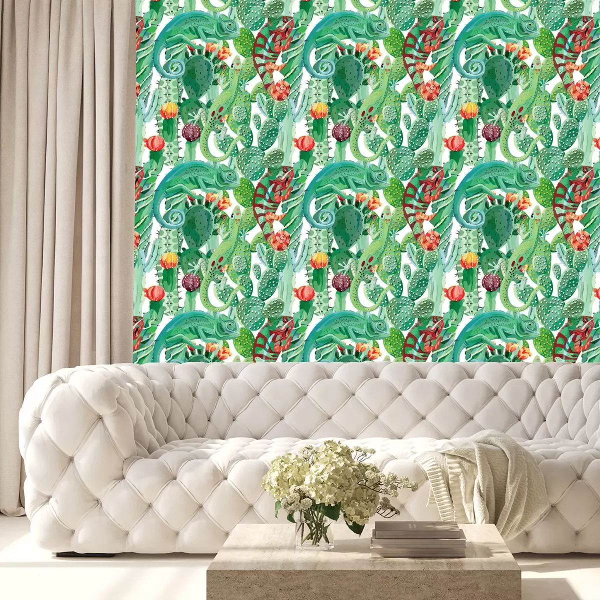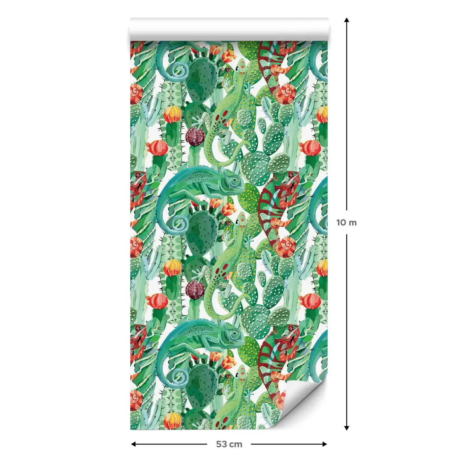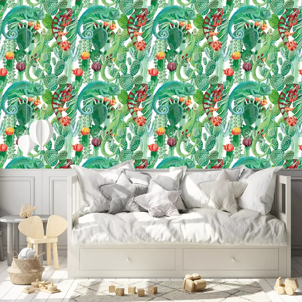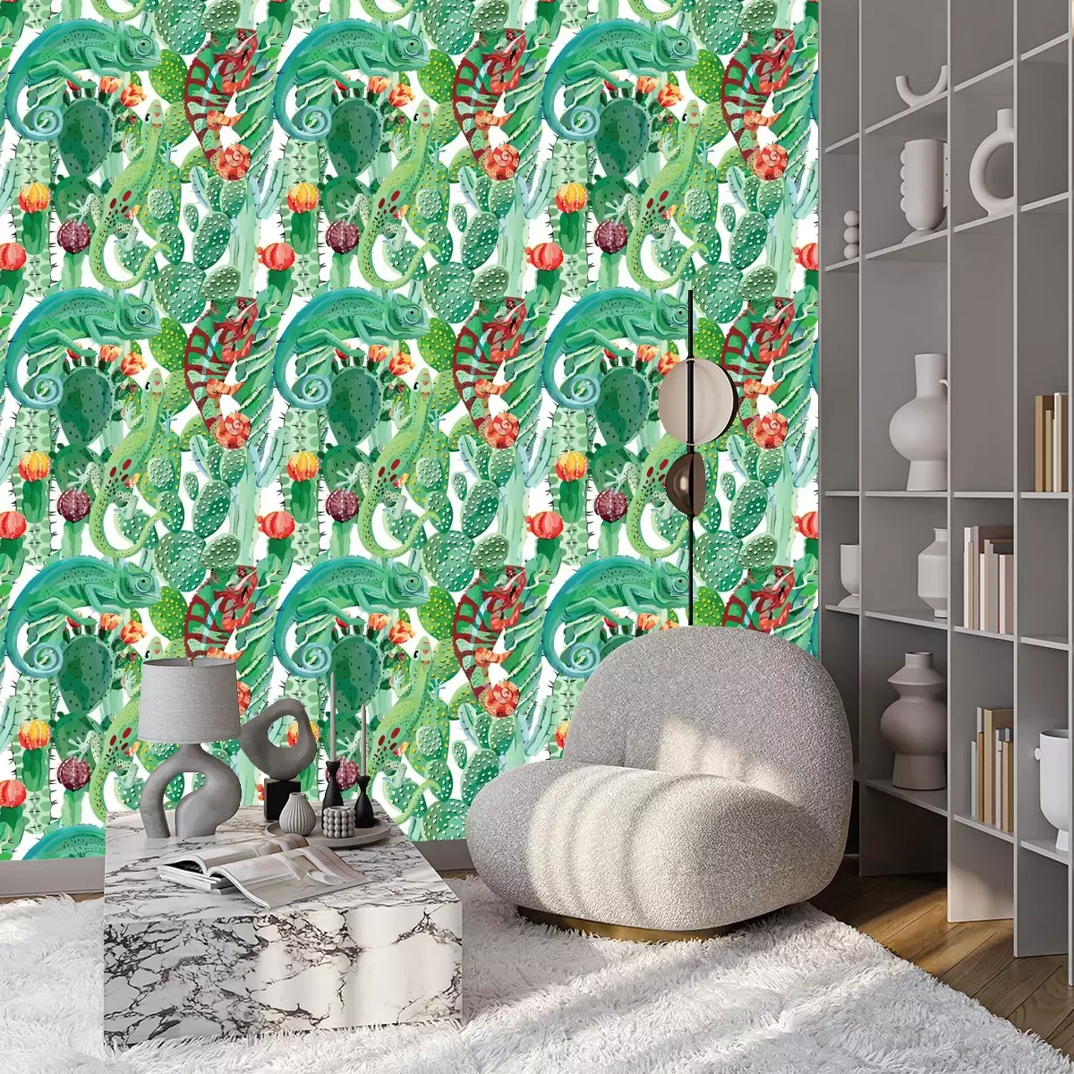 Banaan textuurBehang kameleon tussen bloeiende cactussen is een buitengewoon patroon dat indruk maakt met zijn energie en originaliteit. Door gebruik te maken van het bekende vermogen van kameleons om zich aan te passen aan hun omgeving, zorgt dit behangsoort dat ze nauwelijks zichtbaar op de achtergrond van het patroon. Ze lijken er letterlijk mee te versmelten en creëren zo een buitengewoon harmonieuze compositie. Ontdek hoe bijzonder een kameleon kan zijn. Het behang zal een krachtig accent op de muur vormen en een flinke dosis groen aan het interieur toevoegen. Daarom is het het beste om het te combineren met witte of beige accessoires om een evenwichtige en harmonieuze inrichting te creëren. Hierdoor zal het kameleon behang het middelpunt van de ruimte worden, de aandacht trekken en karakter toevoegen. Een buitengewoon voordeel is de veelzijdigheid en brede toepassingsmogelijkheden van dergelijk behang. Jungle en haar bewoners zijn nu binnen handbereik. Het zal perfect passen in minimalistische ruimtes, waar het de rol van belangrijk decoratief element kan vervullen. Het kan een uitstekende aanvulling zijn in de kamer van een tiener of kind, waardoor deze kamers een vleugje natuur en exotische charme krijgen. Ook in een thuiskantoor is er ruimte voor zo'n behang. Jungle aan de muur creëert een prettige werkomgeving, en de groene kleur, bekend om zijn rustgevende eigenschappen, bevordert ontspanning in stressvolle momenten. Kameleon en jungle behang voegt karakter en frisheid toe aan minimalistische inrichtingen. In Scandinavische stijl voegt het een interessant natuurmotief toe, terwijl het tegelijkertijd een zachte element van de compositie is. In combinatie met een moderne en innovatieve stijl zal dit kameleon behang een interessant contrast vormen en expressie toevoegen aan de ruimte.
