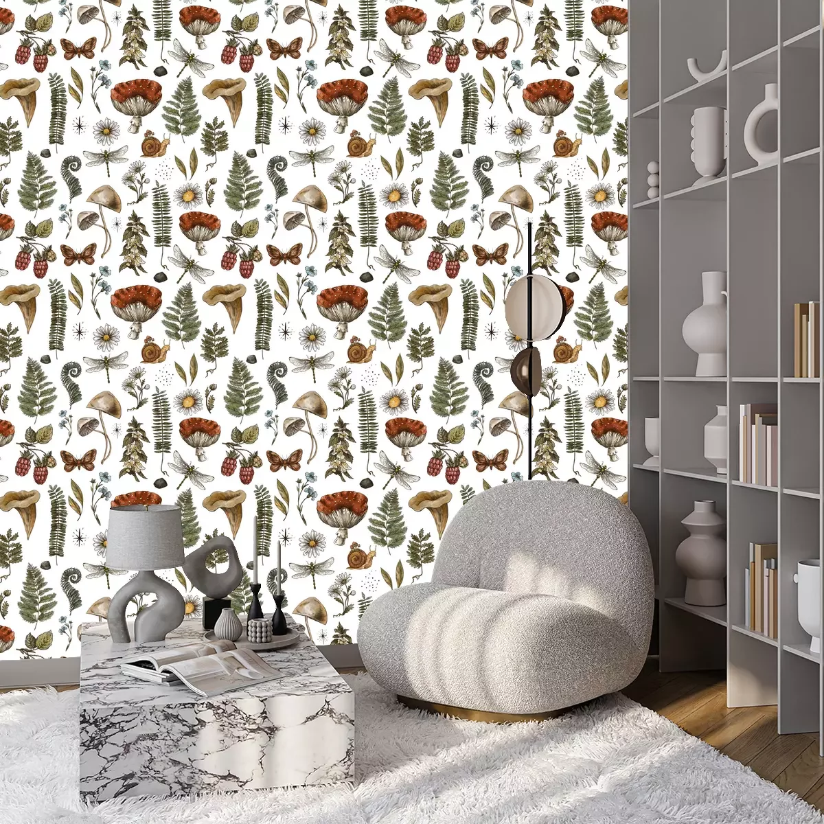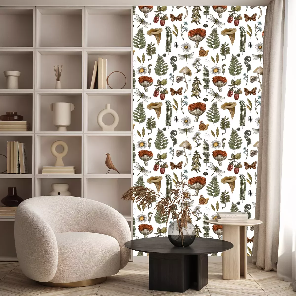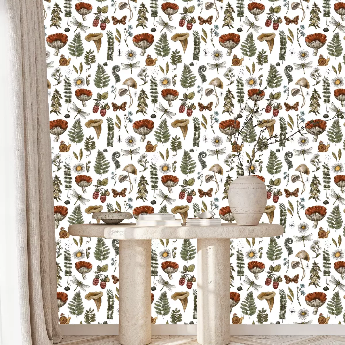 BospaddestoelenBos behang met paddenstoelen neemt ons mee naar een schilderachtige wereld van de natuur, waar paddenstoelen van verschillende soorten, varens, libellen, vlinders, bosvruchten, slakken en bloemen harmonieus samenleven. Dit patroon weerspiegelt perfect de sfeer van een herfstbos en brengt leven in het interieur, en geeft het een gezellige, natuurlijke uitstraling. Het planten behang past perfect bij de bosstijl, die zich richt op het gebruik van organische materialen, natuurlijke kleuren en patronen geïnspireerd door de natuur. Dankzij de aanwezigheid van groene elementen in de compositie zoals bloemen en paddenstoelen, past dit behang planten perfect bij andere groene accenten in de kamer, zoals kamerplanten of meubels in groentinten. Ook in een rustieke stijl zal het paddenstoelen behang uitstekend passen. Dankzij verwijzingen naar de natuur en warme, gedempte kleuren brengt het een landelijke, charmante sfeer in huis. Het kan worden gecombineerd met houten meubels, rustieke accessoires zoals rieten manden of geruite stoffen. Maar dat is niet het einde van de ideeën voor het voorgestelde behangpatroon. Planten zijn ook een uitstekende keuze voor de boho-stijl. Dit patroon combineert natuurlijke elementen, rijke kleuren en versieringen geïnspireerd door de natuur. Deze decoratie past perfect in de sfeer van vrijheid, expressie en creativiteit die kenmerkend is voor de boho-stijl. Het kan worden gecombineerd met etnische stoffen, zachte kussens en oosterse tapijten. We mogen kinderarrangementen niet vergeten, waar behang met planten een echt juweeltje zal zijn. Het roept de magie van het bos op en opent de deur naar de verbeelding van kinderen. Het brengt een gezellige, natuurlijke sfeer in de kinderkamer, die uitnodigt tot het ontdekken van de wereld en inspireert tot spelen. Niet alleen kinderen, maar ook volwassen natuurliefhebbers zullen dit behang planten zeker waarderen. Paddenstoelen en bosmotieven zullen een unieke sfeer toevoegen en charme en nabijheid van de natuur brengen in elke ruimte. Dit motief combineert perfect met natuurlijke materialen zoals hout en steen, evenals met gedempte kleuren en natuurlijke accessoires zoals gedroogde bloemen of handgemaakte keramiek. Interieurs ingericht met dit behang met planten zullen warmte uitstralen en uitnodigen tot ontspanning en bezinning. Het is een uitstekende manier om jezelf te verplaatsen naar een herfstbos, ongeacht het seizoen.