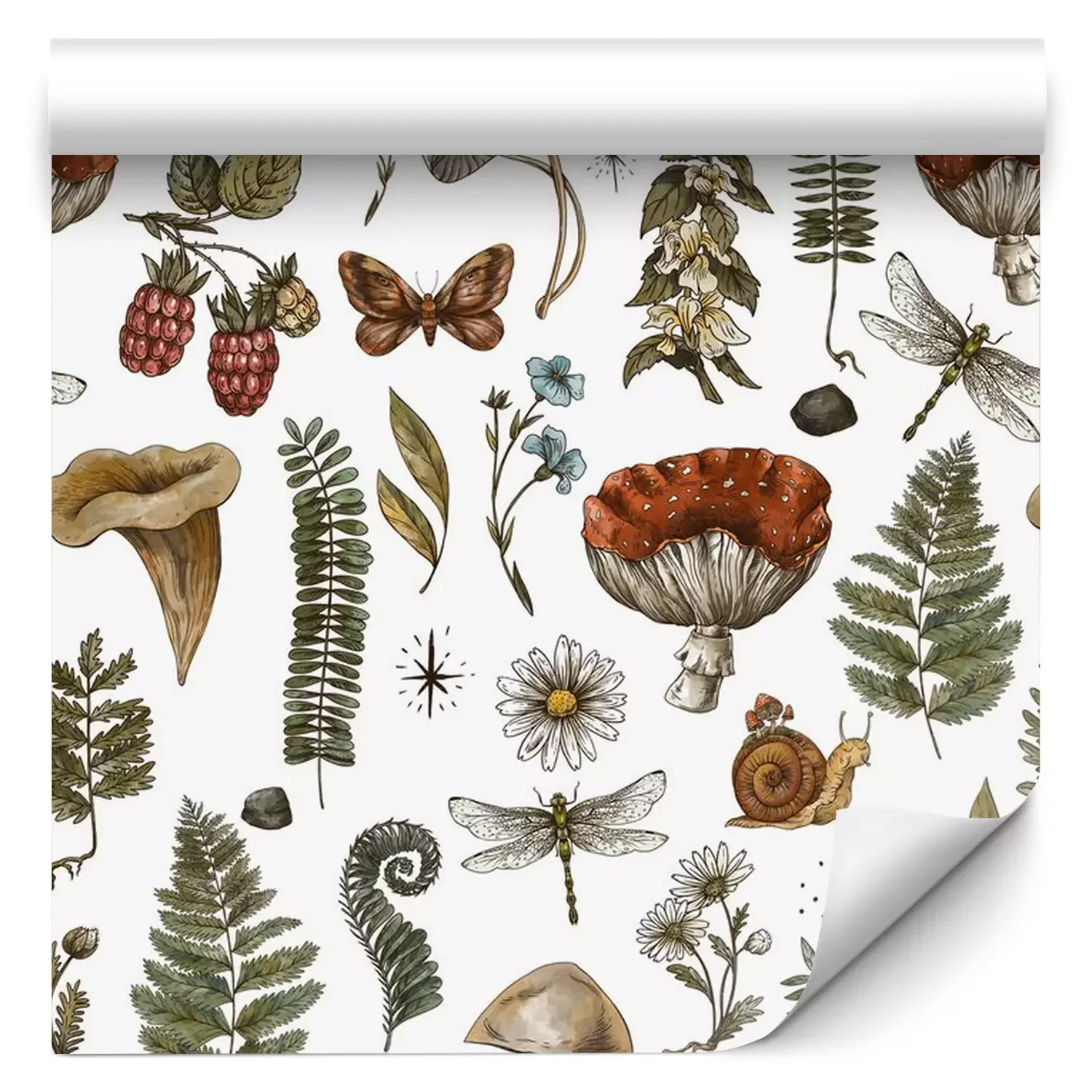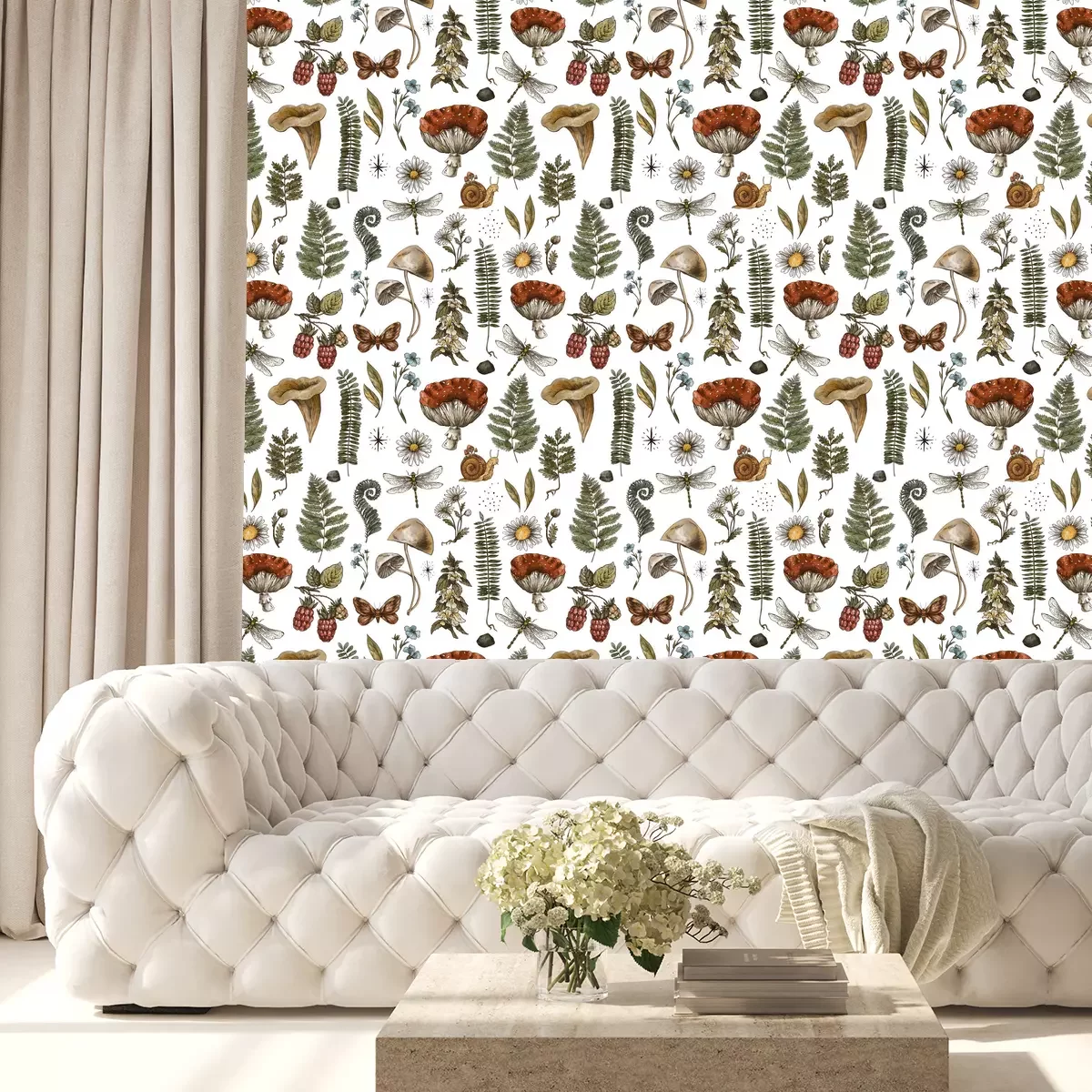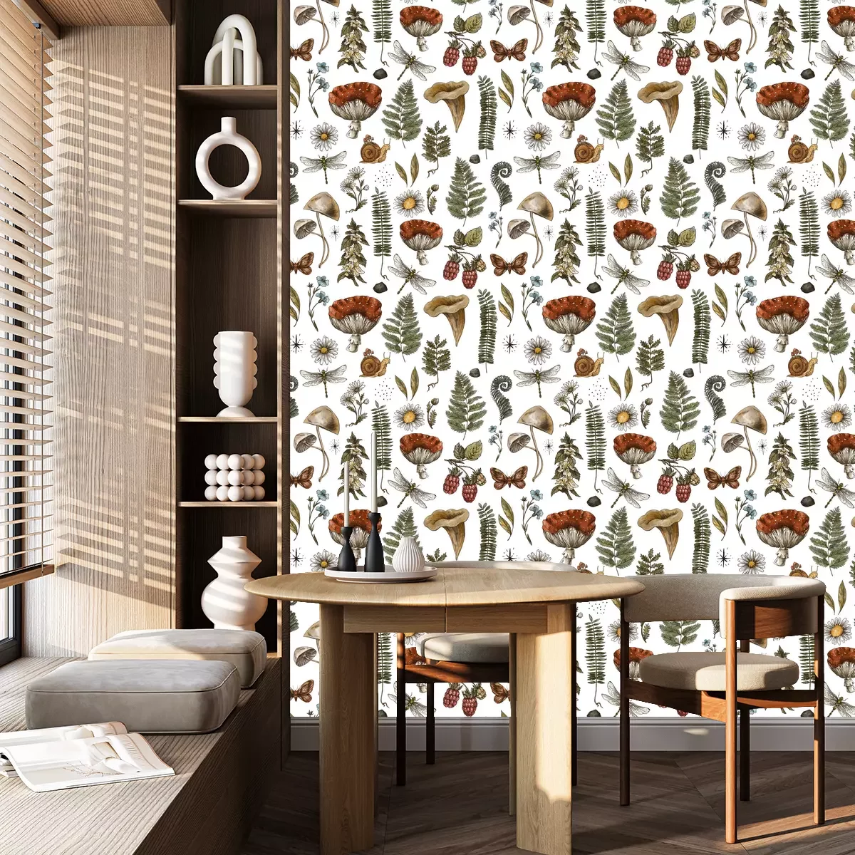 BospaddestoelenBos behang met paddenstoelen neemt ons mee naar een schilderachtige wereld van de natuur, waar paddenstoelen van verschillende soorten, varens, libellen, vlinders, bosvruchten, slakken en bloemen harmonieus samenleven. Dit patroon weerspiegelt perfect de sfeer van een herfstbos en brengt leven in het interieur, en geeft het een gezellige, natuurlijke uitstraling. Het planten behang past perfect bij de bosstijl, die zich richt op het gebruik van organische materialen, natuurlijke kleuren en patronen geïnspireerd door de natuur. Dankzij de aanwezigheid van groene elementen in de compositie zoals bloemen en paddenstoelen, past dit behang planten perfect bij andere groene accenten in de kamer, zoals kamerplanten of meubels in groentinten. Ook in een rustieke stijl zal het paddenstoelen behang uitstekend passen. Dankzij verwijzingen naar de natuur en warme, gedempte kleuren brengt het een landelijke, charmante sfeer in huis. Het kan worden gecombineerd met houten meubels, rustieke accessoires zoals rieten manden of geruite stoffen. Maar dat is niet het einde van de ideeën voor het voorgestelde behangpatroon. Planten zijn ook een uitstekende keuze voor de boho-stijl. Dit patroon combineert natuurlijke elementen, rijke kleuren en versieringen geïnspireerd door de natuur. Deze decoratie past perfect in de sfeer van vrijheid, expressie en creativiteit die kenmerkend is voor de boho-stijl. Het kan worden gecombineerd met etnische stoffen, zachte kussens en oosterse tapijten. We mogen kinderarrangementen niet vergeten, waar behang met planten een echt juweeltje zal zijn. Het roept de magie van het bos op en opent de deur naar de verbeelding van kinderen. Het brengt een gezellige, natuurlijke sfeer in de kinderkamer, die uitnodigt tot het ontdekken van de wereld en inspireert tot spelen. Niet alleen kinderen, maar ook volwassen natuurliefhebbers zullen dit behang planten zeker waarderen. Paddenstoelen en bosmotieven zullen een unieke sfeer toevoegen en charme en nabijheid van de natuur brengen in elke ruimte. Dit motief combineert perfect met natuurlijke materialen zoals hout en steen, evenals met gedempte kleuren en natuurlijke accessoires zoals gedroogde bloemen of handgemaakte keramiek. Interieurs ingericht met dit behang met planten zullen warmte uitstralen en uitnodigen tot ontspanning en bezinning. Het is een uitstekende manier om jezelf te verplaatsen naar een herfstbos, ongeacht het seizoen.