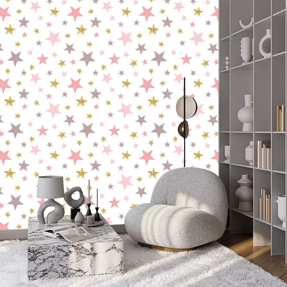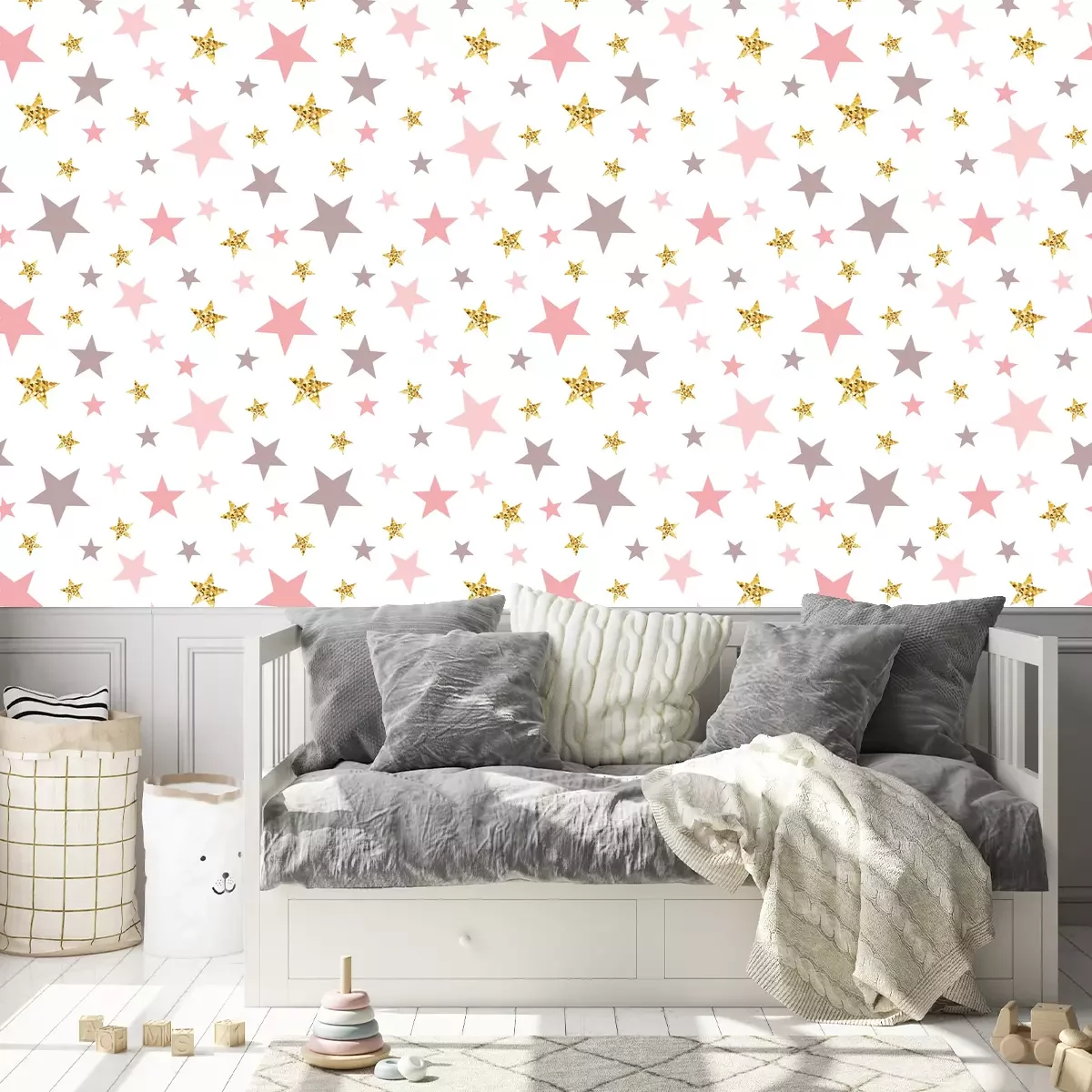 Dit bijzonder kleurrijke en opvallende behang met sterren op een witte achtergrond is een uniek decoratief element dat perfect past bij verschillende interieurstijlen. Dit zijn de stijlen waarin een dergelijk behang past. Behang met sterren past goed in een eclectisch interieur dat inspiratie haalt uit verschillende tijdperken en culturen. Dit patroon combineert moderne en klassieke elementen met een vleugje avant-garde. Gecombineerd met meubels van verschillende stijlen en decoraties uit verschillende periodes, zal het behang een uniek en onderscheidend karakter in de kamer creëren. Behang sterren kan ook een geweldige aanvulling zijn op een vintage stijl, vooral in combinatie met retro meubels en decoratie. De paarse en roze sterren doen denken aan klassieke ontwerpen uit de jaren zestig en zeventig, terwijl de gouden elementen een elegante toets toevoegen. Meubels en accessoires van hout in retrostijl in pasteltinten passen perfect bij deze sterdecoratie. Het sterren behang zal zeker een decoratieve hit zijn in de kamer van een klein meisje. Het kan worden geplaatst op één muur als achtergrond voor het bed of de speelhoek. Dit creëert een ruimtelijk gevoel en trekt de aandacht van de peuter. Accessoires voor een dergelijk interieur kunnen goed gekozen worden om de magie van het behang te benadrukken. Het behang sterren kan worden geaccentueerd met andere decoraties. We hebben een paar ideeën voor accessoires, waaronder textiel. Kies beddengoed en kussens met een stermotief dat past bij de kleuren van het behang. Behang sterren in een andere vormgeving voegen samenhang toe aan de inrichting. Een roze of ander pastel wollig tapijt is ook een goede keuze. Het is ook de moeite waard om canvassen of posters met een ruimte- of sprookjesthema toe te voegen. Dit kunnen illustraties van kinderboeken zijn of schilderijen van de maan, planeten en sterren, en maak de look af met kerstboomverlichting - gewoon of stervormig. Ze kunnen in de buurt van het bed of bij de speelgoedboekenkast worden opgehangen. Het behang sterren zal je kleine meid zeker vreugde en magie brengen. Accessoires die verband houden met de ruimte, sterren en sprookjesfiguren zullen de inrichting zeker aanvullen en een vriendelijke en inspirerende plek creëren om te spelen en te slapen.
