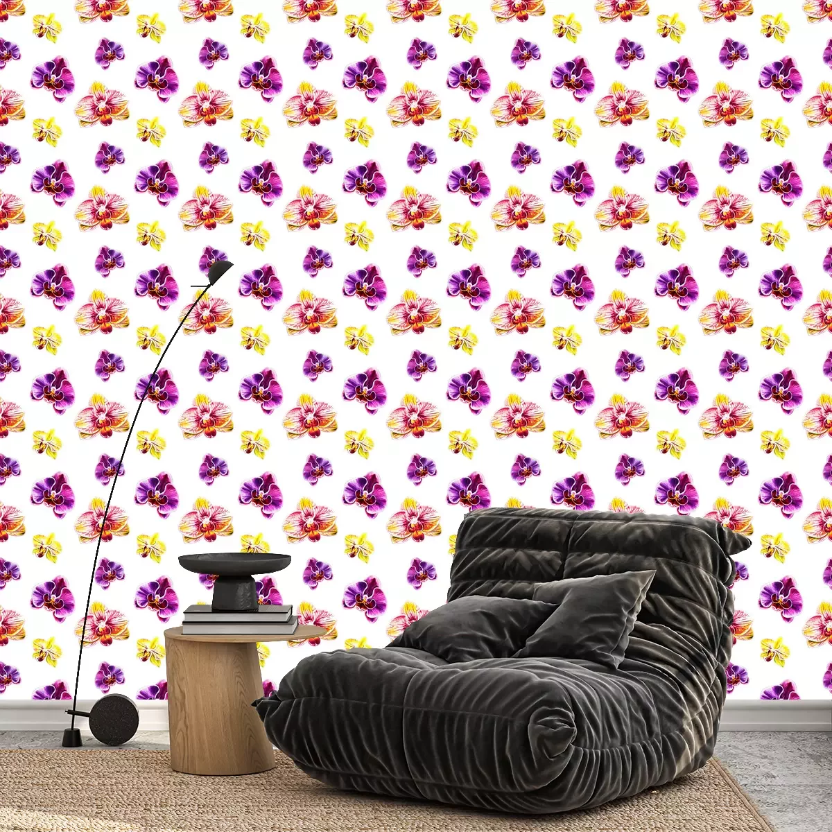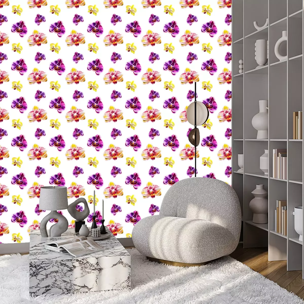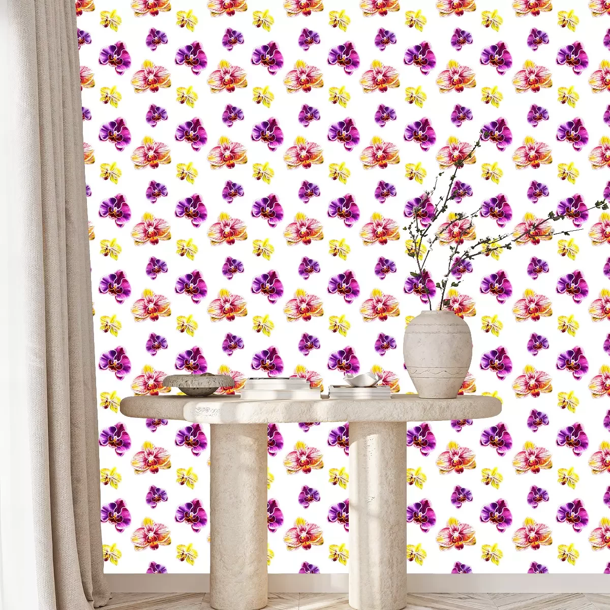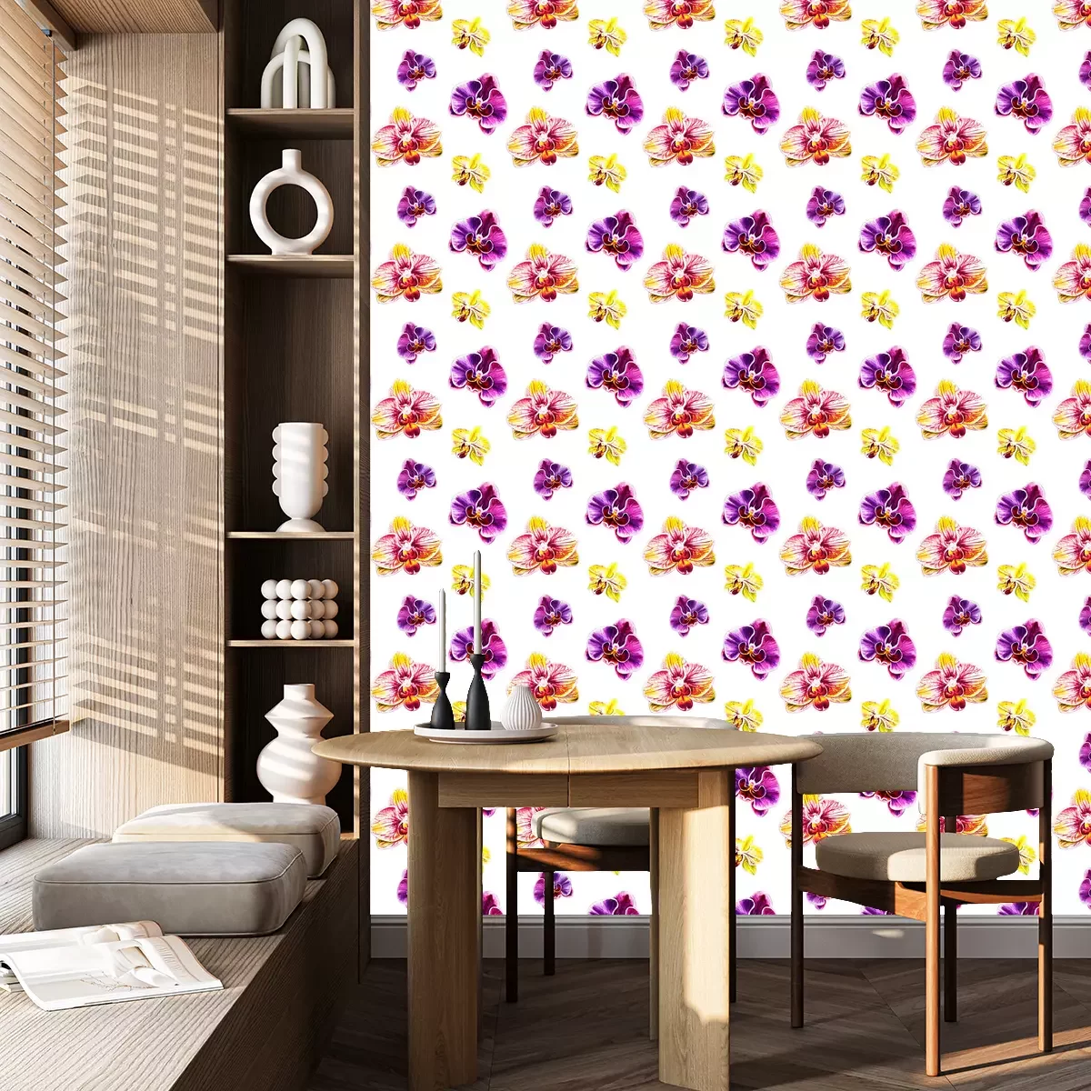 Dit prachtige behang met kleurrijke orchideeënbloemen op een witte achtergrond brengt subtiliteit en harmonie in het interieur. Orchideeënbloemen staan symbool voor luxe en schoonheid, dus passen perfect in de sfeer van een spa of kapsalon. In een spa salon zal dit behang met bloemen een ontspannende en aangename omgeving creëren. Orchideeën worden geassocieerd met rust en evenwicht, wat bijdraagt aan het creëren van een plek waar klanten even kunnen bijkomen van de dagelijkse stress en kunnen ontspannen in een luxe sfeer. Het behang bloemen met orchideeën kan nog verder worden verfraaid, dus overweeg wat toevoegingen. Meubels in lichte, neutrale kleuren - wit, beige of pasteltinten passen goed bij modern behang bloemen, waardoor een rustig en elegant interieur ontstaat. Zachte en tactiele stoffen voor meubels en spreien zullen ook werken, je kunt comfort en een ontspannen sfeer benadrukken. Gedempte verlichting met warm licht helpt om een gezellige sfeer te creëren. Lantaarns, kandelaars of hanglampen die geschikt zijn voor de spa zullen de inrichting en het behang bloemen perfect aanvullen. Groene potplanten voegen natuurlijke charme toe en verlevendigen het interieur. Kies planten die goed passen bij het bloementhema. Behang bloemen kan verder worden aangevuld met houten accenten, zoals banken, boekenkasten of fotolijstjes, om het interieur een warme en natuurlijke uitstraling te geven. In een kapsalon daarentegen zal dit behang bloemen voor de muur een opvallend element worden dat de aandacht van klanten trekt. Orchideeënbloesems symboliseren schoonheid en elegantie, wat perfect past bij de schoonheidsindustrie. Bijpassend bij de accessoires in zo'n interieur kun je grote spiegels in sierlijke lijsten overwegen om klanten te helpen het effect van hun kapsel en make-up te beoordelen en om elegantie aan de salon toe te voegen. Comfortabele meubels, zoals exclusieve fauteuils en poefs, zorgen ervoor dat klanten comfortabel zitten en zich luxueus voelen terwijl ze wachten op hun diensten. Je kunt bijvoorbeeld kiezen voor een verende bank in levendig fuchsia of neon oranje fauteuils. Behang bloemen met orchideeën voegt zeker karakter toe aan een spa of kapsalon en creëert een elegante en uitnodigende sfeer die klanten zal aantrekken en ervoor zal zorgen dat ze zich comfortabel en ontspannen voelen.