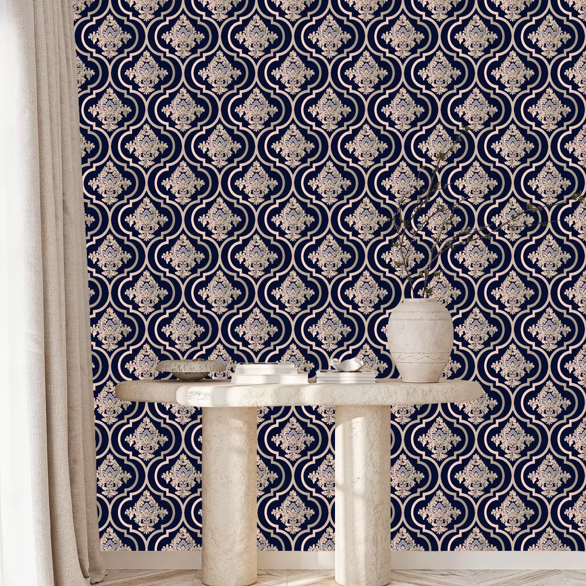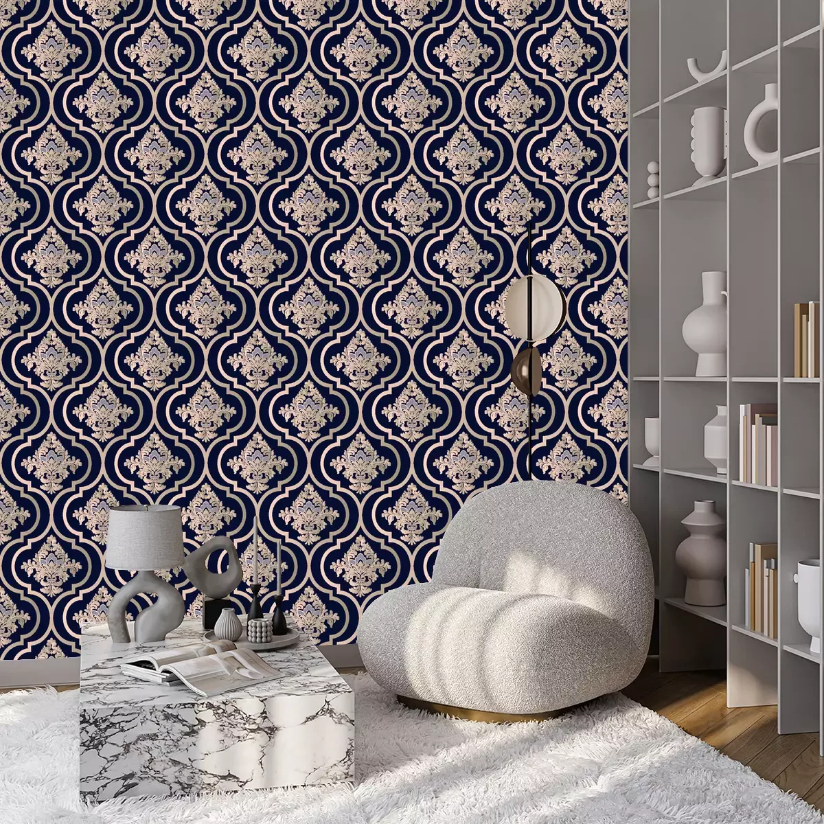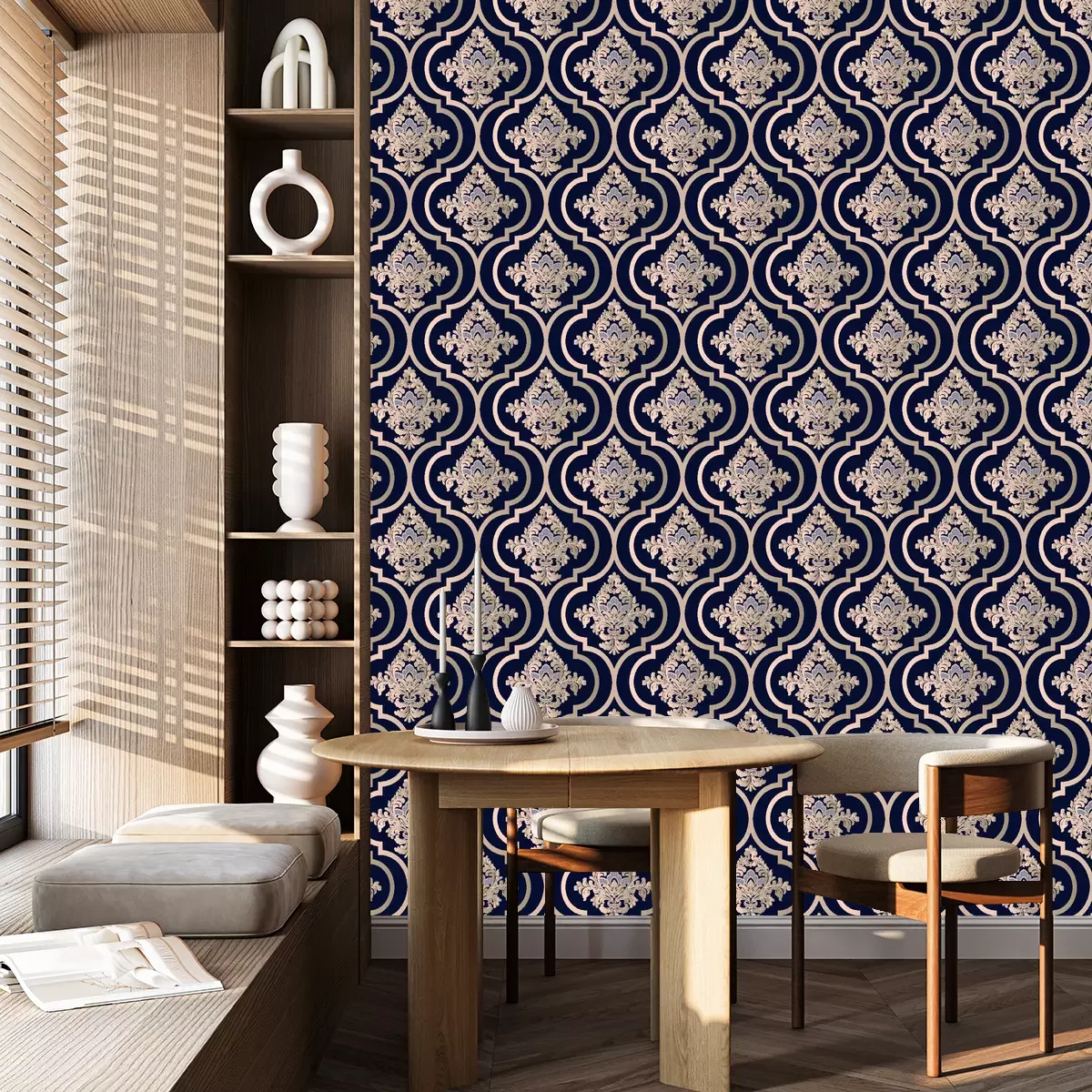 Blauw patroon met gele decoratieve elementen vormt een uitstekende aanvulling op de glamourstijl en is kenmerkend voor het Victoriaanse ontwerp. Dit typische Victoriaanse motief straalt elegantie, tijdloosheid en luxe uit. Bloem- en barok behang met ornamenten creëert een buitengewoon decoratief effect en geeft interieurs een unieke charme. Echter, behang met patronen kan ook in andere stijlen worden toegepast. Bijvoorbeeld, als we een klassiek, elegant interieur willen creëren, zal zo'n patroon behang met een blauwe toevoeging uitstekend passen bij de renaissancestijl. In dit geval is het goed om het te combineren met donker hout, marmer en gouden accenten om de verfijnde schoonheid van het patroon te benadrukken. Interieurs in art-decostijl zijn ook een uitstekende plek voor zo'n behang met patronen. De ornamenten passen perfect bij geometrie en elegante vormen. Gouden of zilveren accessoires, glazen lampen en spiegels zullen het kenmerkende patroon behang perfect benadrukken. Een ornament in een meer moderne en minimalistische ruimte is ook een recept voor een succesvolle inrichting. Blauwe decoratie met gele elementen kan worden gebruikt als accent, waardoor een vleugje luxe en elegantie aan de ruimte wordt toegevoegd. Hier is het de moeite waard om aandacht te besteden aan contrast en kleurbalans. Accessoires in neutrale tinten, zoals wit, grijs of zwart, zullen een uitstekende aanvulling zijn op dit patroonbehang. Ornamenten op de muur kunnen worden gecombineerd met gouden of bronzen lijsten van schilderijen en spiegels, met hoogwaardige stoffen voor kussens en gordijnen, en met klassieke meubels in donkere houttinten. Porseleinen vazen met gele bloemen kunnen een prachtig accent zijn dat het bloemmotief van de muurdecoratie benadrukt. Interieurs waarin we patroon behang gebruiken, blauw met gele decoratieve elementen, krijgen elegantie, klasse en tijdloze charme. Ongeacht of we kiezen voor glamour, renaissance, art deco of een meer moderne stijl, dit patroonbehang zal zeker een uniek en luxueus karakter toevoegen aan onze interieurs.