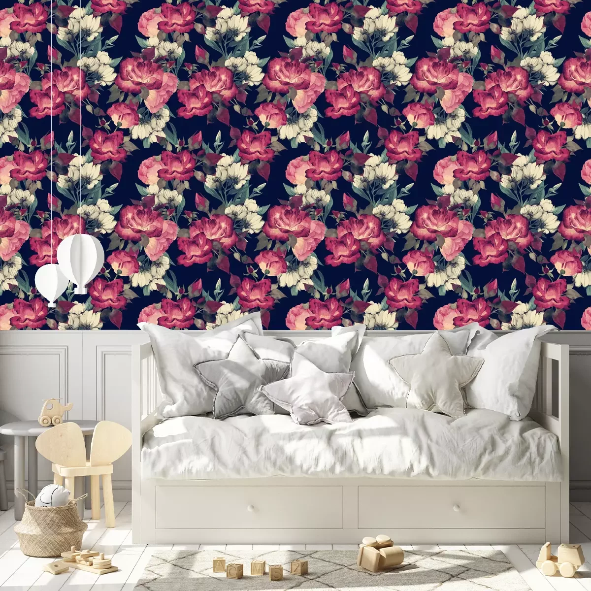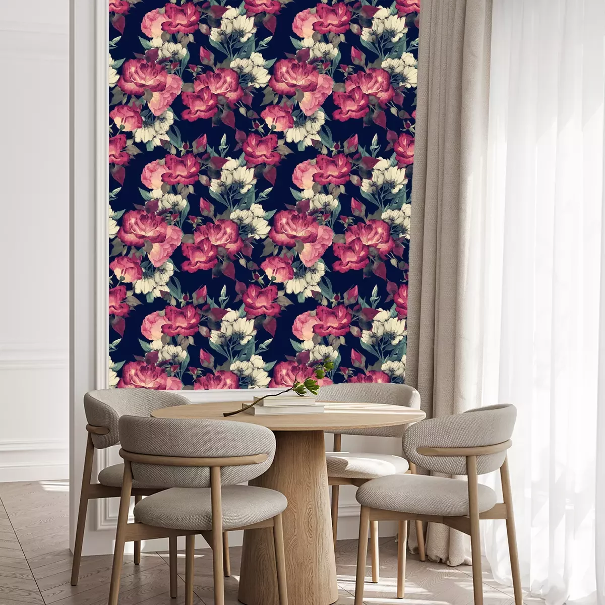 Een boeket bloemen in pastelkleurenDit prachtige bloemenbehang met een aquarelpatroon is een perfecte combinatie van schoonheid en elegantie. Het belangrijkste motief zijn rozen - zowel wit als rood - die zich presenteren op een achtergrond van diepe, donkere kleur. Door het gebruik van aquareltechniek krijgen de bloemen op dit behang een delicate en authentieke uitstraling, alsof ze net zijn geschilderd door een getalenteerde kunstenaar. De voordelen ervan zijn talrijk en het is moeilijk om onverschillig te blijven bij zo'n behang. Bloemen brengen dankzij hun unieke ontwerp een sfeer van romantiek en subtiliteit in de ruimte. Rozen symboliseren liefde, tederheid en schoonheid, en hun aanwezigheid op de muren maakt de ruimte charmant en aangenaam. Ontdek nu hoe veelzijdig en universeel bloemen kunnen zijn. Bloemen behang past perfect bij verschillende soorten interieurs. Ze kunnen worden gebruikt in slaapkamers, waar ze een romantische sfeer zullen creëren en een vleugje luxe zullen toevoegen. Ze zullen ook geweldig staan in de woonkamer, waar ze het middelpunt van decoratie zullen worden, de aandacht zullen trekken en het interieur een bijzonder karakter zullen geven. Rozenbehangkan worden gebruikt in gangen, hotellobby's of kantoren, waardoor deze ruimtes een elegante en verfijnde uitstraling krijgen. Qua stijlen bieden bloemen talloze mogelijkheden om te combineren. Hun zachtheid en romantische karakter passen perfect bij de vintage stijl, die geïnspireerd is op het verleden en vol is van delicate details. Moderne bloemenbehang kan ook uitstekend moderne interieurs aanvullen, ze subtiliteit en harmonie geven. Bovendien, dankzij hun elegantie, zullen ze een perfecte aanvulling zijn op de glamoureuze stijl, die gekenmerkt wordt door pracht en luxe. Behang met bloemen op een donkere achtergrond is een buitengewoon mooie en elegante decoratie die romantiek en charme aan de kamer toevoegt. Of je nu een romantische slaapkamer, een elegante woonkamer of een verfijnde hal wilt creëren, dit rozen behang zal zeker aan je verwachtingen voldoen en het interieur een unieke uitstraling geven.