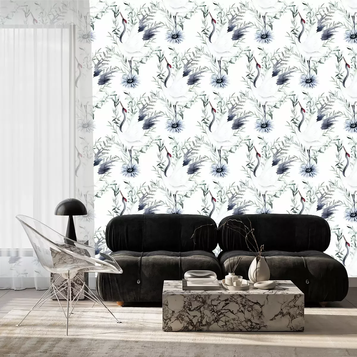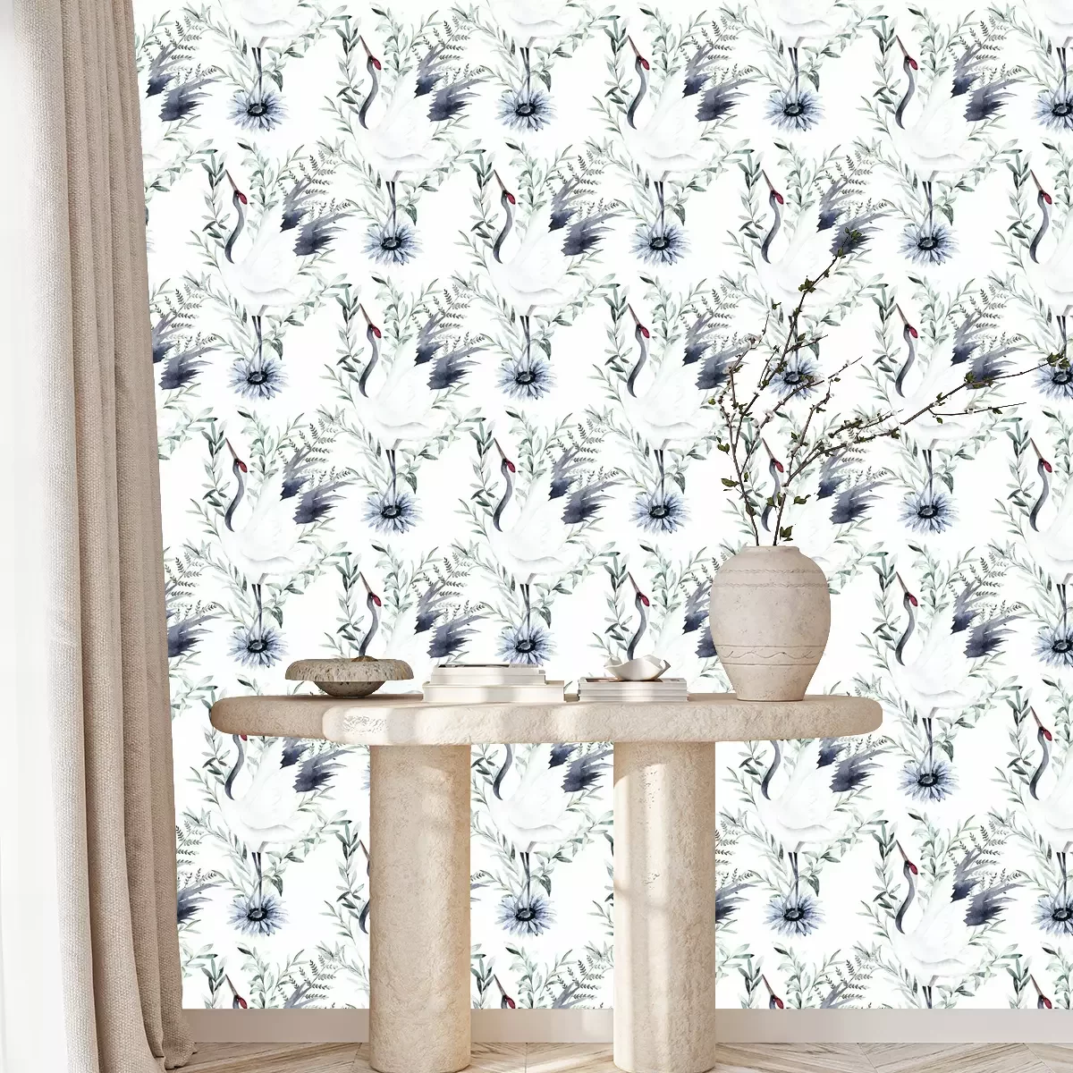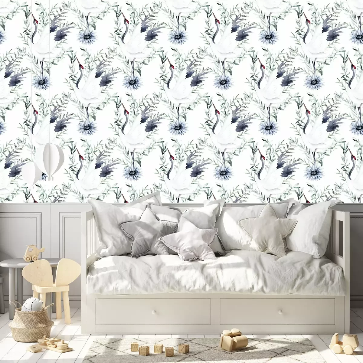 Dit patroon is een waar meesterwerk dat een unieke en harmonieuze sfeer in je interieur zal brengen. Het kraanvogel behang vormt een perfecte achtergrond voor een compositie die draait om zachte, lichtblauwe tinten en natuurlijke vegetatie. Je zult je voelen alsof je in een tuin vol rust en kalmte bent. Het belangrijkste element van dit behang zijn de subtiele bloemen, die frisheid en tederheid uitstralen. De lichtblauwe kleur van de bloemen voegt een unieke charme toe en roept associaties op met een heldere hemel en rust. Als je een ruimte wilt creëren gebaseerd op ontspanning, is dit behang met kraanvogels een goede keuze. De kraanvogel in dit patroon is een perfecte aanvulling en de bloemen trekken de aandacht, waardoor ze een opvallend middelpunt op de muur vormen, dat meteen de aandacht trekt en karakter aan het interieur toevoegt. Het Japanse behang bevat ook eucalyptustakken, die het een beetje natuurlijk en organisch gevoel geven. Deze takken symboliseren frisheid en leven en brengen tegelijkertijd een vleugje natuur in de kamer. Het Japanse behang kan ook een positief effect hebben op ons welzijn en gezondheid, door een sfeer van ontspanning en rust te creëren. In dit prachtige landschap van planten is ook een witte kraanvogel te vinden. Deze elegante vogel is een symbool van geluk, wijsheid en een lang leven in de Japanse cultuur. De aanwezigheid van een kraanvogel op het behang japans brengt positieve energie met zich mee en voegt gevoel van balans aan het interieur toe. De stijl van dit behang is Japans met waterverf elementen. Het is meteen te zien dat het met de hand is getekend, wat het een unieke charme en authenticiteit geeft. Handgeschilderde details en subtiele kleuren geven het Japanse behang diepte en een bijzonder karakter. Het is een waar meesterwerk dat uniciteit en individualiteit aan je interieur zal toevoegen. De voordelen van behang op de muur zijn onschatbaar. Behang kraanvogels zal je interieur een uniek karakter en bijzonderheid geven. Het kraanvogel behang is in staat zelfs de eenvoudigste ruimte te veranderen tot een plek vol stijl en elegantie. Het zal een sfeer van harmonie, rust en ontspanning in je interieur brengen. Het kraanvogel behang met een witte achtergrond en natuurlijke elementen is uiterst veelzijdig. Het past zowel in moderne, minimalistische interieurs, waar het zachtheid en subtiliteit toevoegt, als in klassieke, elegante inrichtingen, waar het een sfeer van romantiek en verfijning creëert. Het dient als een perfecte achtergrond voor meubels en decoraties, waardoor ze kunnen opvallen en hun schoonheid kunnen benadrukken. Japanse behang is een uitstekende keuze voor degenen die een interieur willen dat vol is van bijzonderheid en schoonheid.
