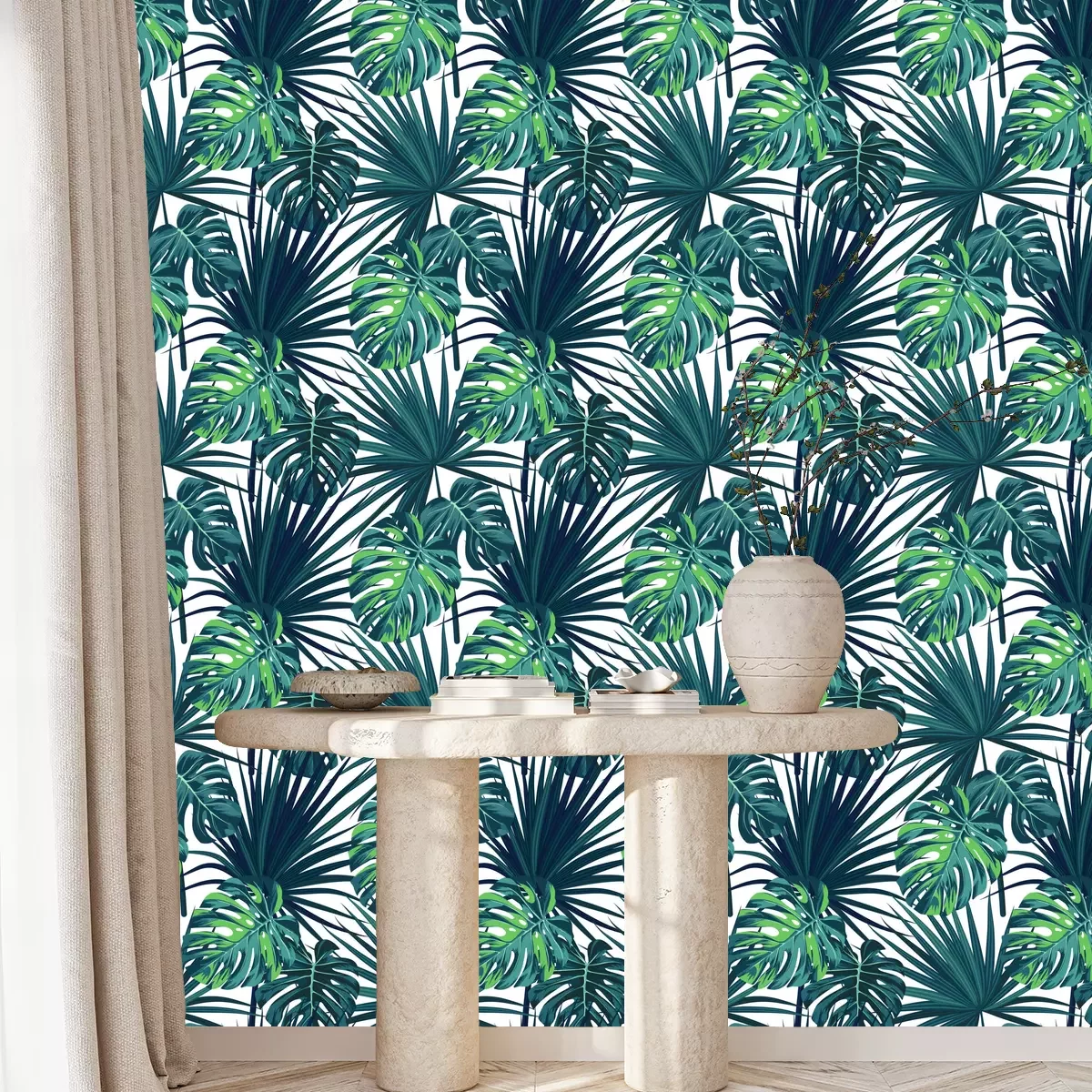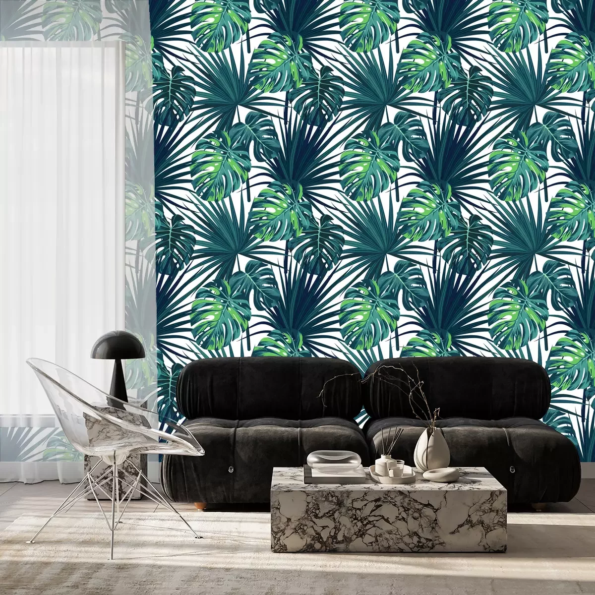Blauw patroon met jungle plantenFotobehang