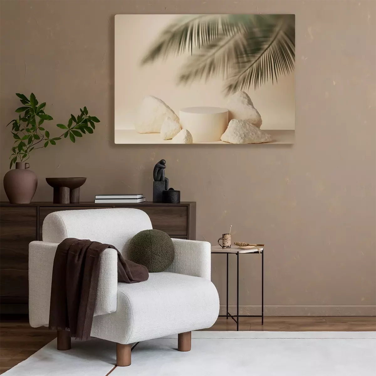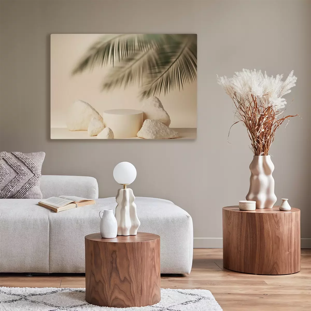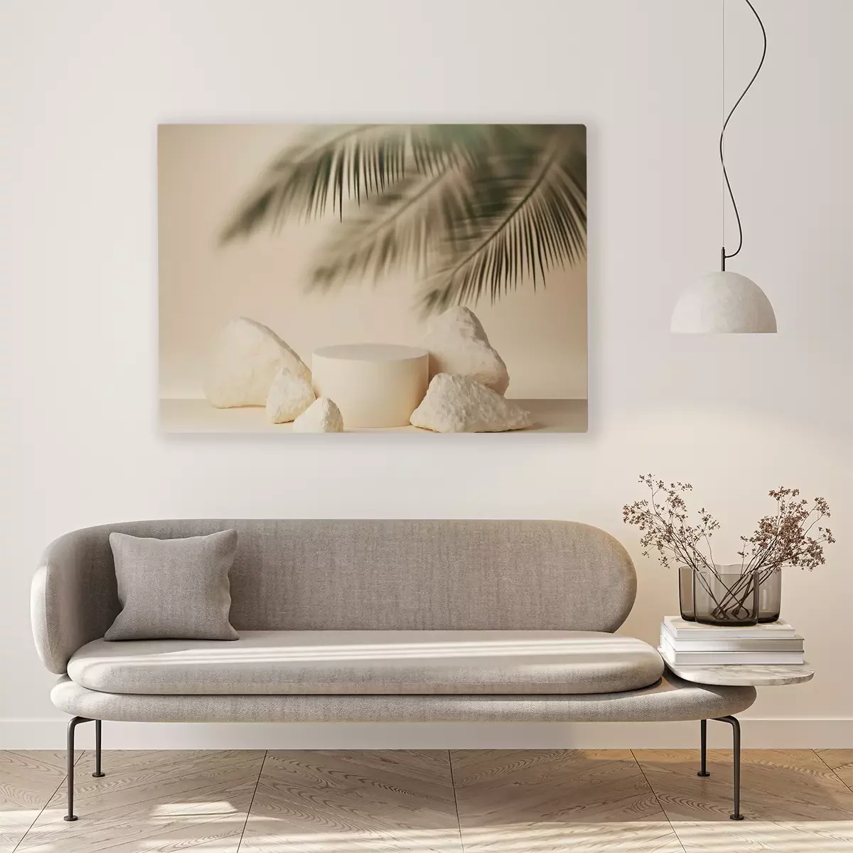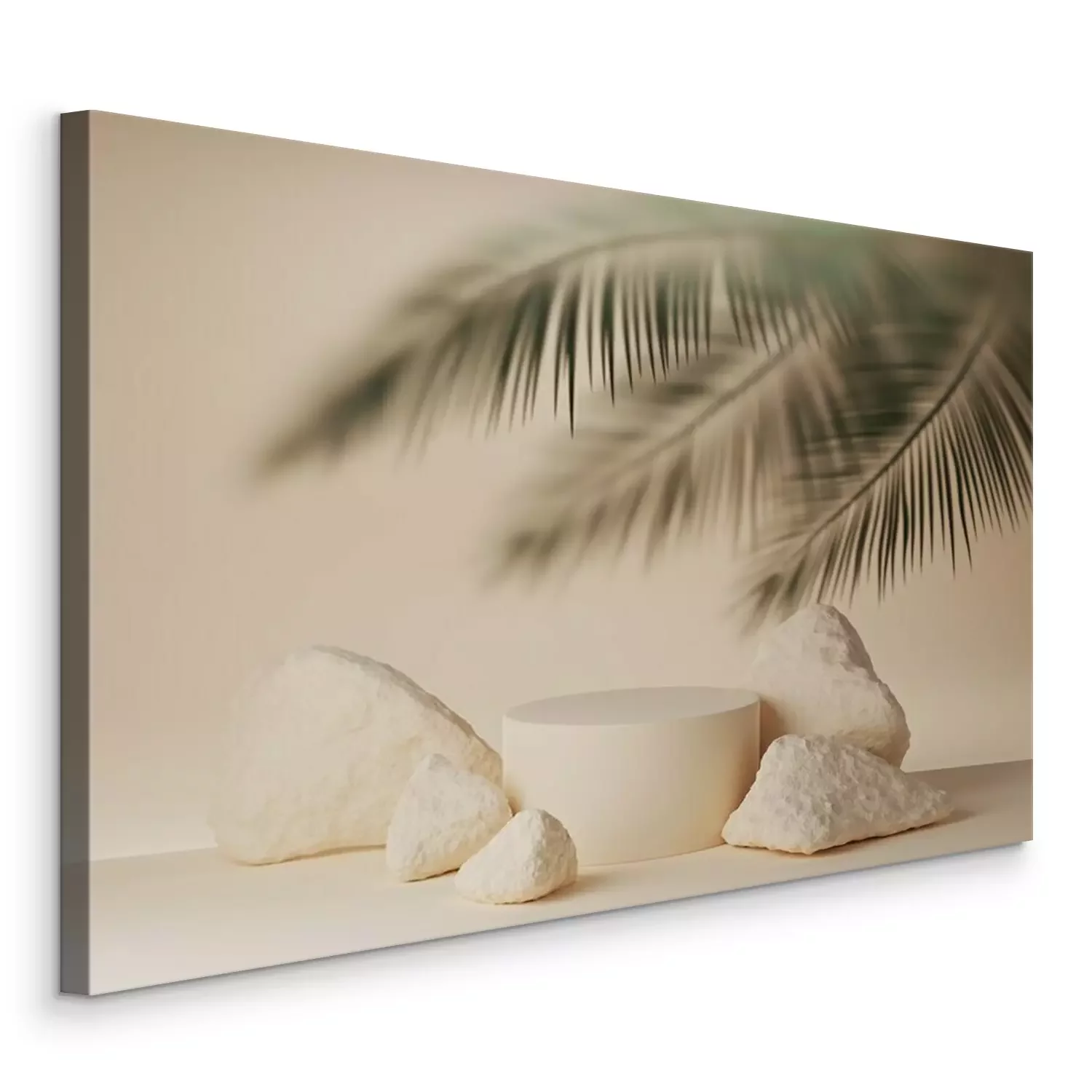 Canvas: 3D beige podium display with palm leaf behind frosted glass. Summer pastel background with stones and cylinder pedestal for product promotion. Beauty holiday mockup. 3D render trendy banner template