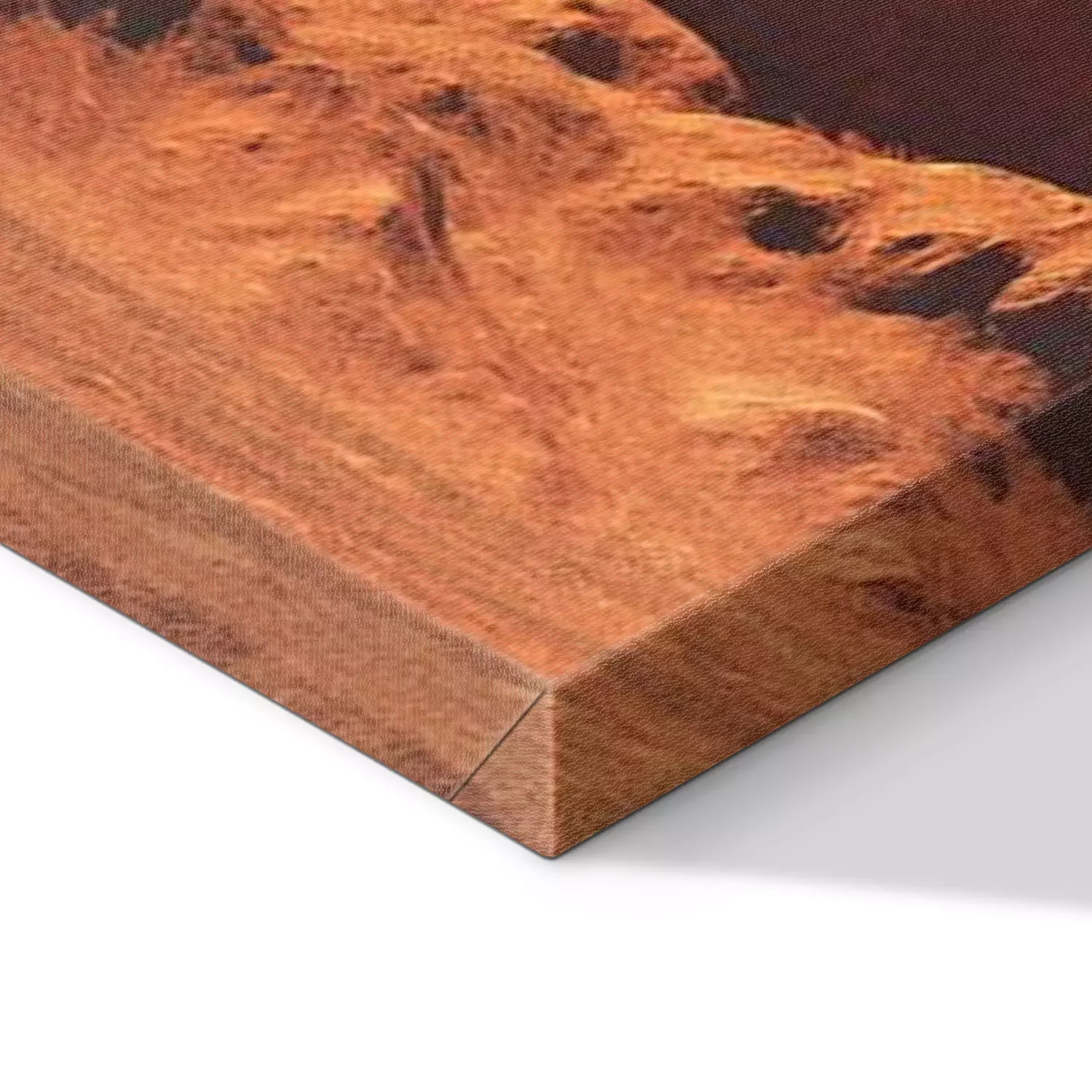 De print wordt aangebracht op hoogwaardig canvas dat op een schildersweefgetouw (spieraam) wordt gespannen. Omdat de print de zijranden bedekt, hoeft het ontwerp niet met een extra kader te worden omlijst. Wij raden ook composities aan die uit meerdere foto's bestaan en zo een coherente compositie vormen.