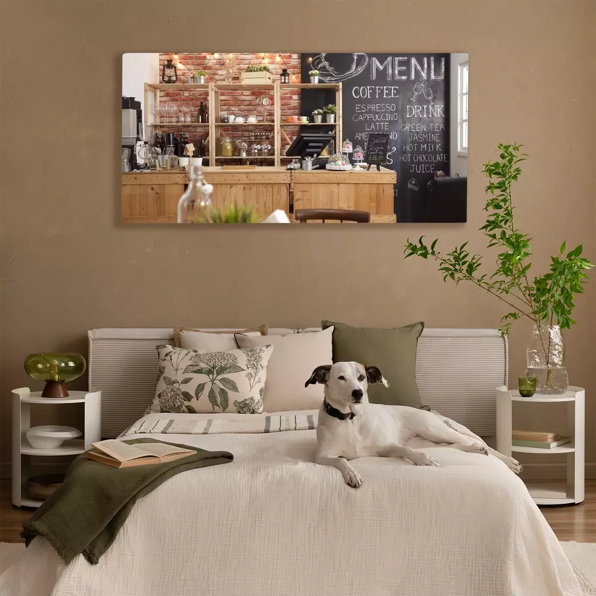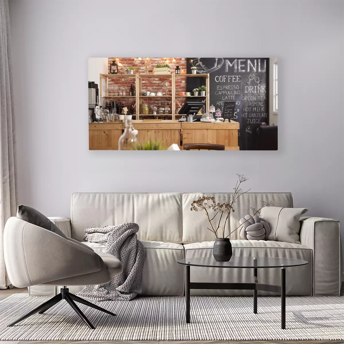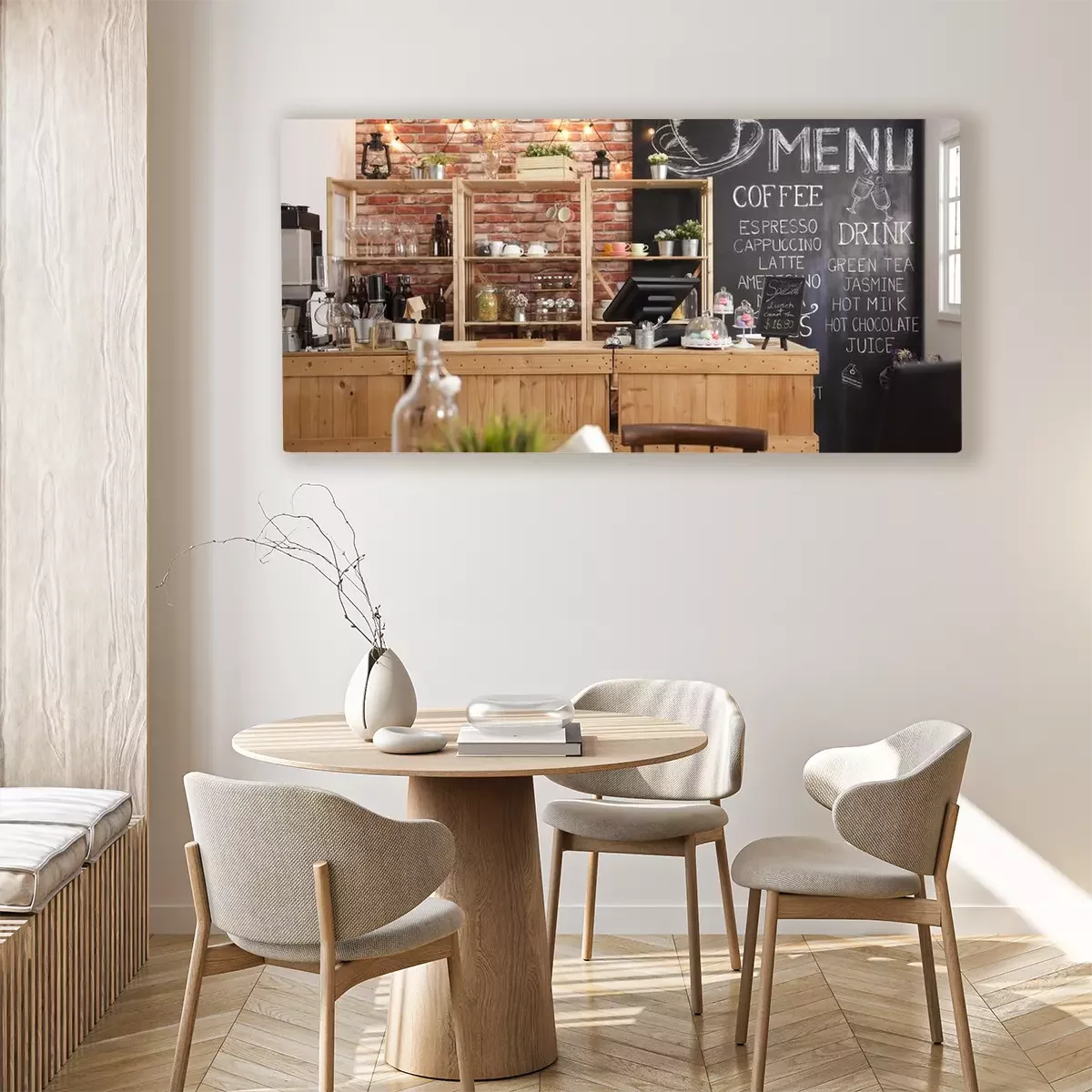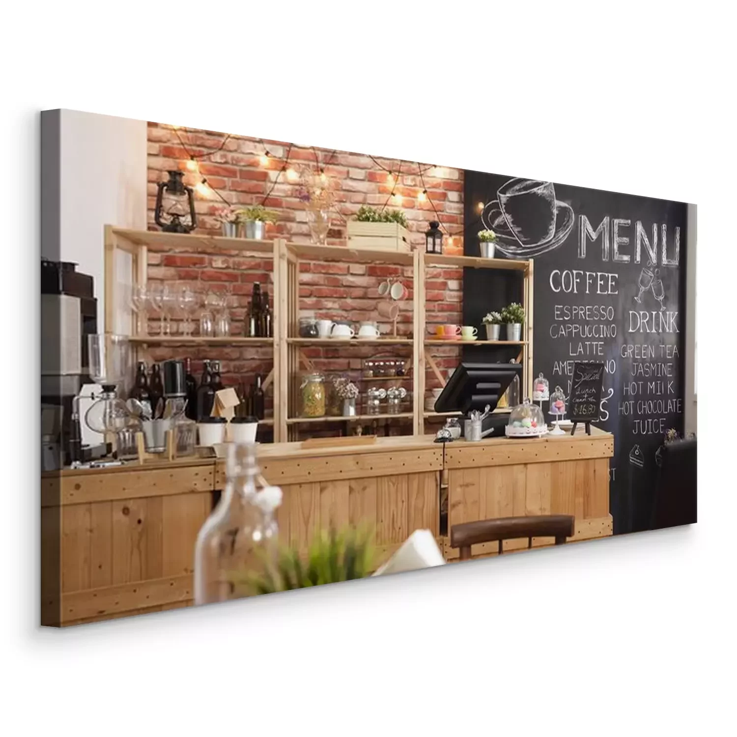 Canvas: 3d render of cafe bar restaurant nobody indoor. Empty coffee shop interior daytime with wooden design counter red brick wall in background. menu writing on blackboard with beautiful letters and cup.
