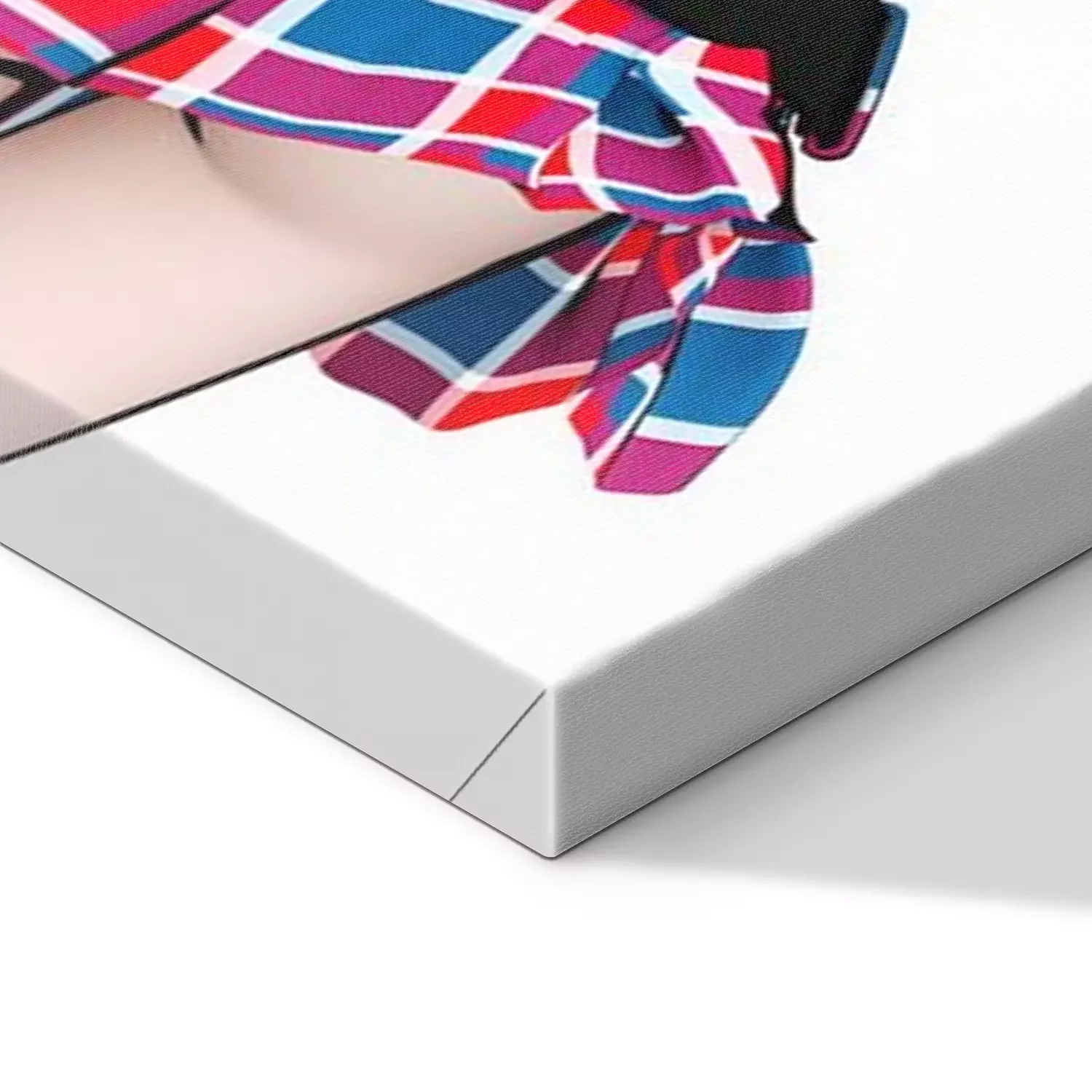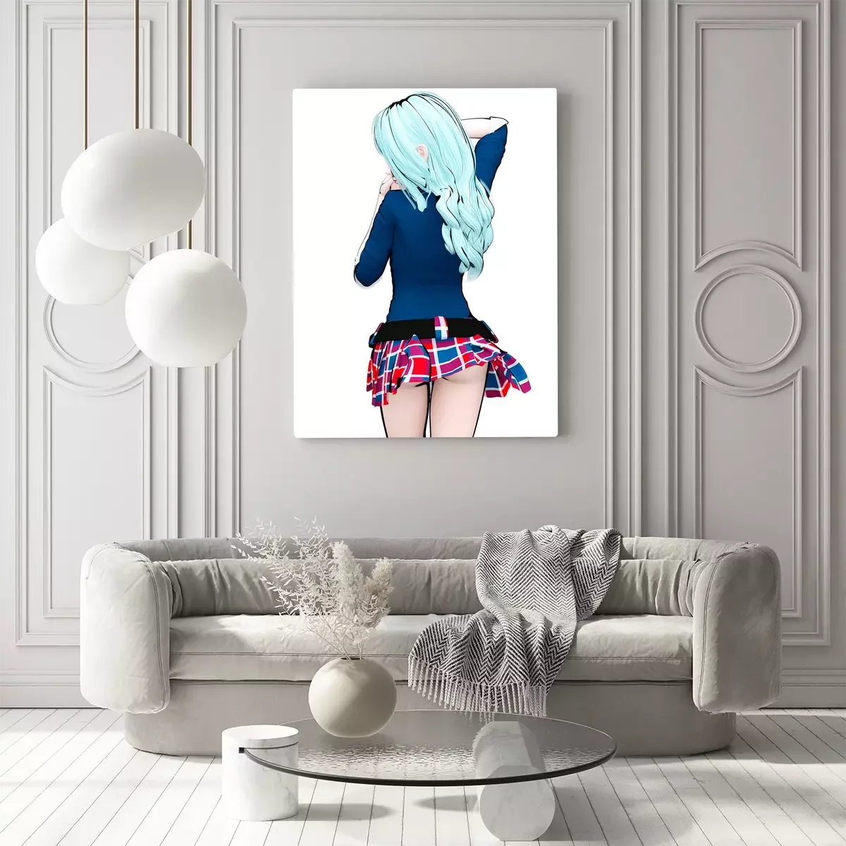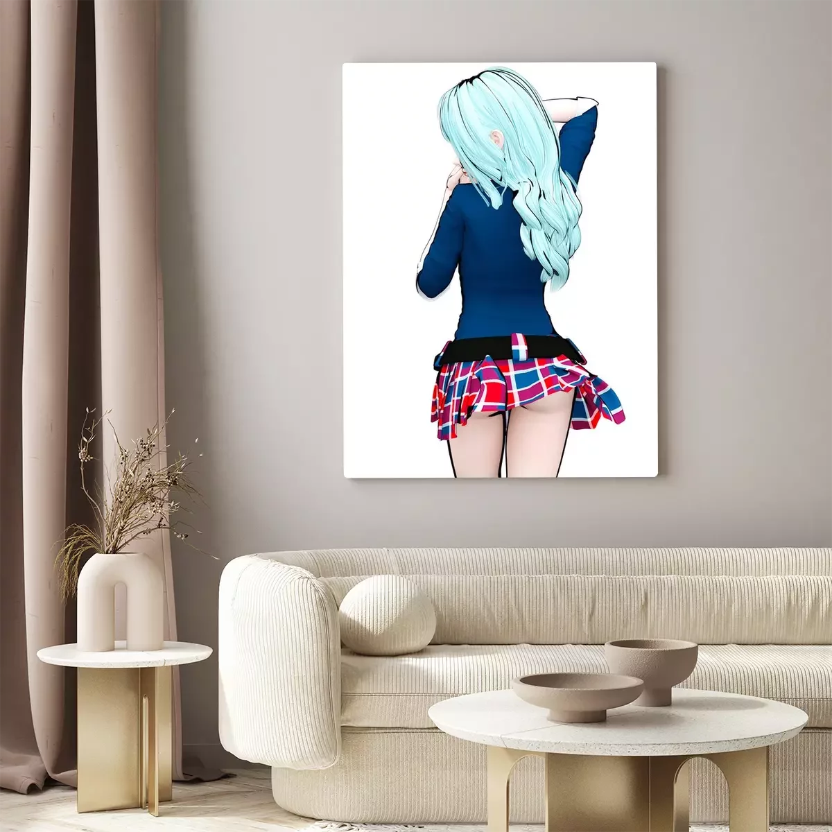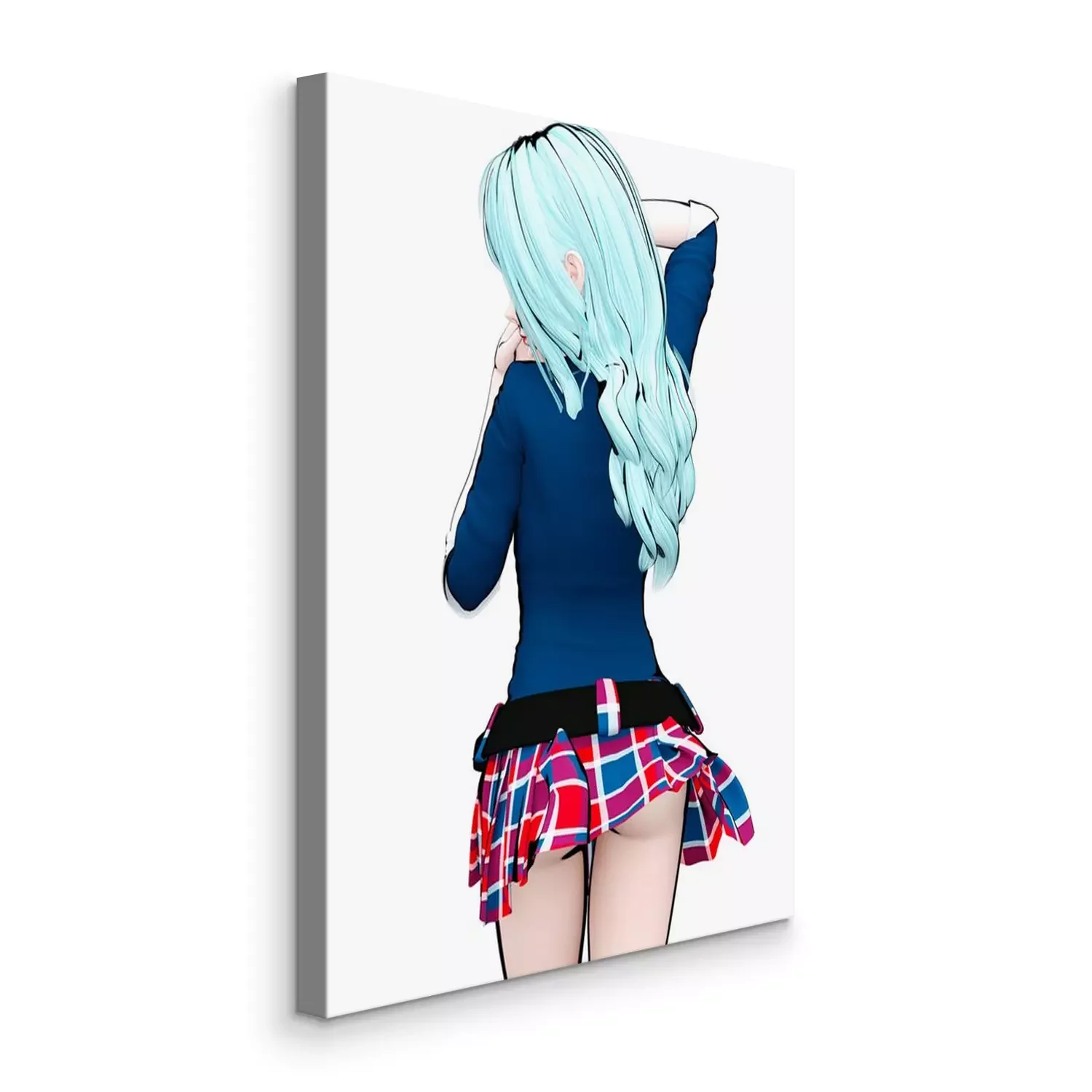 Canvas 3D sexy anime pop Japanse anime schoolmeisje grote blauwe ogen en lichte make-up. Rok kooi. Cartoon, strips, schets, tekening, manga illustratie. Conceptuele mode kunst. Verleidelijke candid pose.