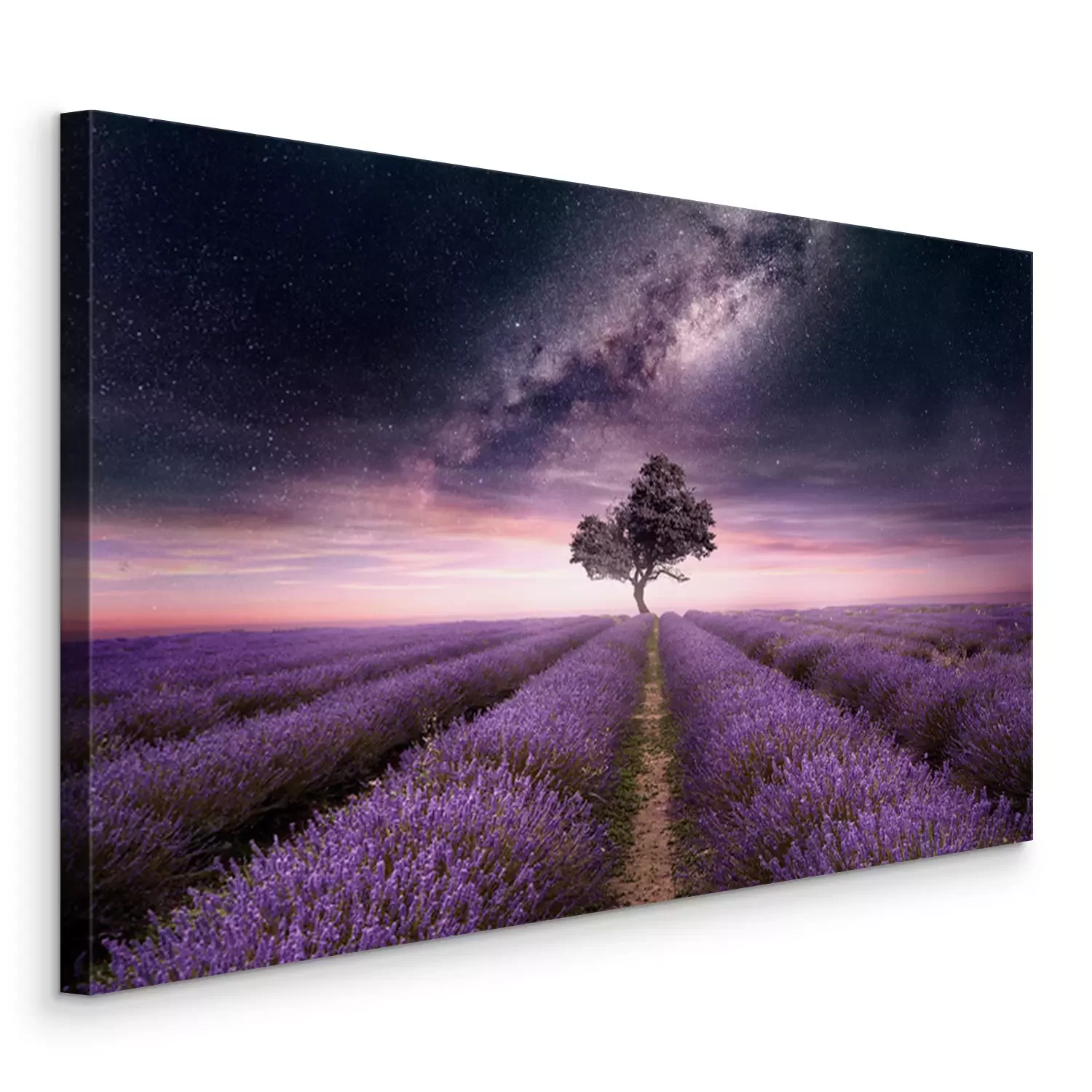 Canvas A lavender field full of purple flowers at night with the night sky filled with stars. Photo composite.