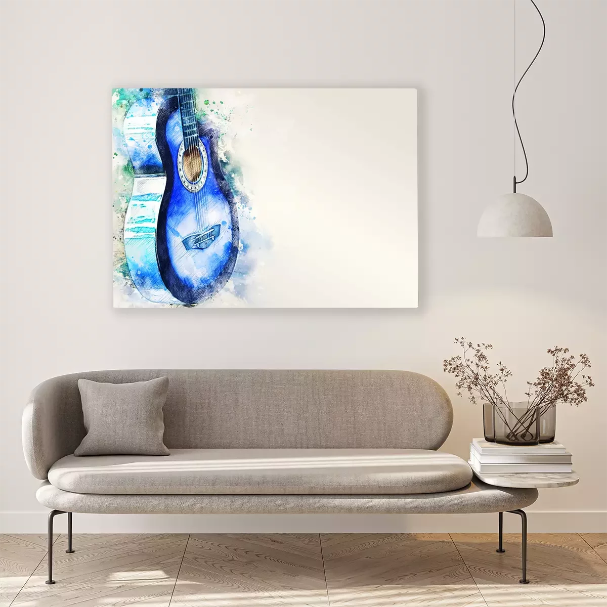 Abstract colorful blue shape on acoustic guitar in the foreground Close up on Watercolor illustration painting background.