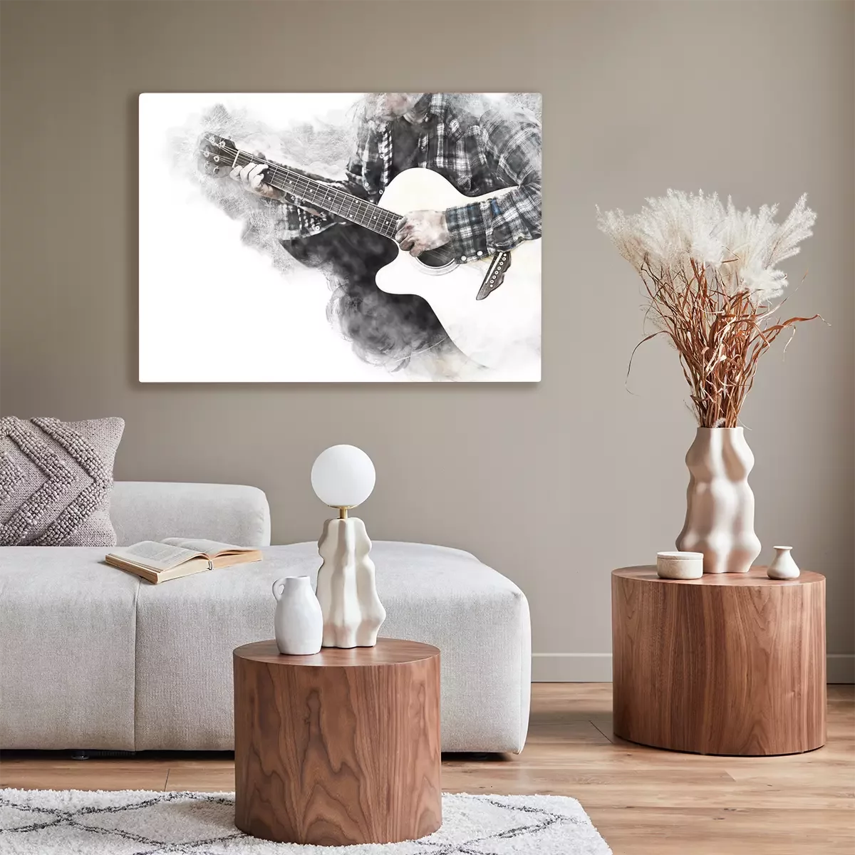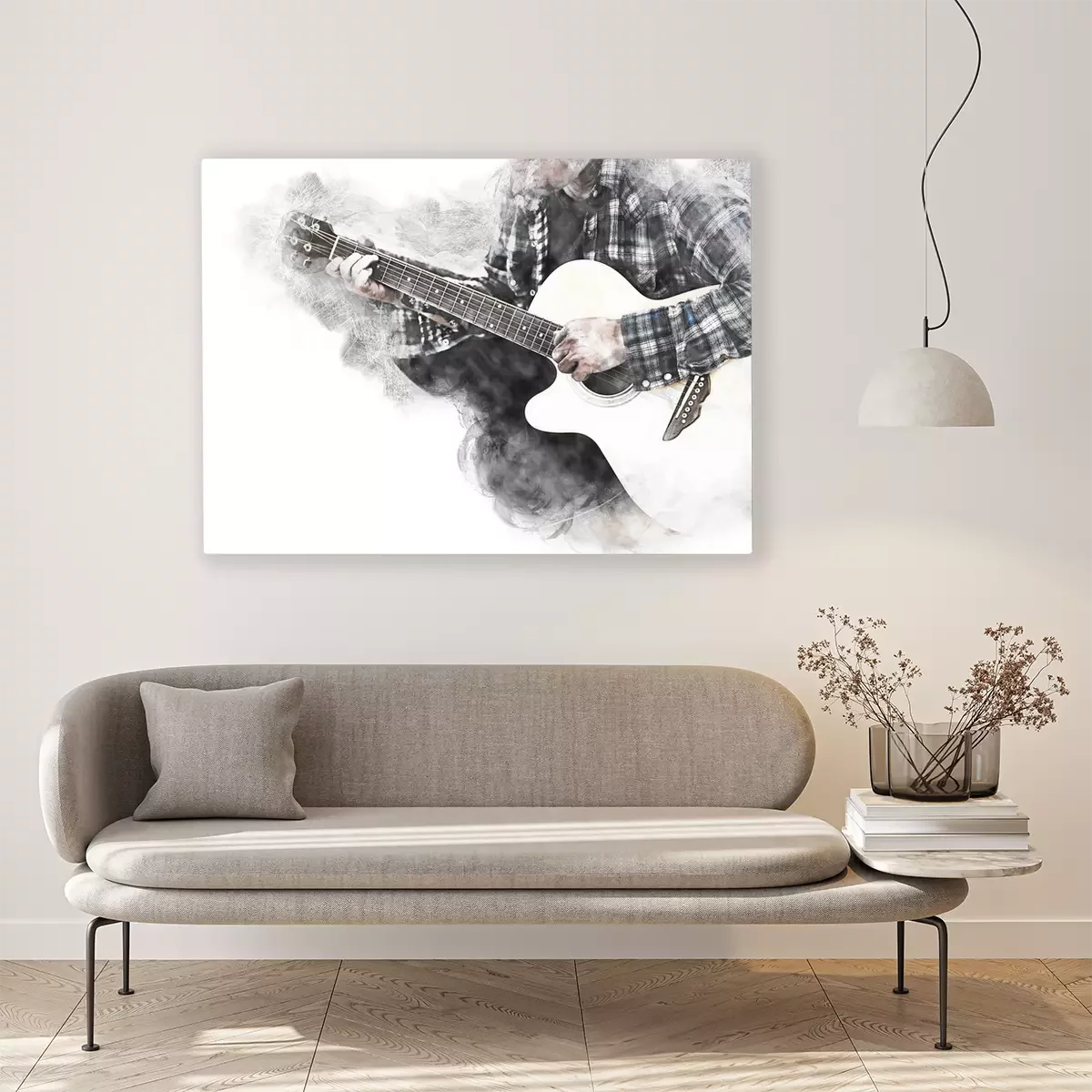 Canvas: Abstract beautiful man guitarist playing acoustic guitar in the foreground on Watercolor painting background and Digital illustration brush to art.