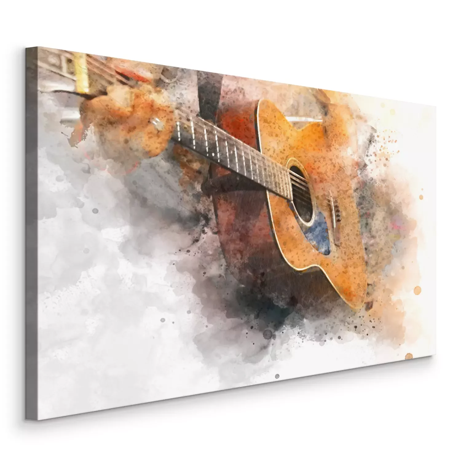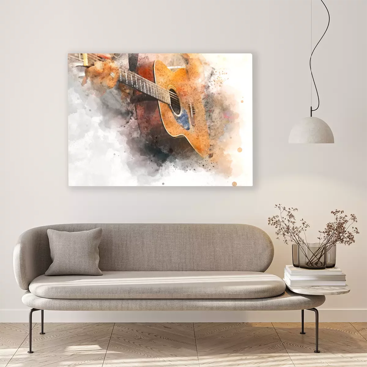 Canvas Abstract colorful shape on acoustic Guitar in the foreground on Watercolor painting background and Digital illustration brush to art.