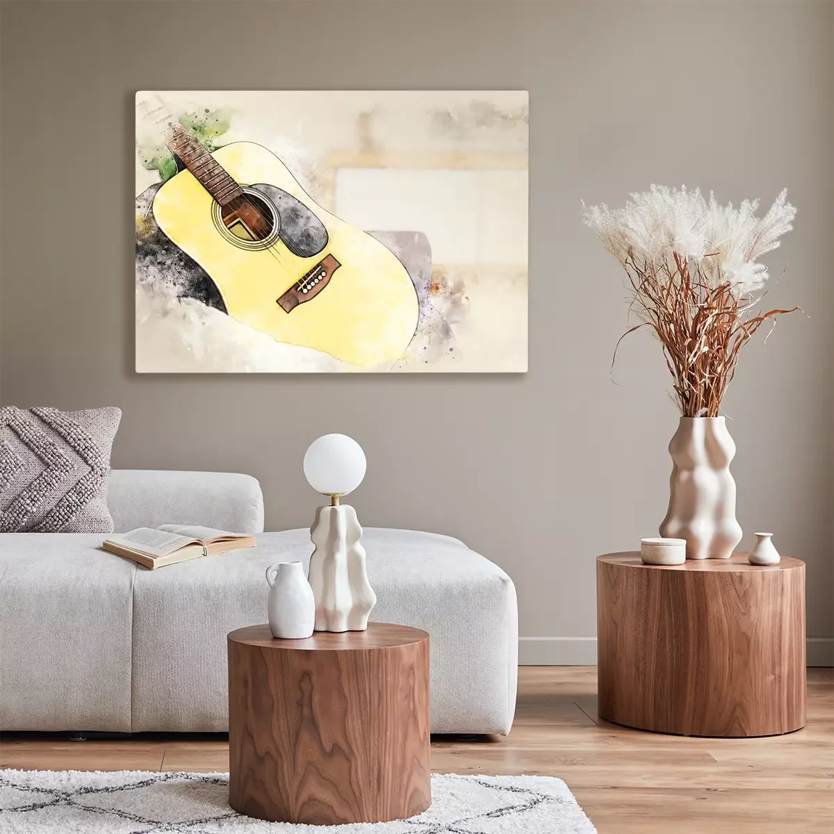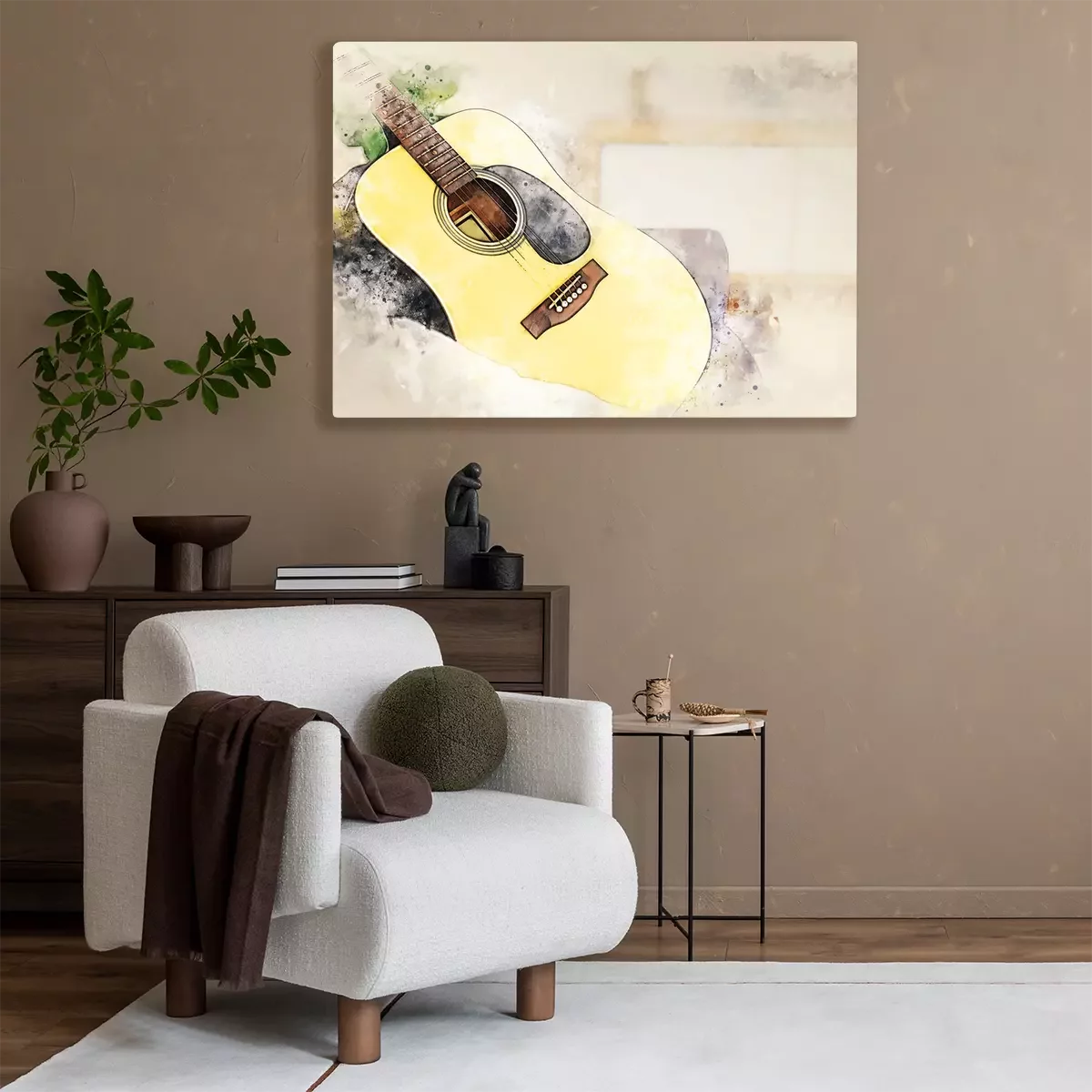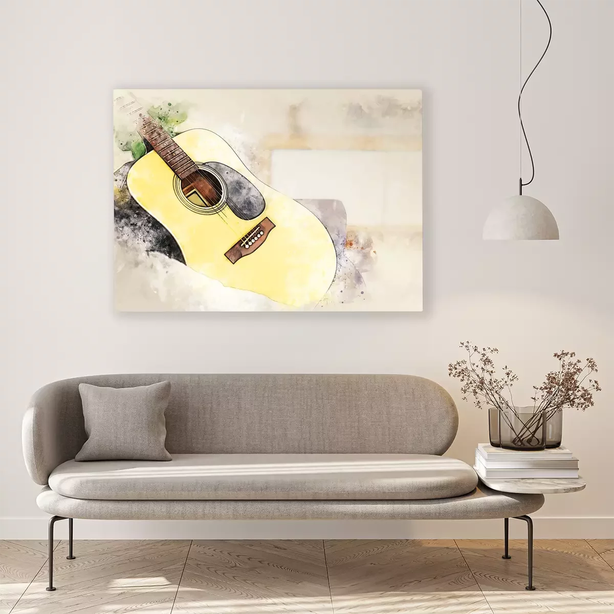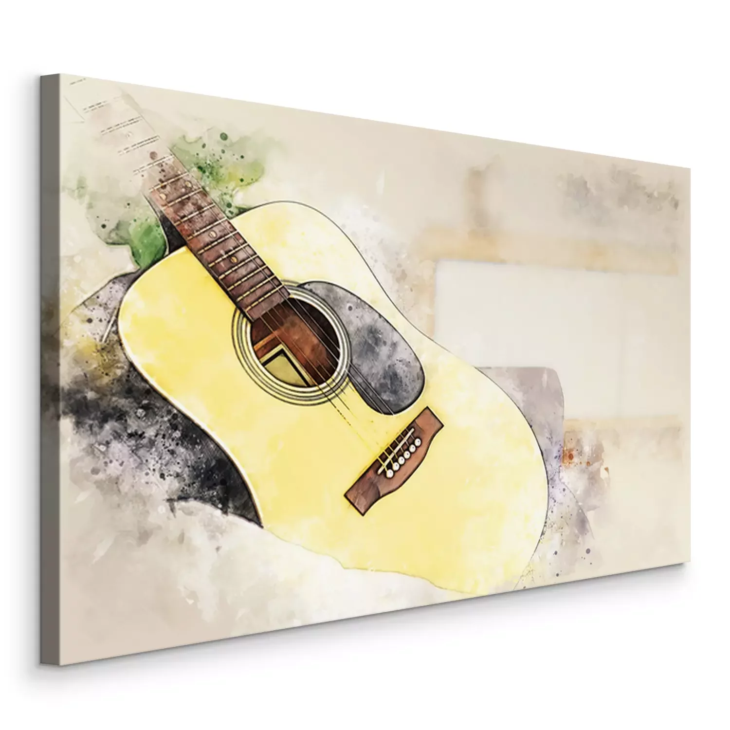 Canvas: Abstract colorful shape on acoustic guitar in the foreground on watercolor painting background and digital illustration brush to art.