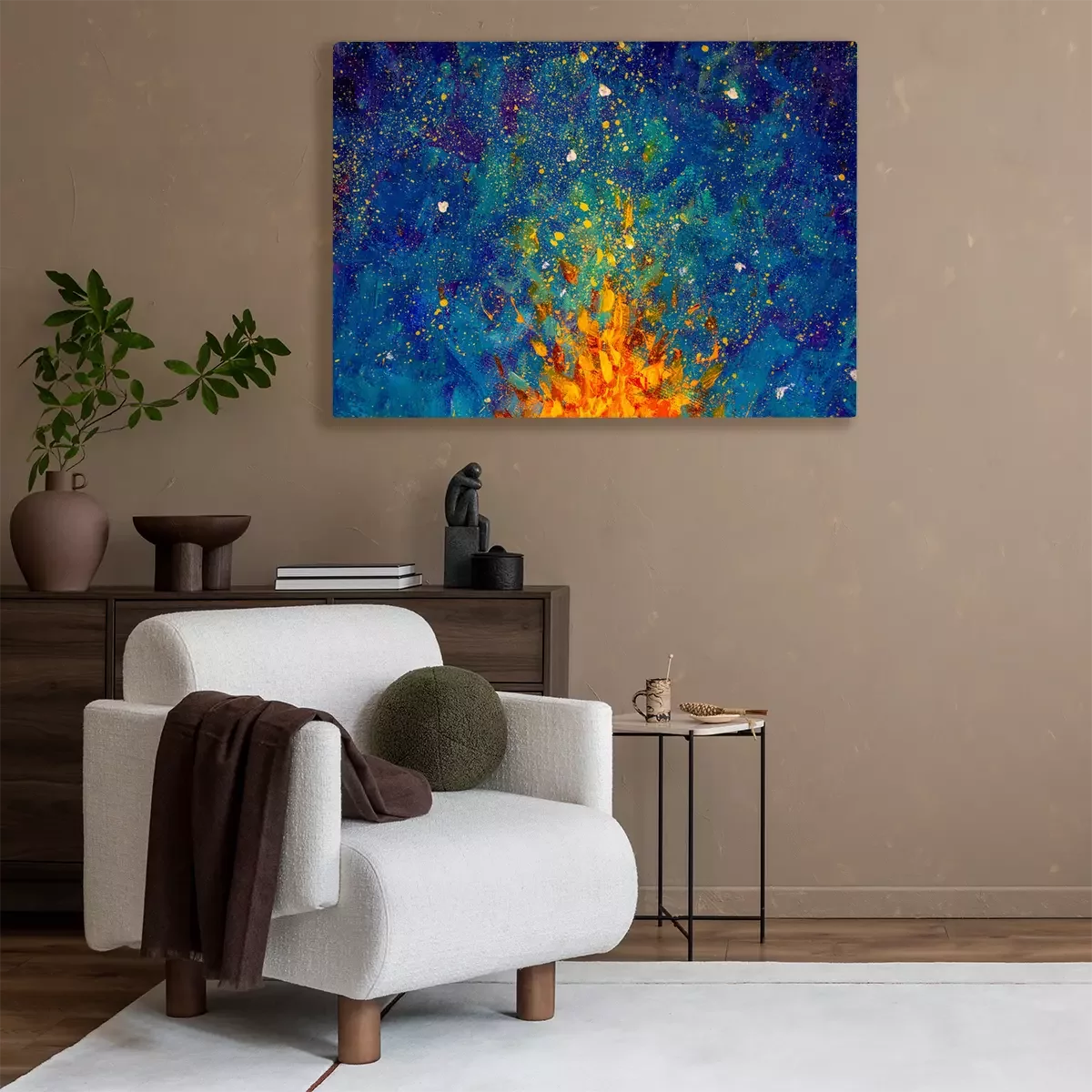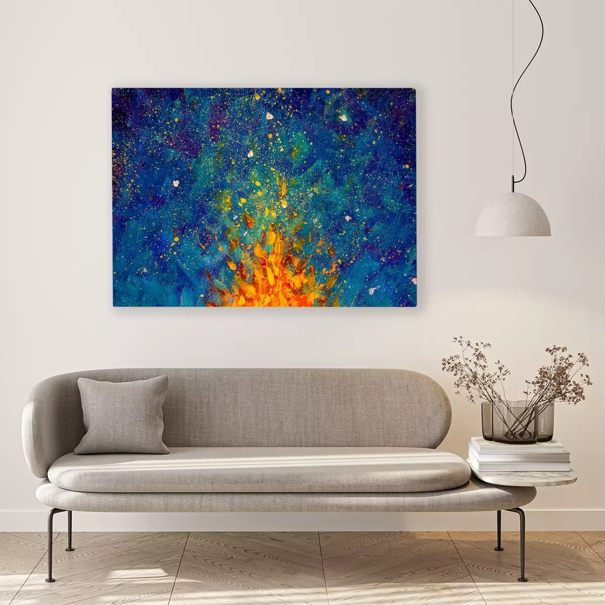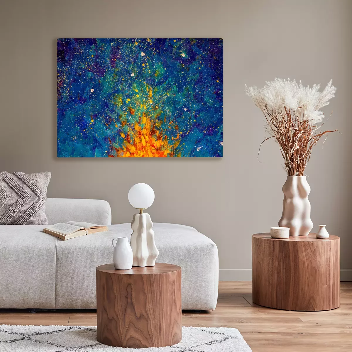 Canvas: Abstract fire oil painting illustration. Flames of a bonfire against Beautiful night starry sky, Blue Cosmos, galaxy, stars. Colorful space background artwor Impressionism.
