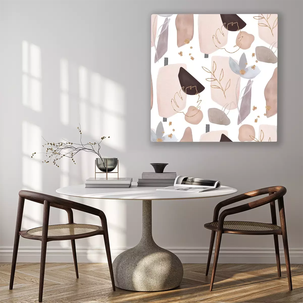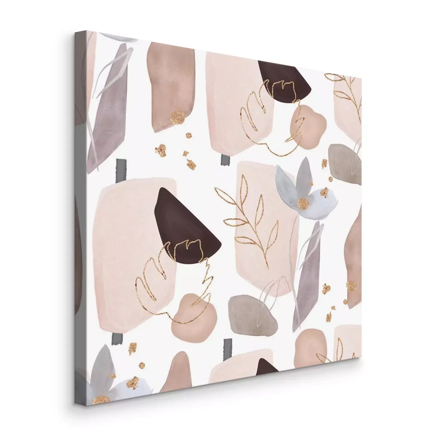 Canvas Abstract nordic print with geometric, gold  shapes, flower and leaves on white background. Watercolor seamless pattern. Hand drawn marble illustration. Mixed media art