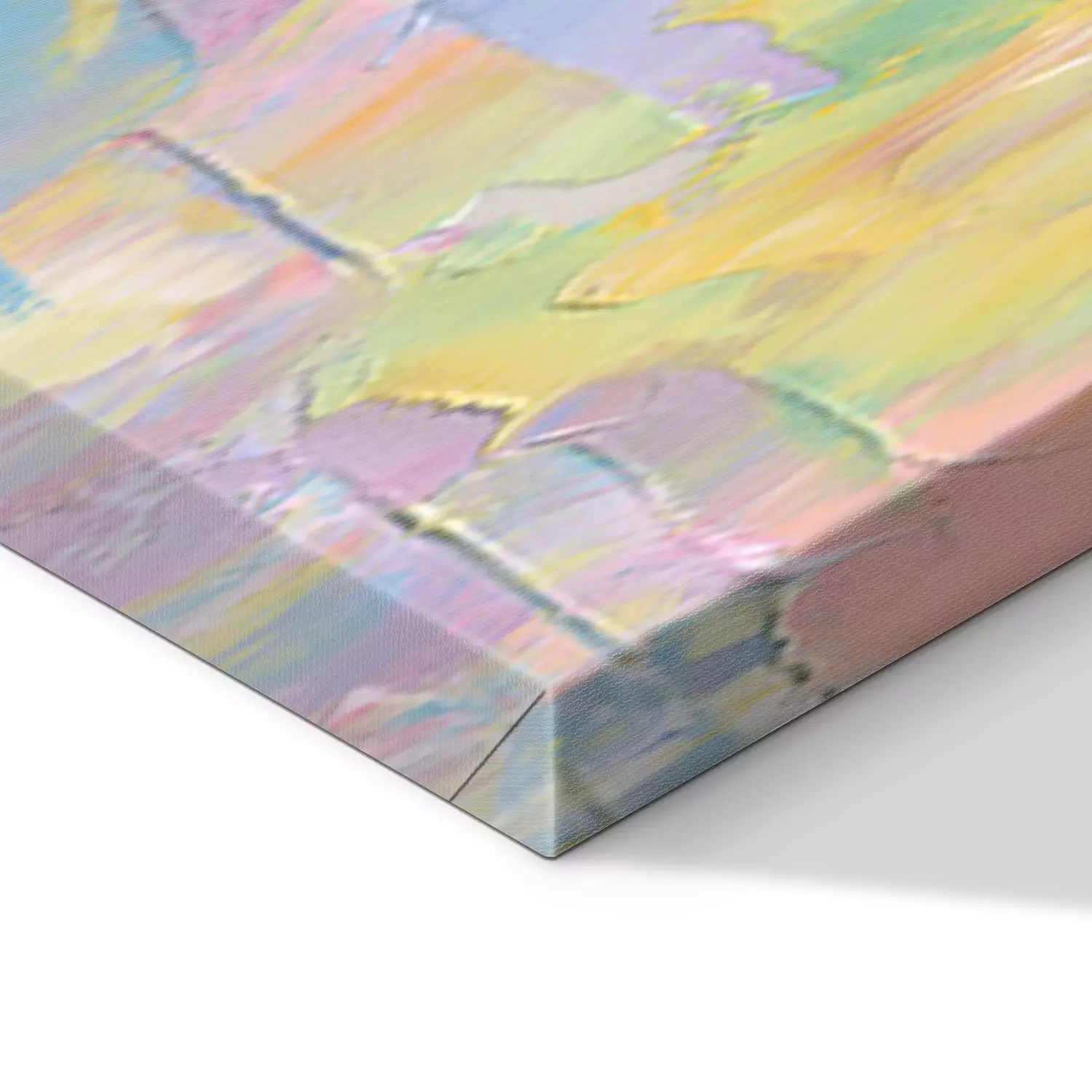 De print wordt aangebracht op hoogwaardig canvas dat op een schildersweefgetouw (spieraam) wordt gespannen. Omdat de print de zijranden bedekt, hoeft het ontwerp niet met een extra kader te worden omlijst. Wij raden ook composities aan die uit meerdere foto's bestaan en zo een coherente compositie vormen.