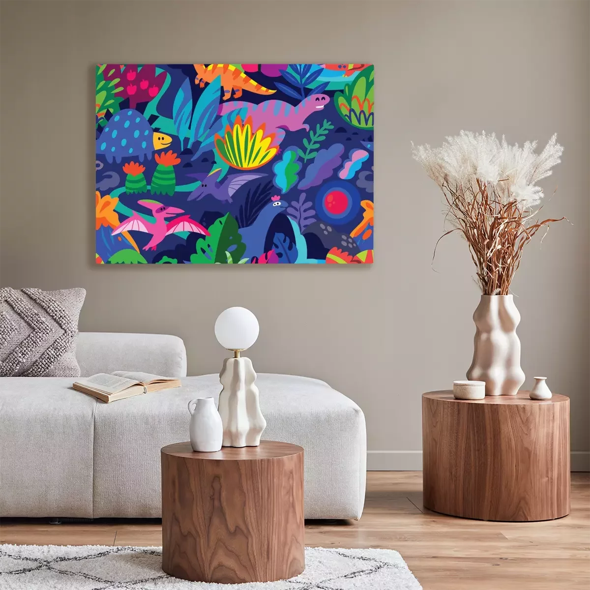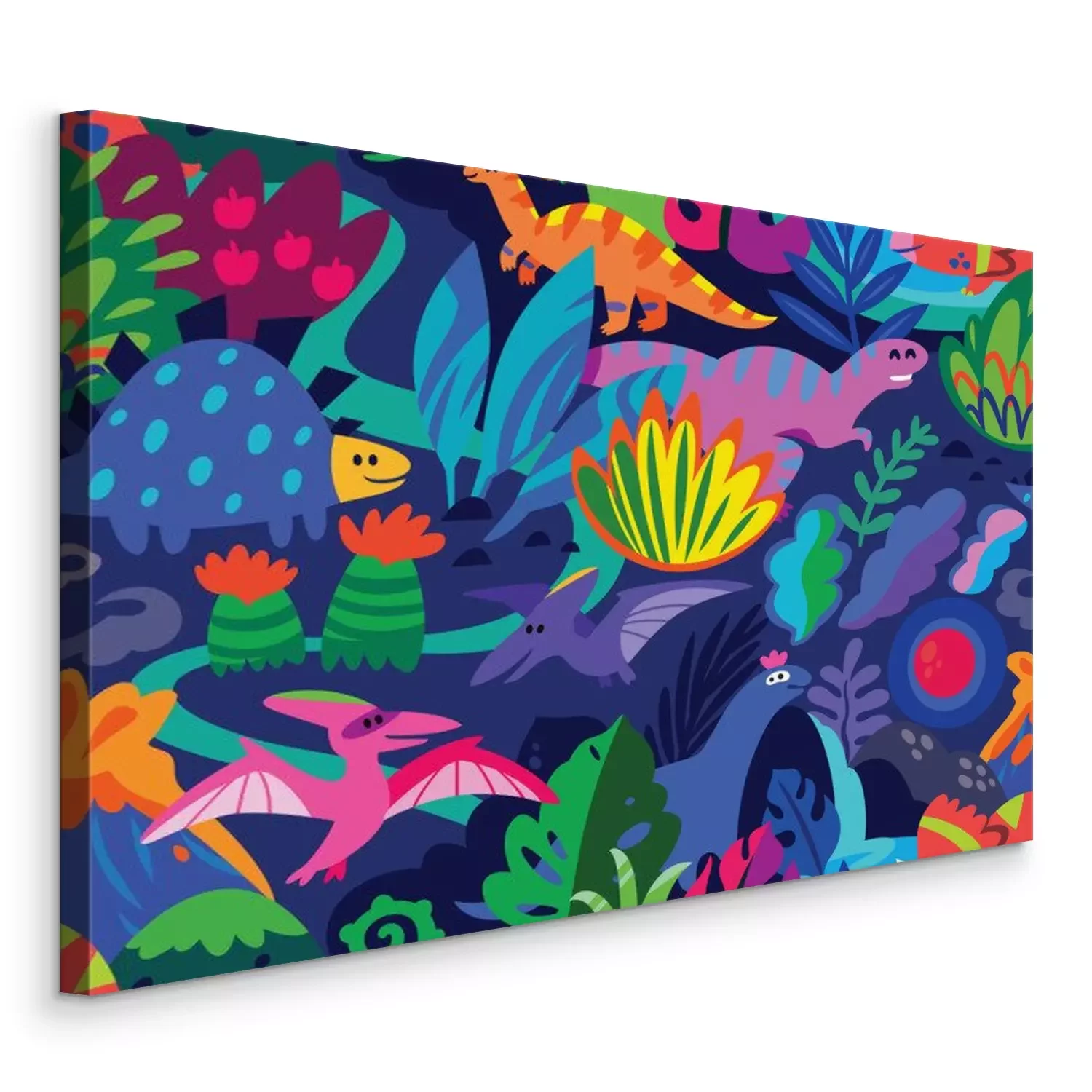 Canvas: Abstract patroon met dinosaurussen en kleurrijke planten