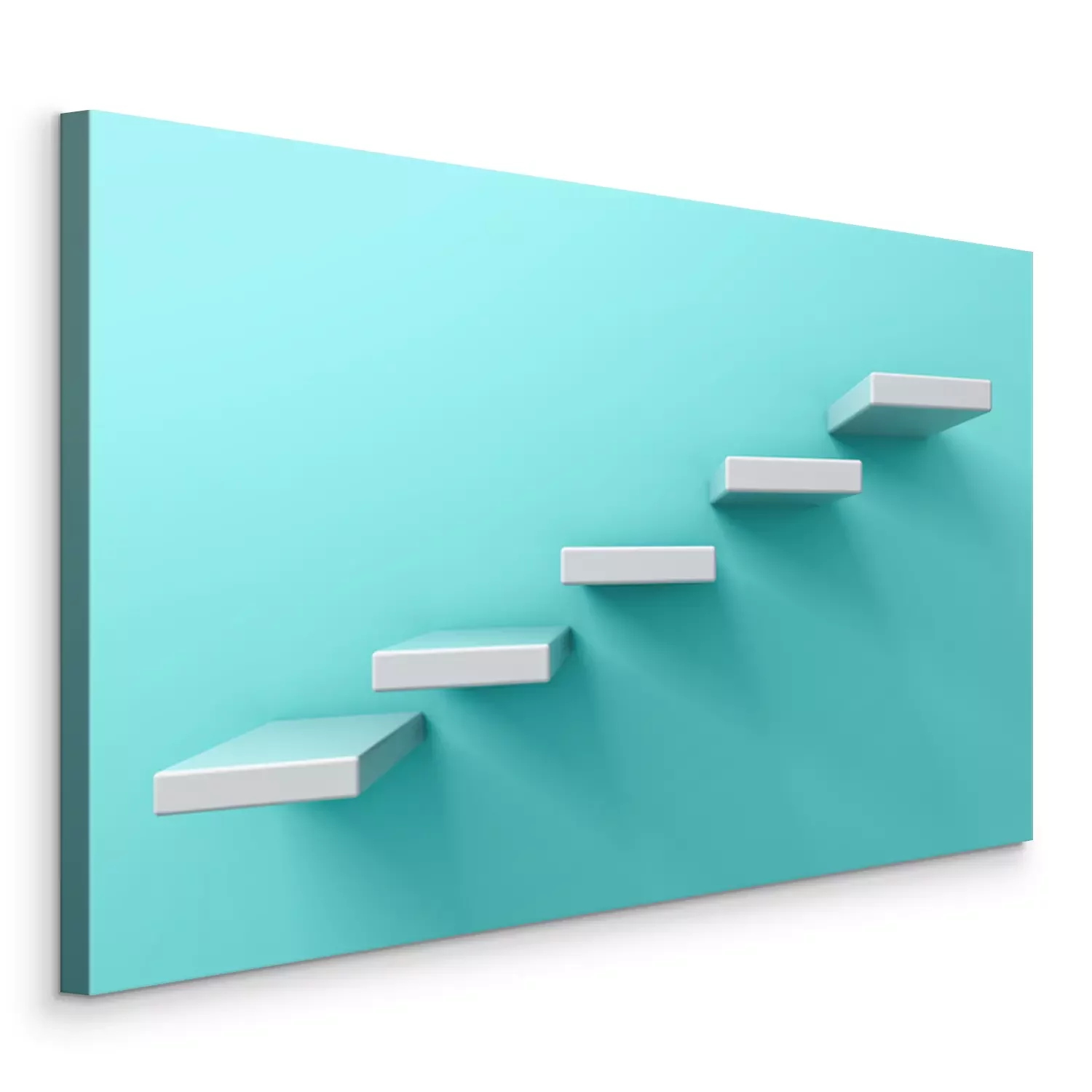 Canvas: Abstract white stairs or five steps business concept on blue green pastel color wall background with shadow 3D rendering