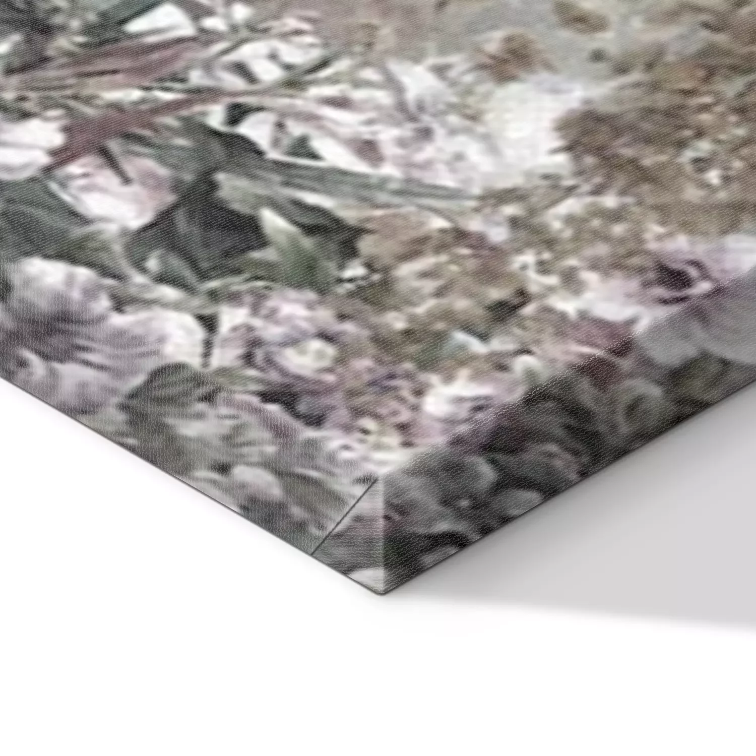 De print wordt aangebracht op hoogwaardig canvas dat op een schildersweefgetouw (spieraam) wordt gespannen. Omdat de print de zijranden bedekt, hoeft het ontwerp niet met een extra kader te worden omlijst. Wij raden ook composities aan die uit meerdere foto's bestaan en zo een coherente compositie vormen.