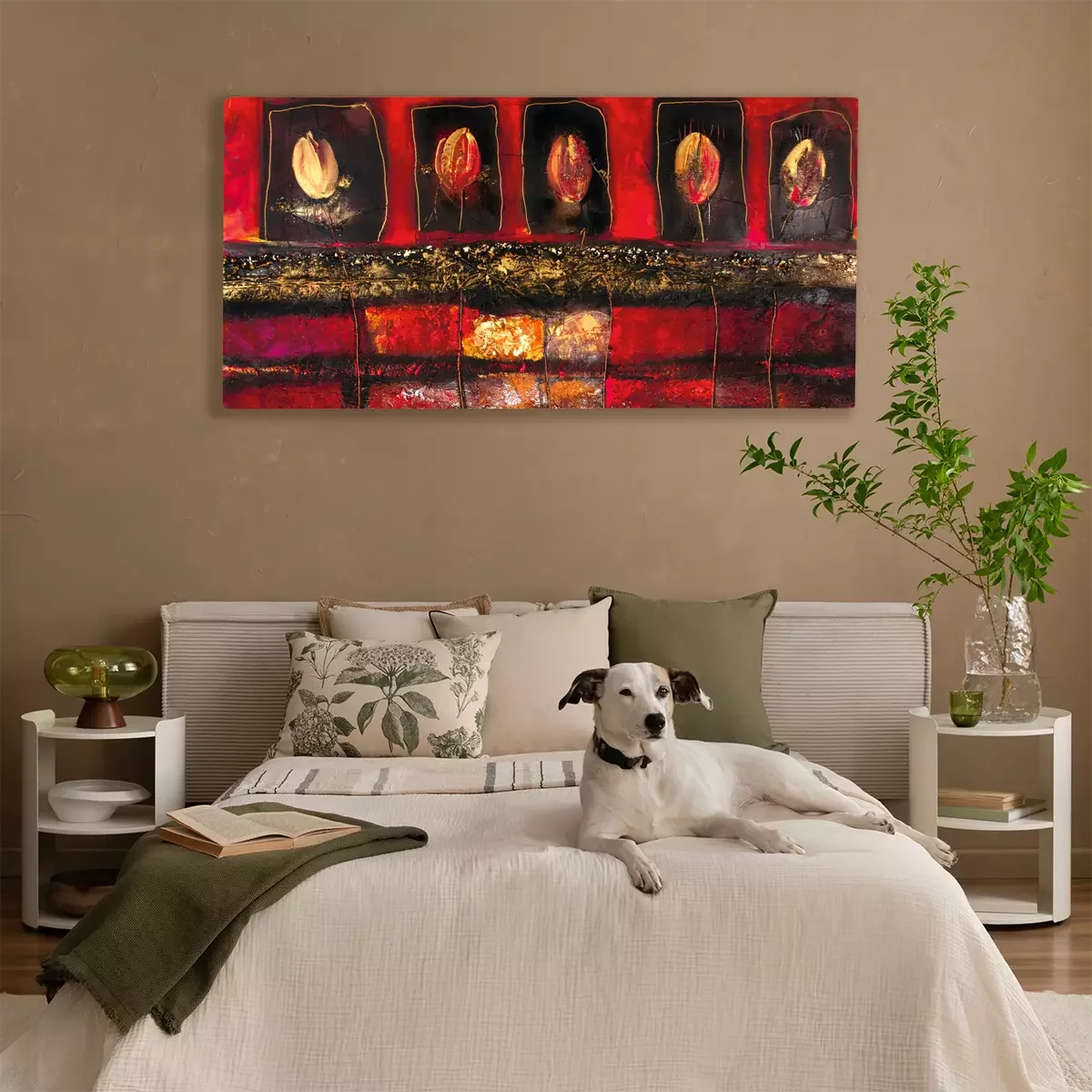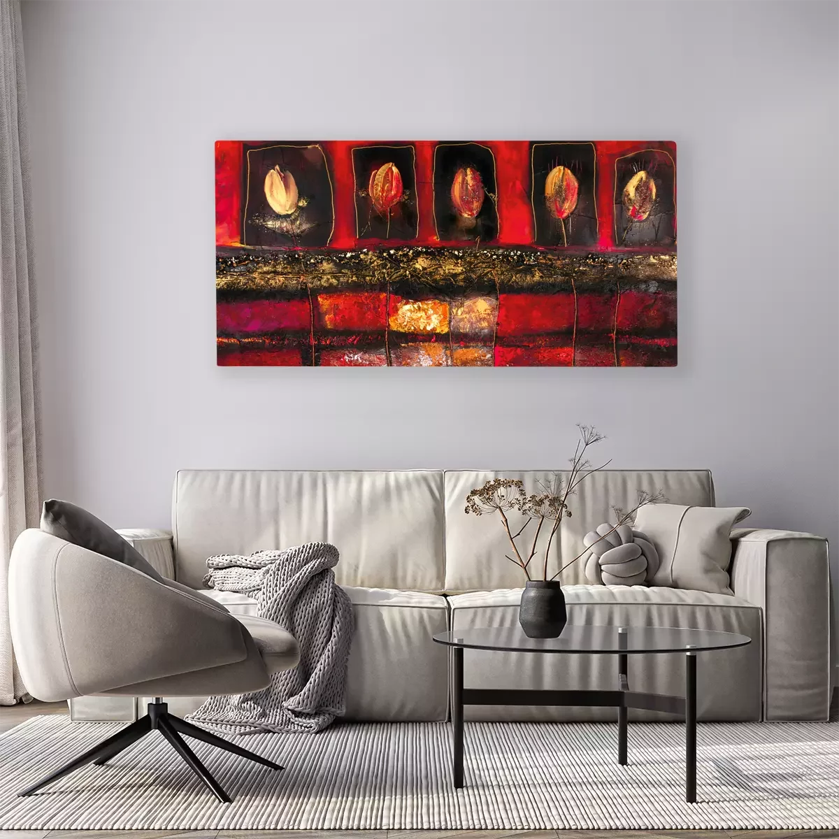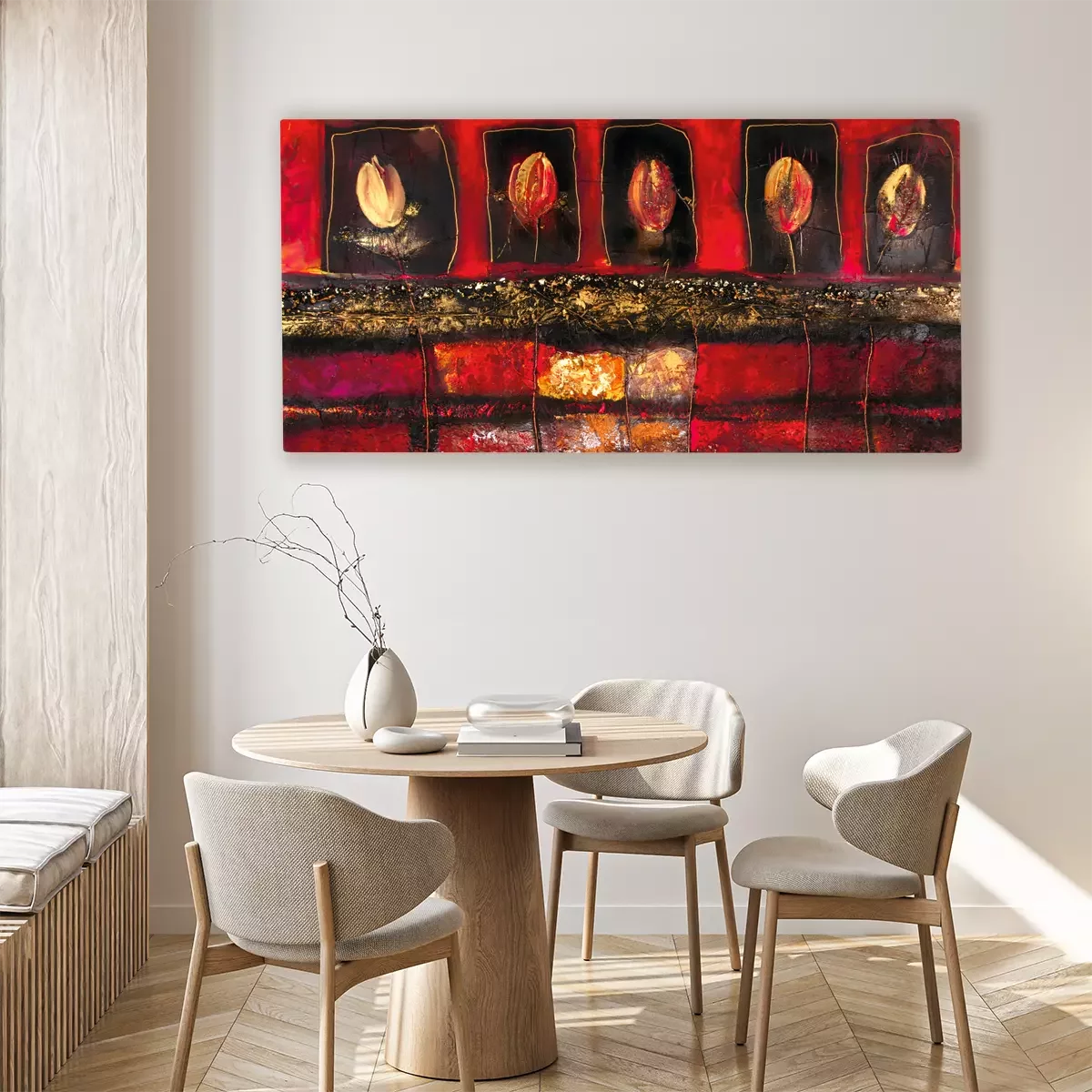 Abstracte compositie van tulpen op een rode achtergrond