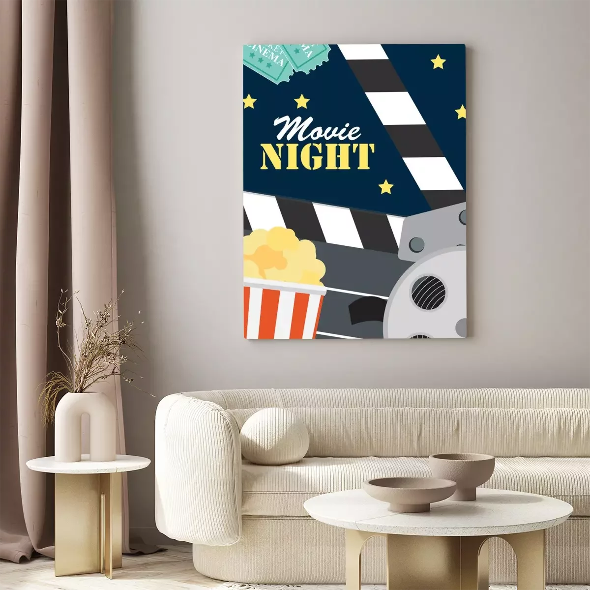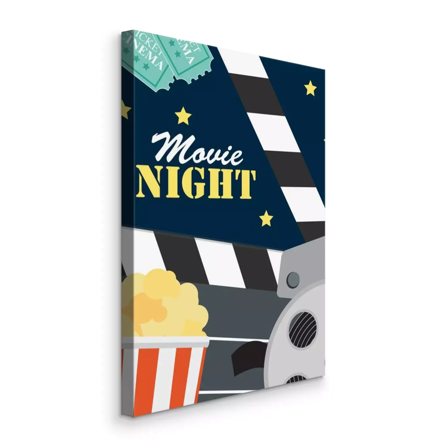 Canvas: Abstracte film nacht bioscoop platte achtergrond met Reel, oude stijl Ticket, grote pop maïs en klepel symbool pictogrammen. Vector illustratie