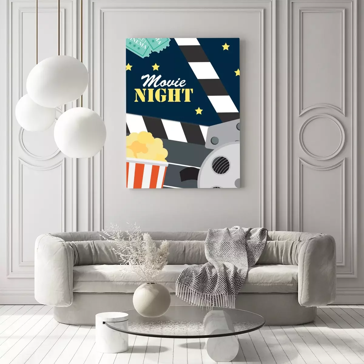 Canvas Abstracte film nacht bioscoop platte achtergrond met Reel, oude stijl Ticket, grote pop maïs en klepel symbool pictogrammen. Vector illustratie