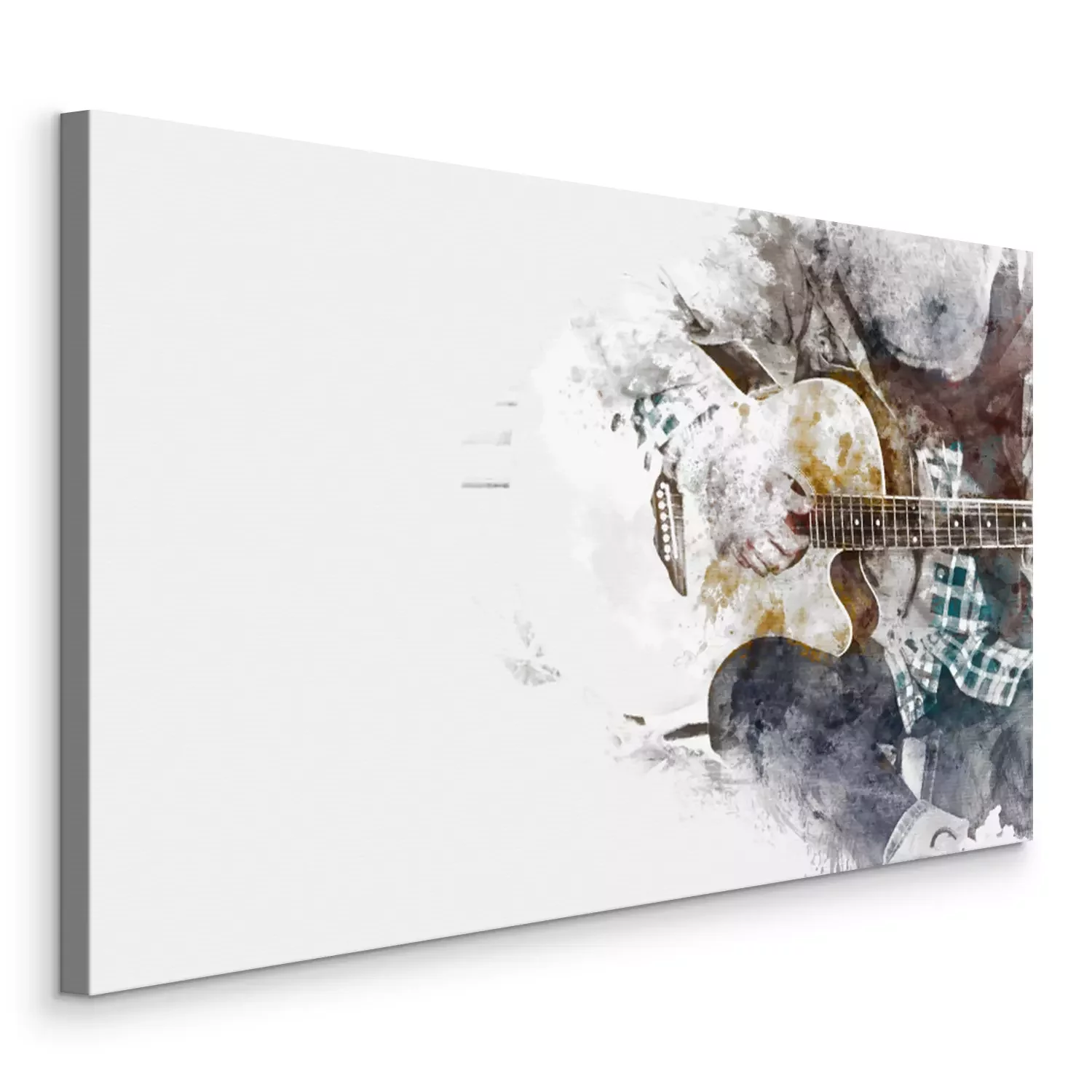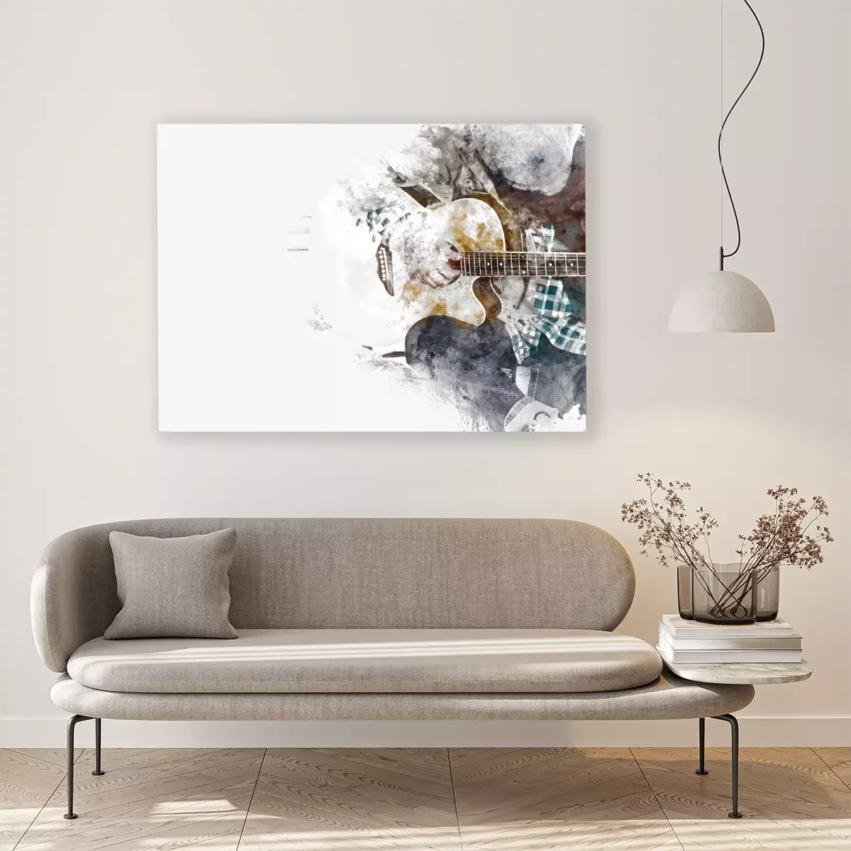 Canvas: Abstracte mooie akoestische gitaar spelen op de voorgrond op aquarel schilderij achtergrond en digitale illustratie penseel voor kunst.