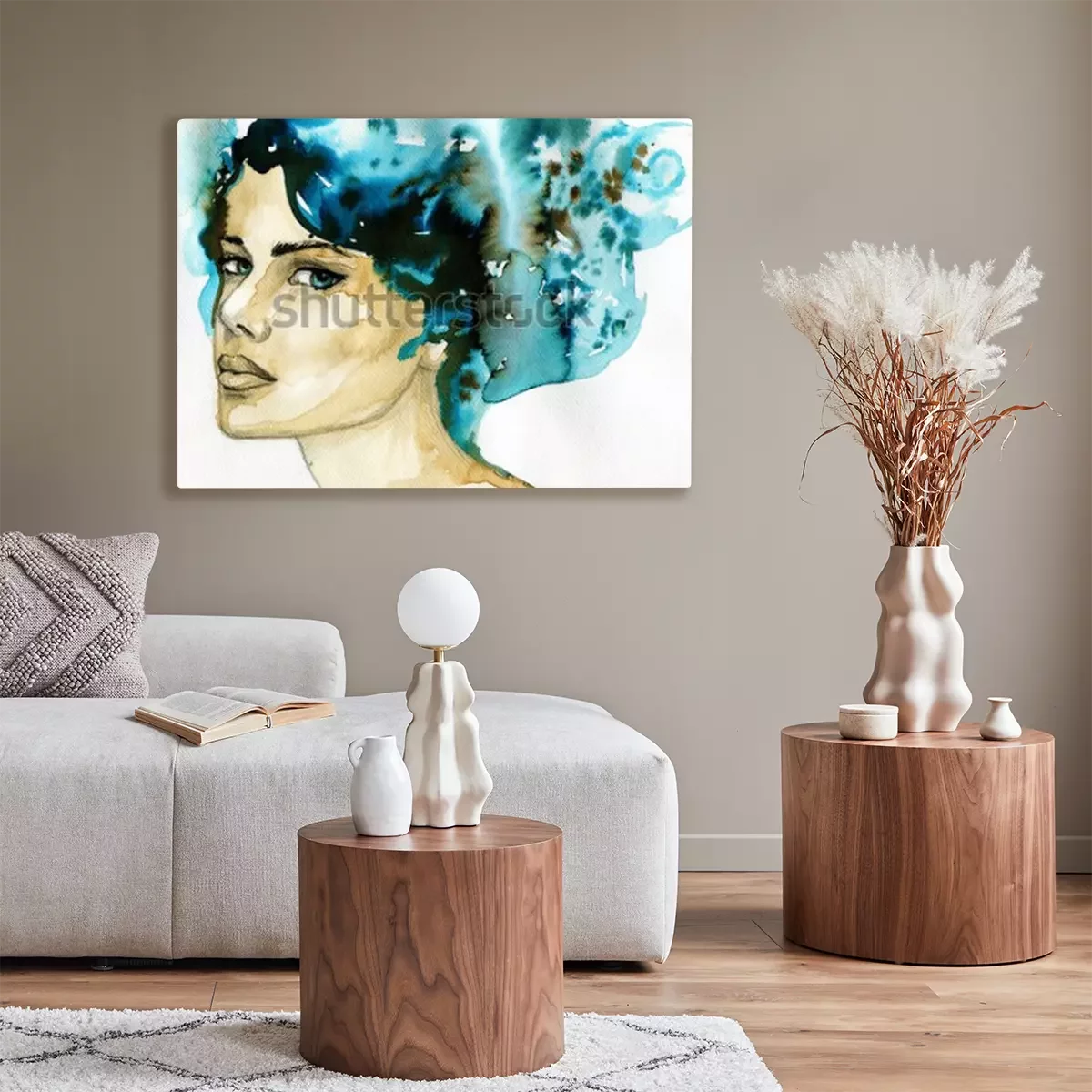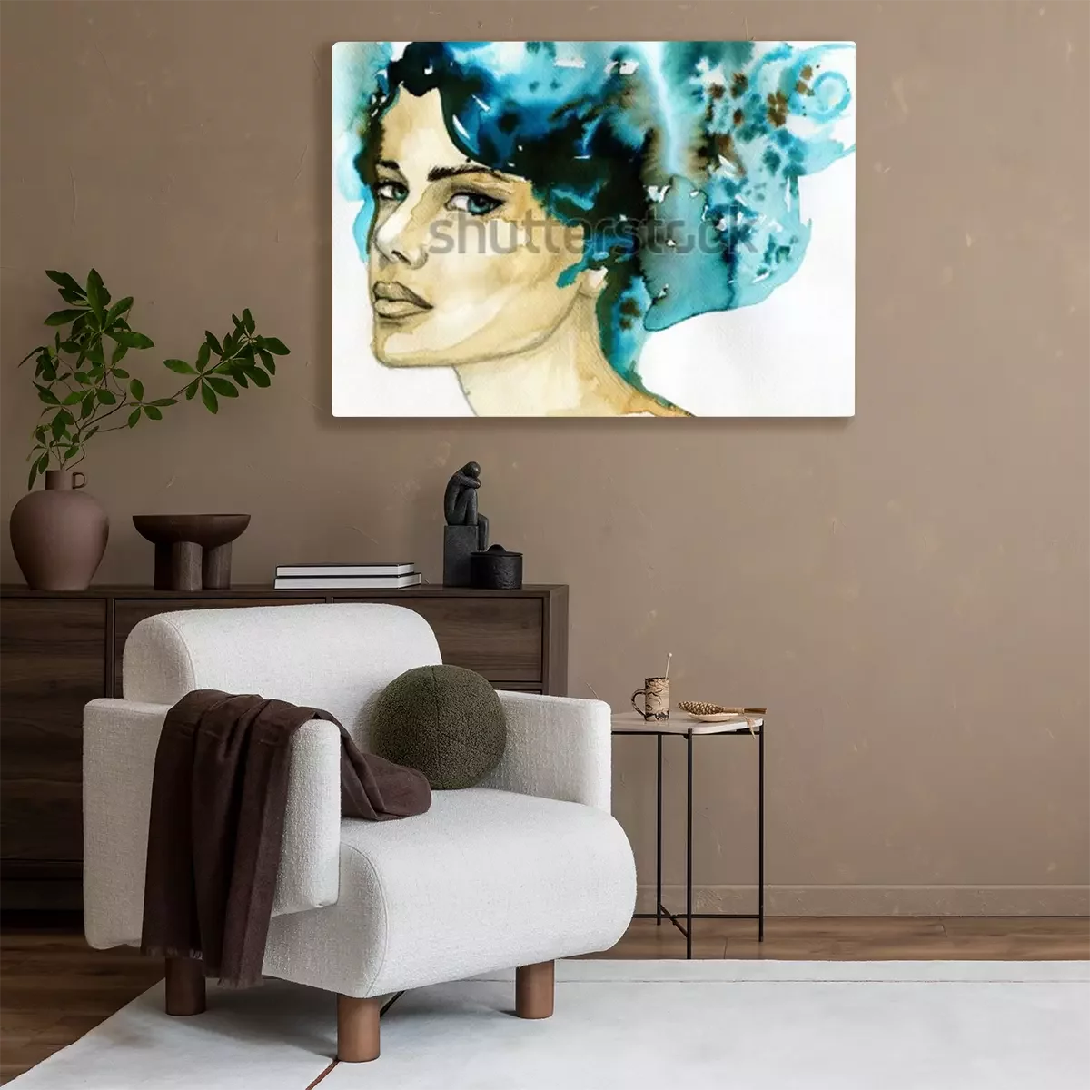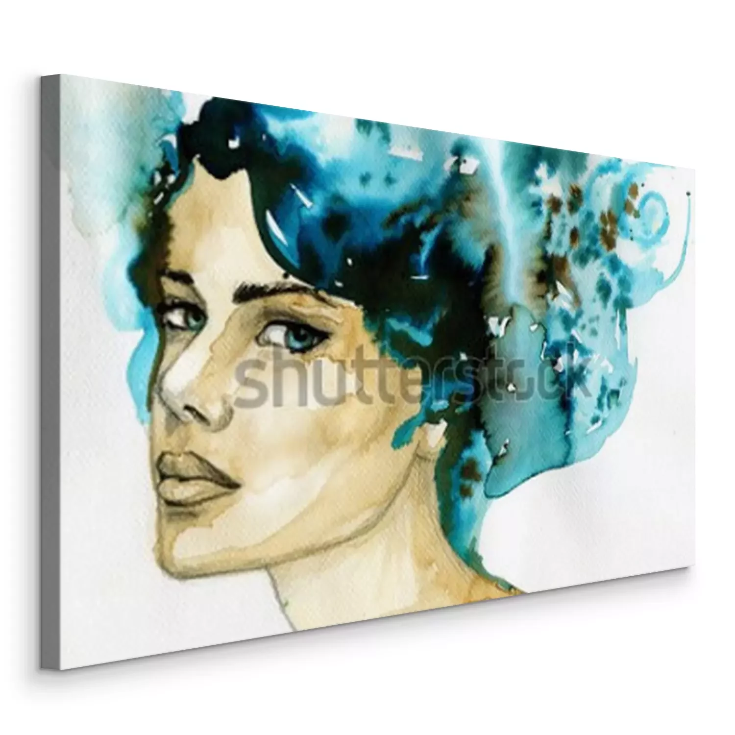 Canvas: Abstracte waterverfillustratie die een portret van een vrouw afschildert