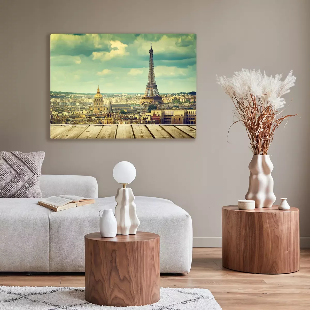 Canvas: achtergrond met een houten dek tafel en de Eiffeltoren in Parijs