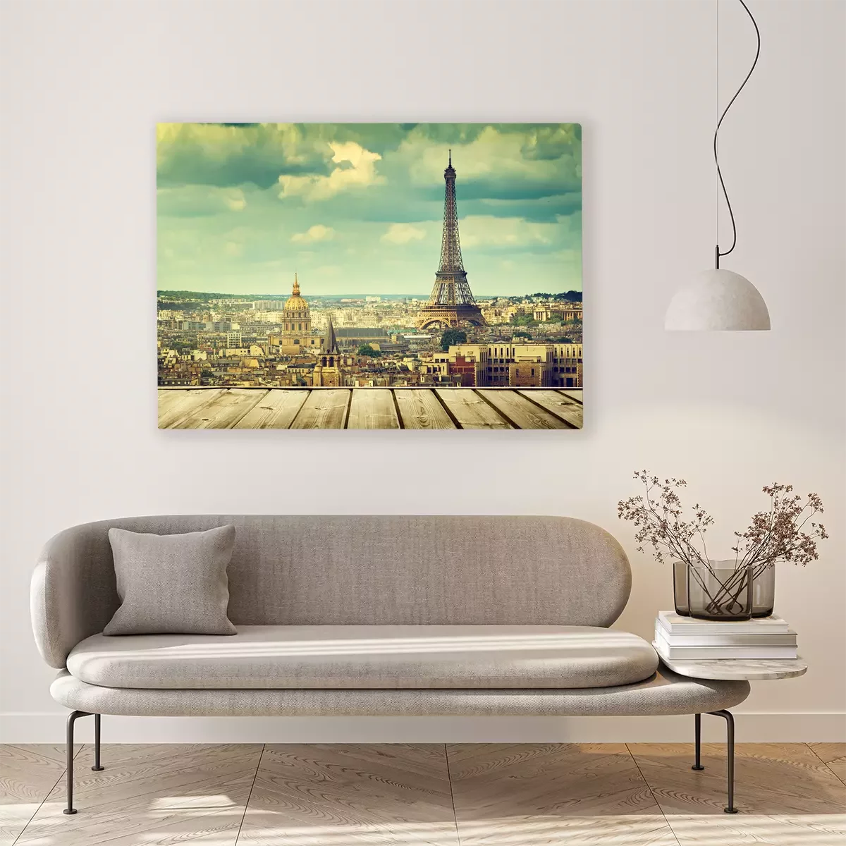 Canvas achtergrond met een houten dek tafel en de Eiffeltoren in Parijs