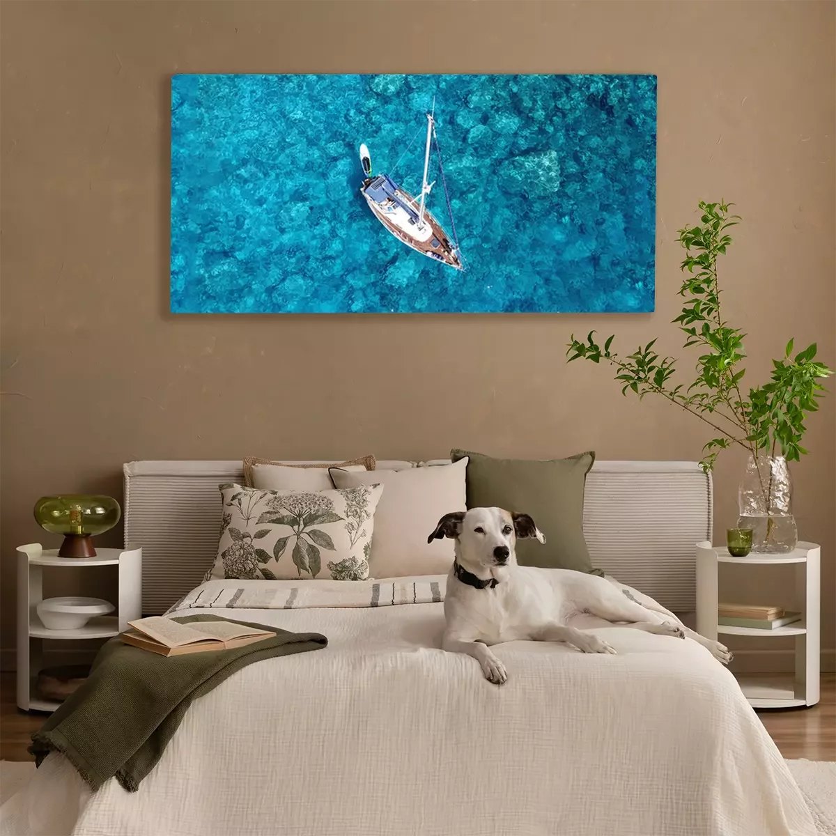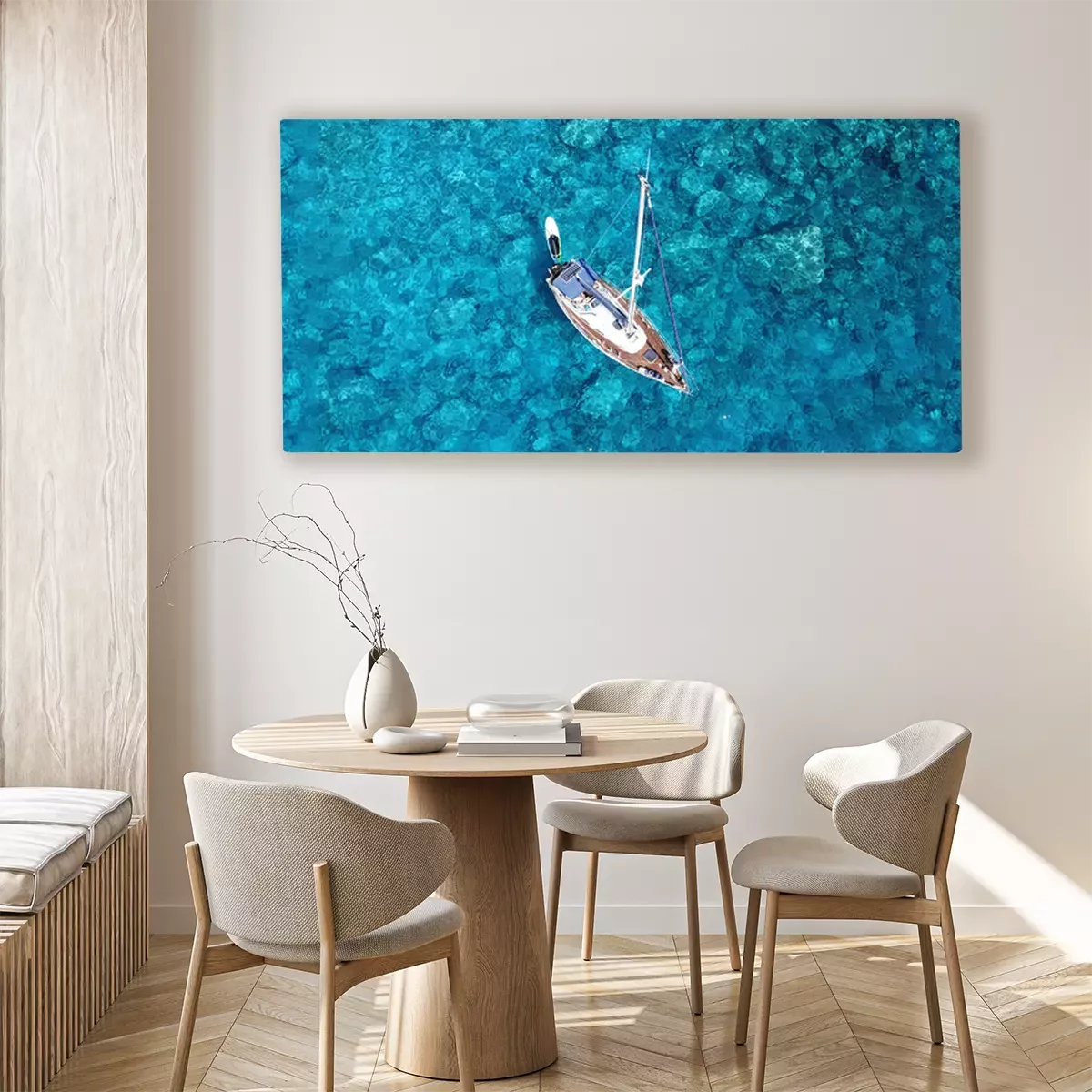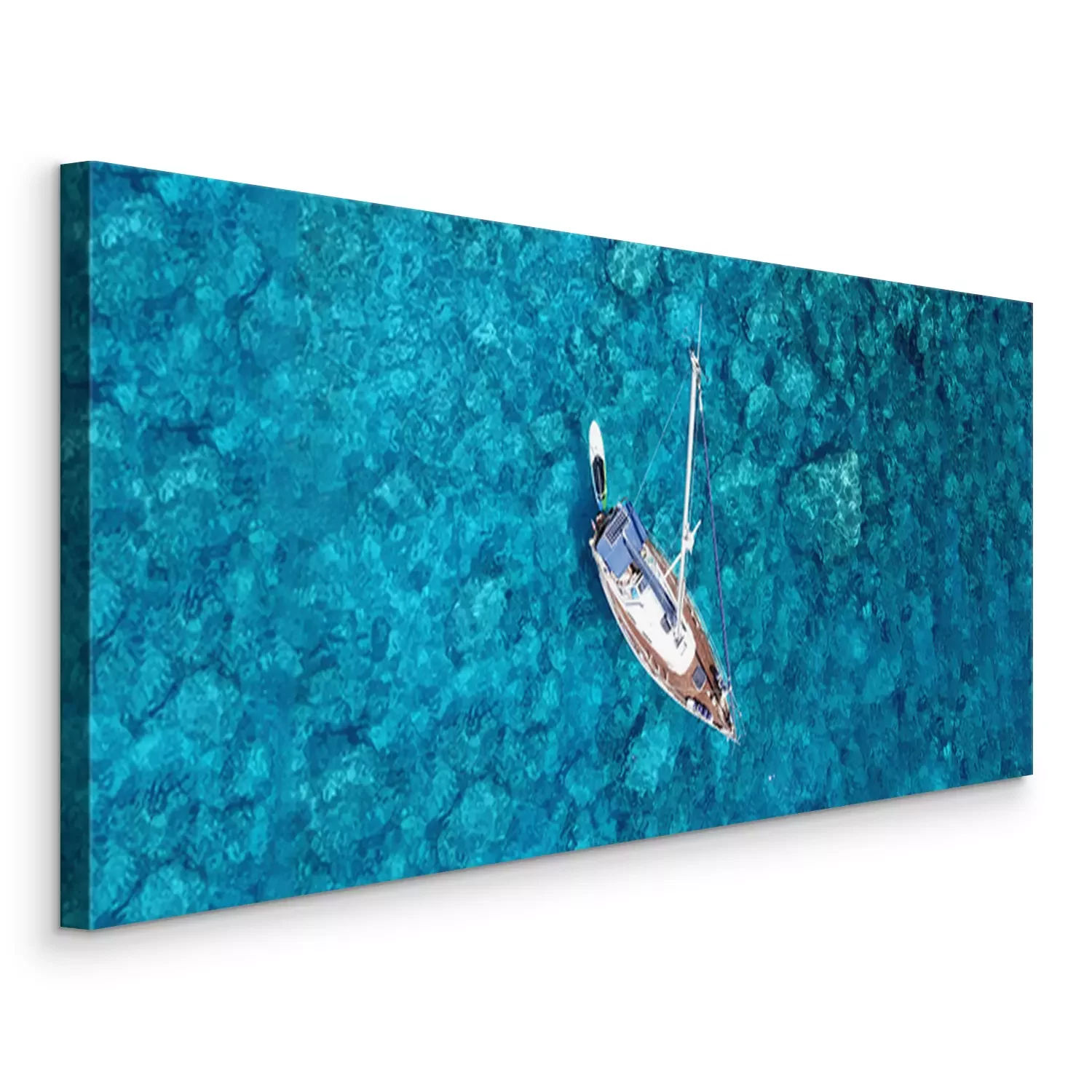 Canvas: Aerial drone photo of luxury sail boat docked in tropical exotic bay with turquoise crystal clear sea