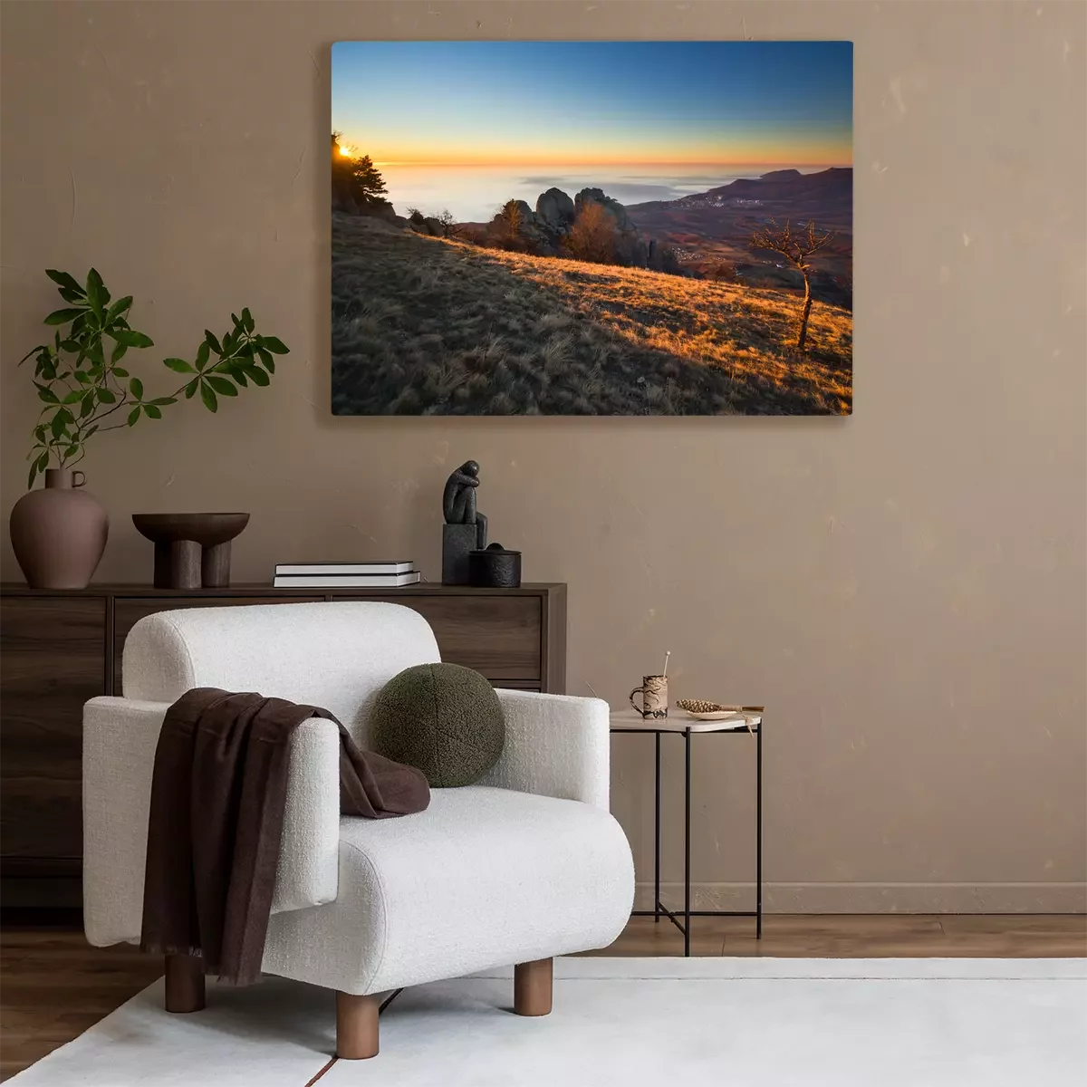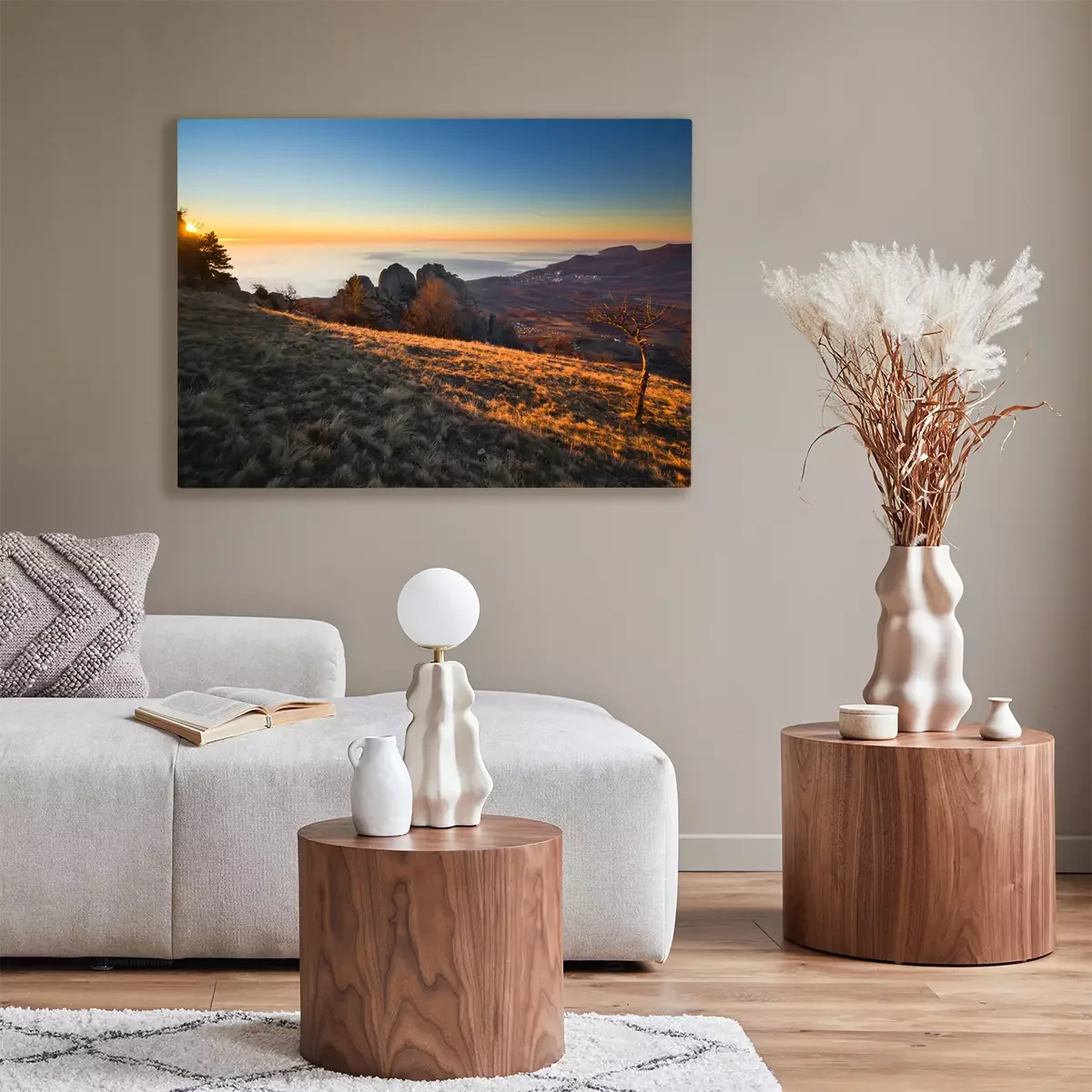 Canvas: aerial view from mountains of magnificent sunrise above the sea