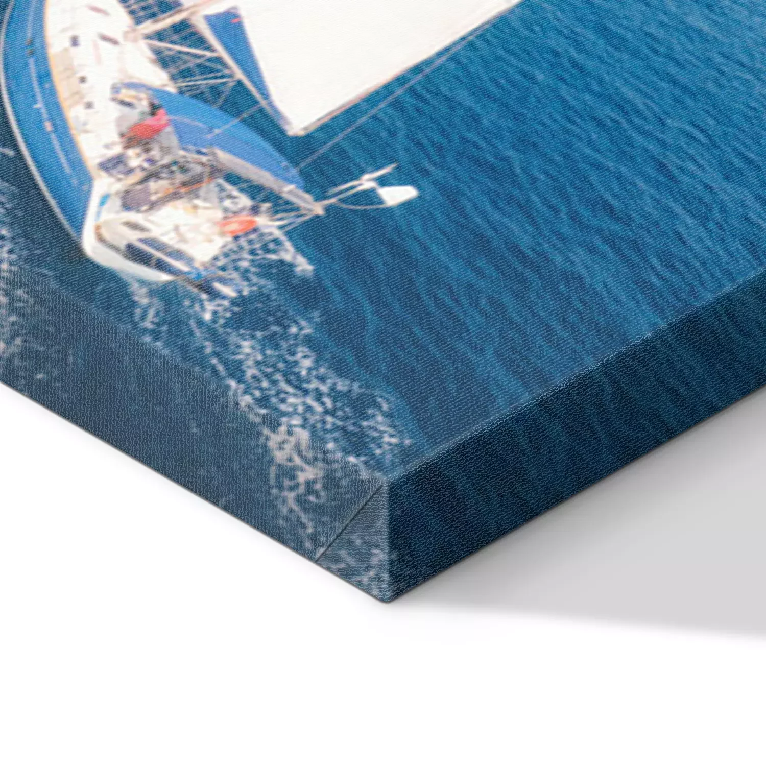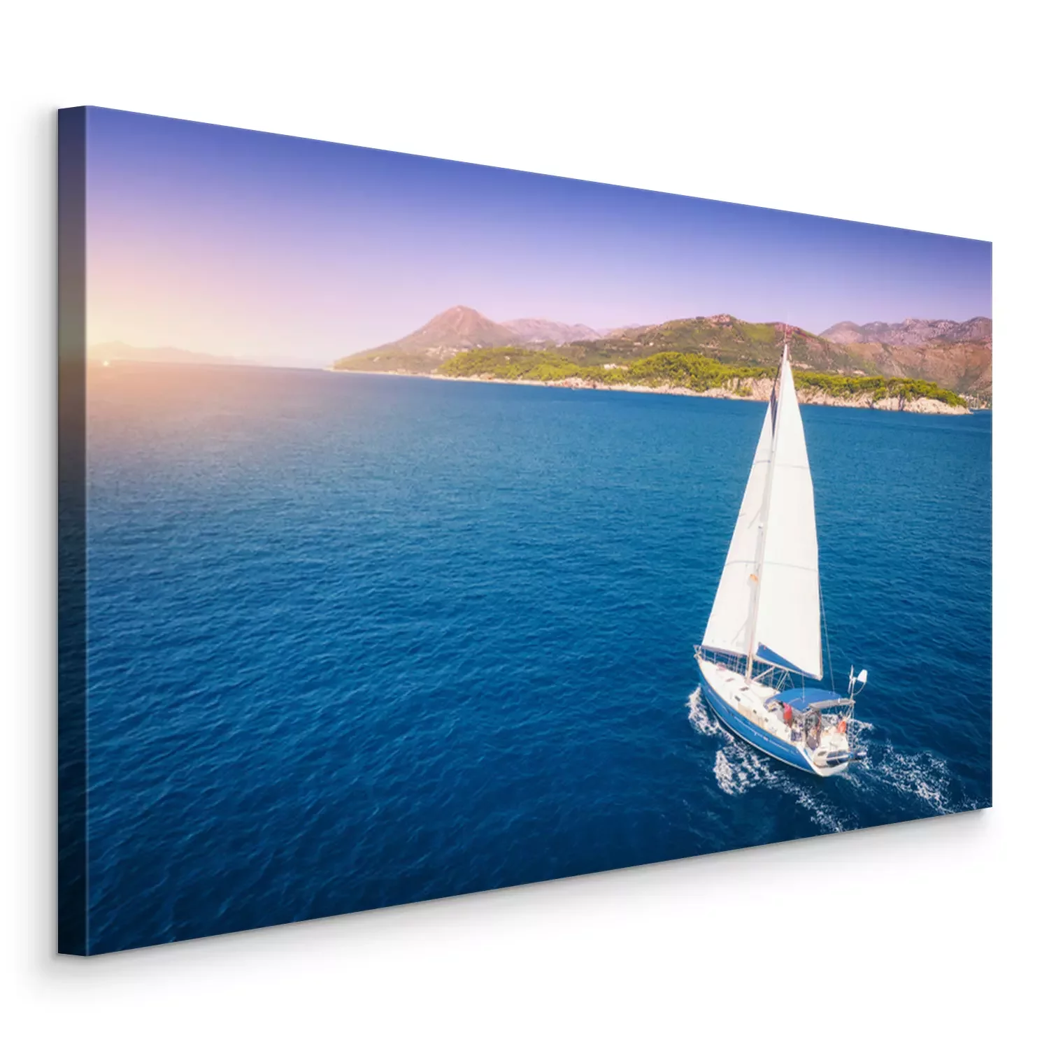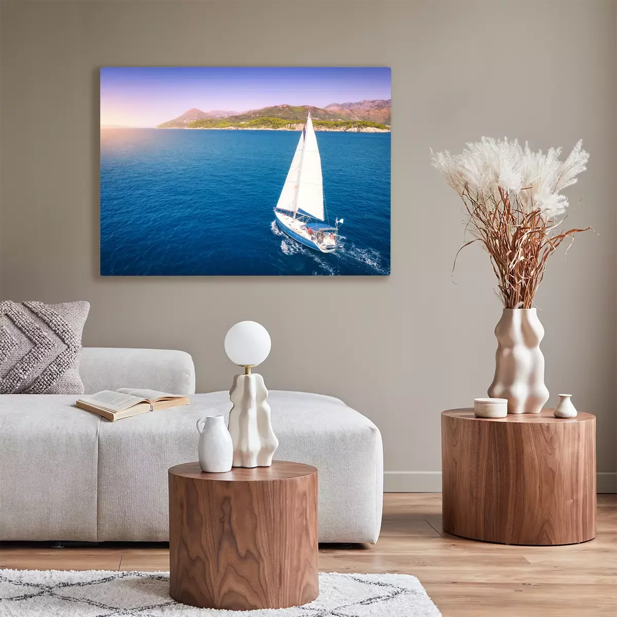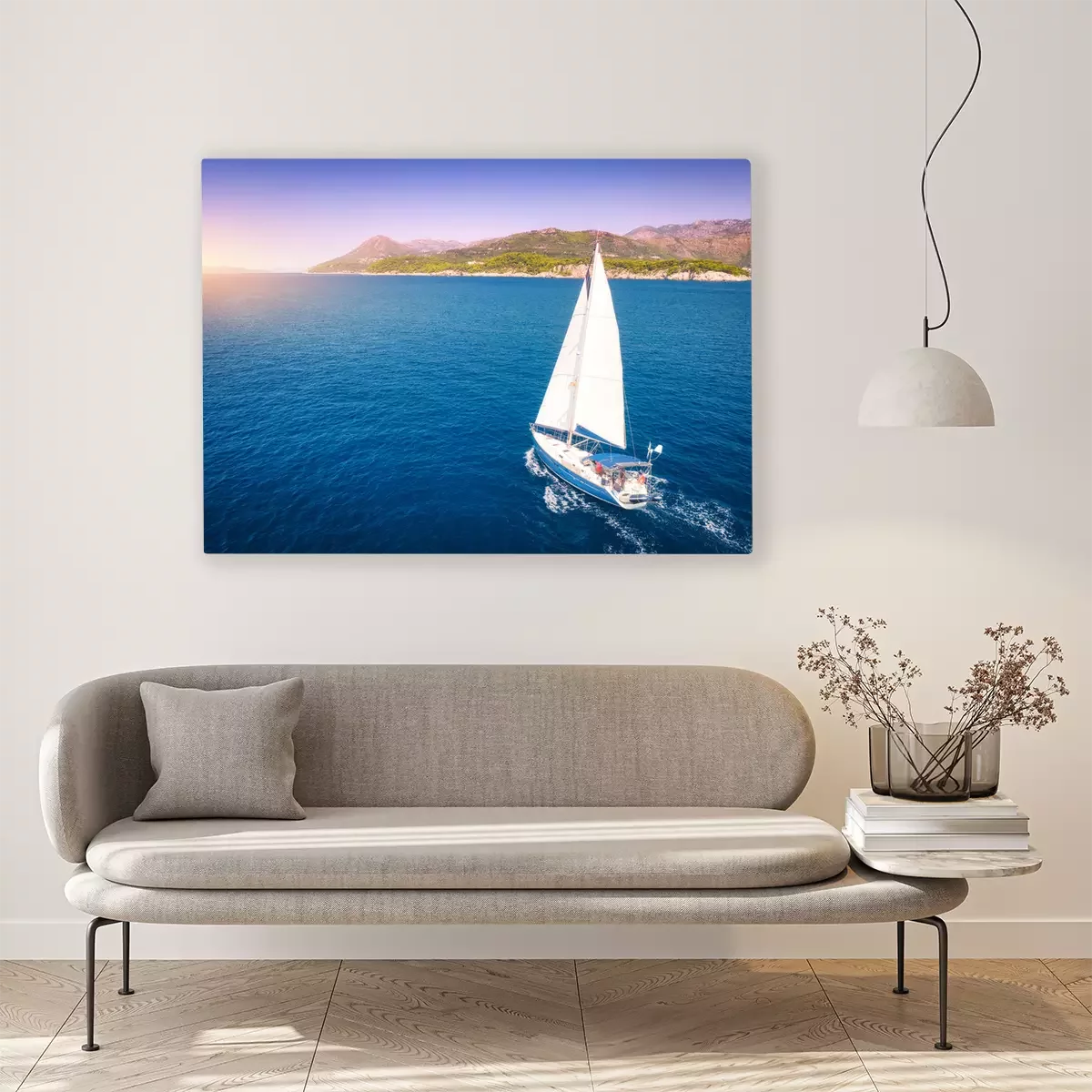 Canvas Aerial view of beautiful white sailboat in blue sea at bright sunny summer evening. Adriatic sea in Croatia. Landscape with yacht, mountains, transparent blue water, sky at sunset. Top view of boat