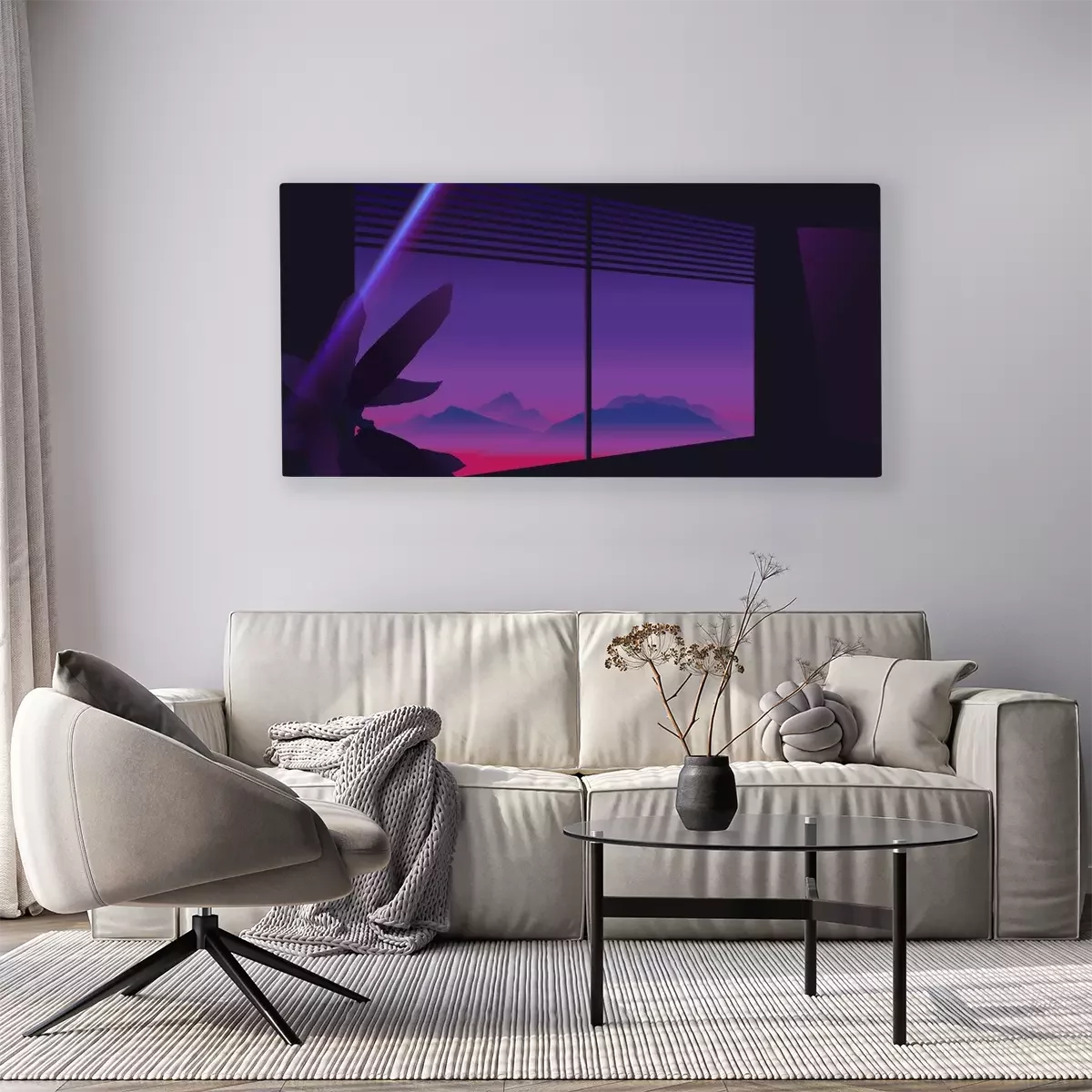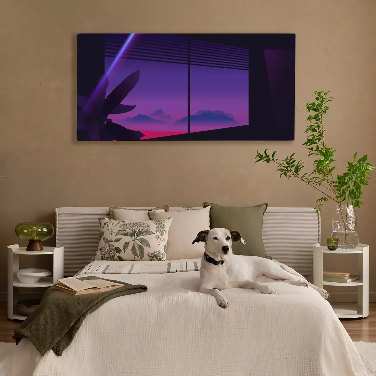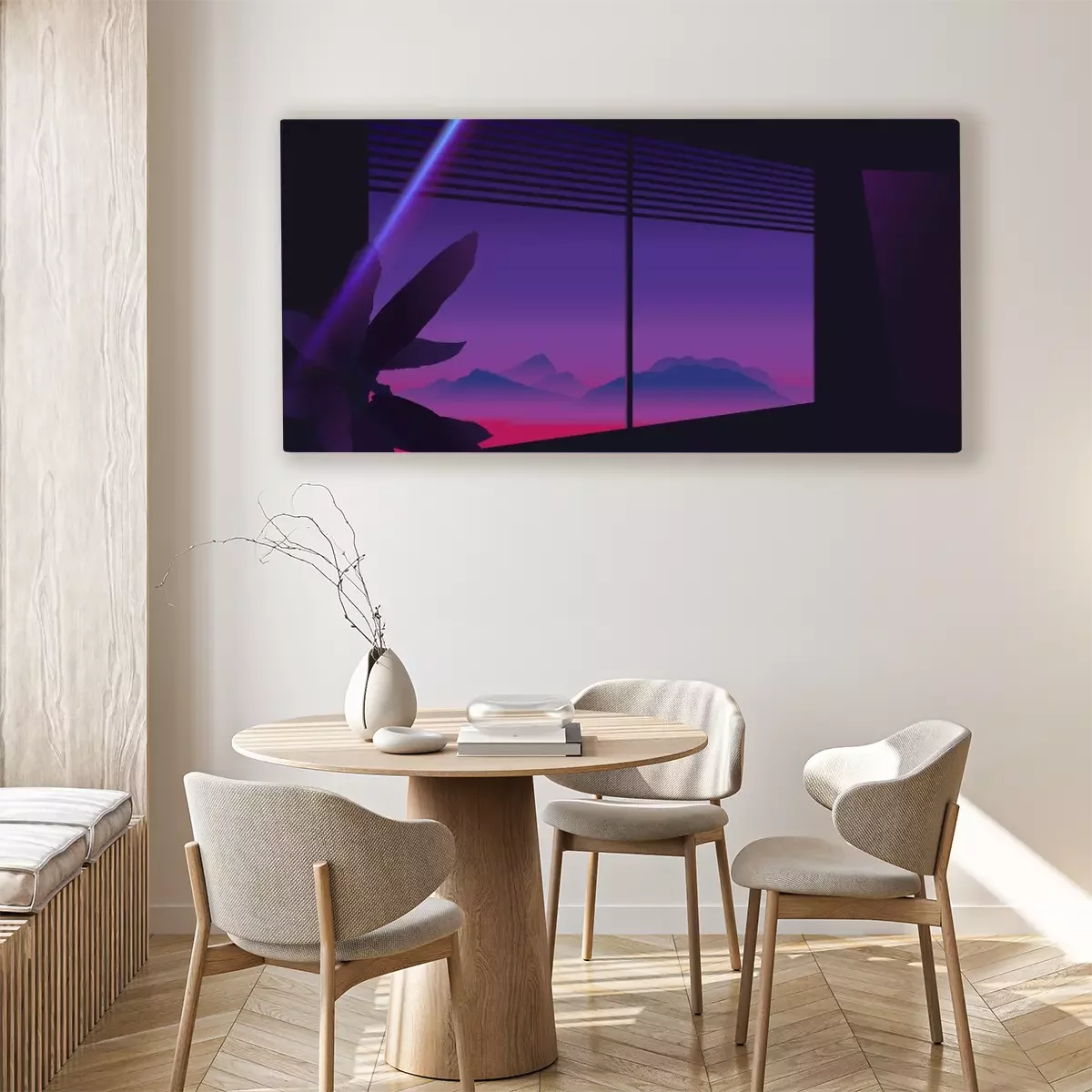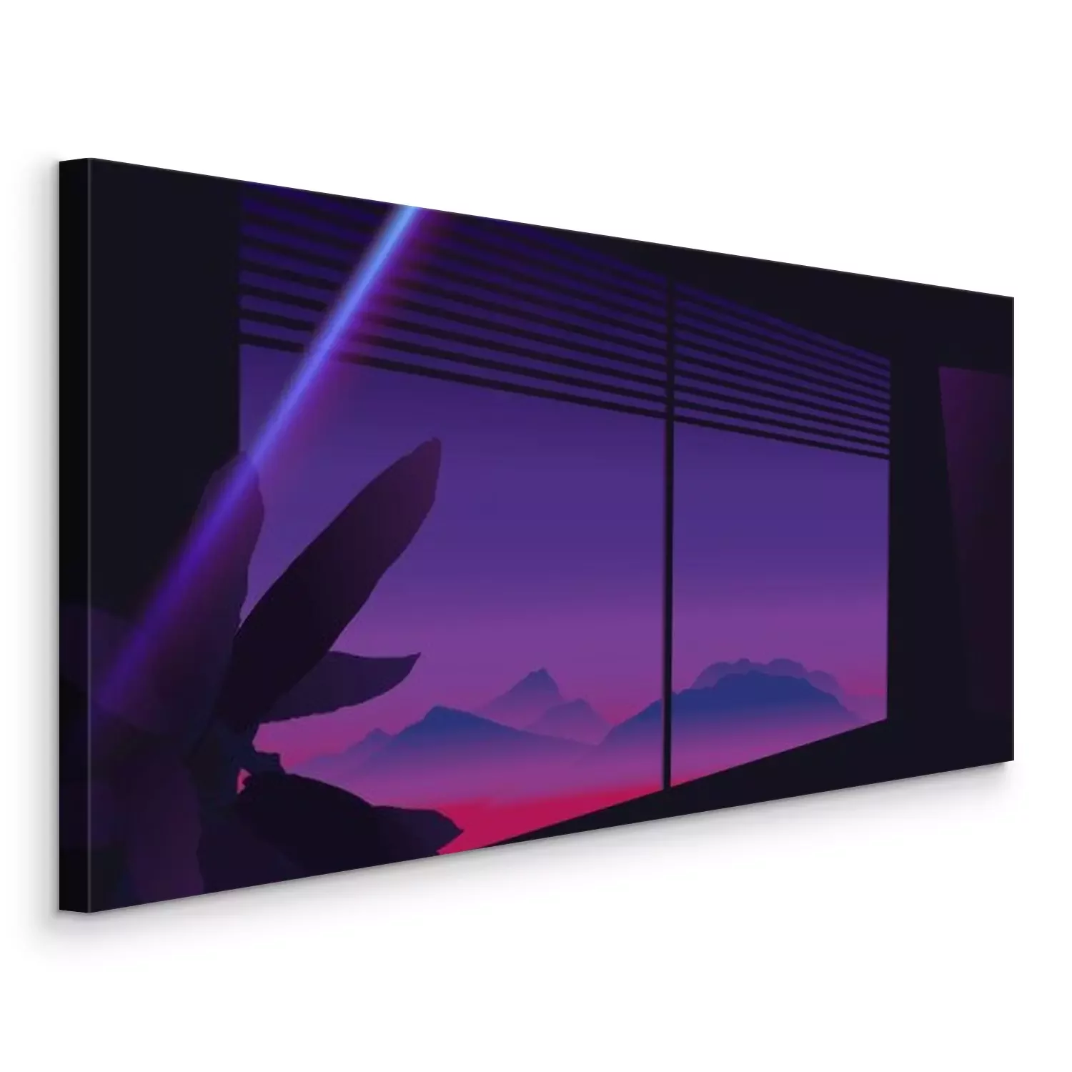 Canvas Aesthetic louver window mountain view with tropical plant, neon purple and pink sky, dark room ambient with glow light leak flare, 80s summer vibe