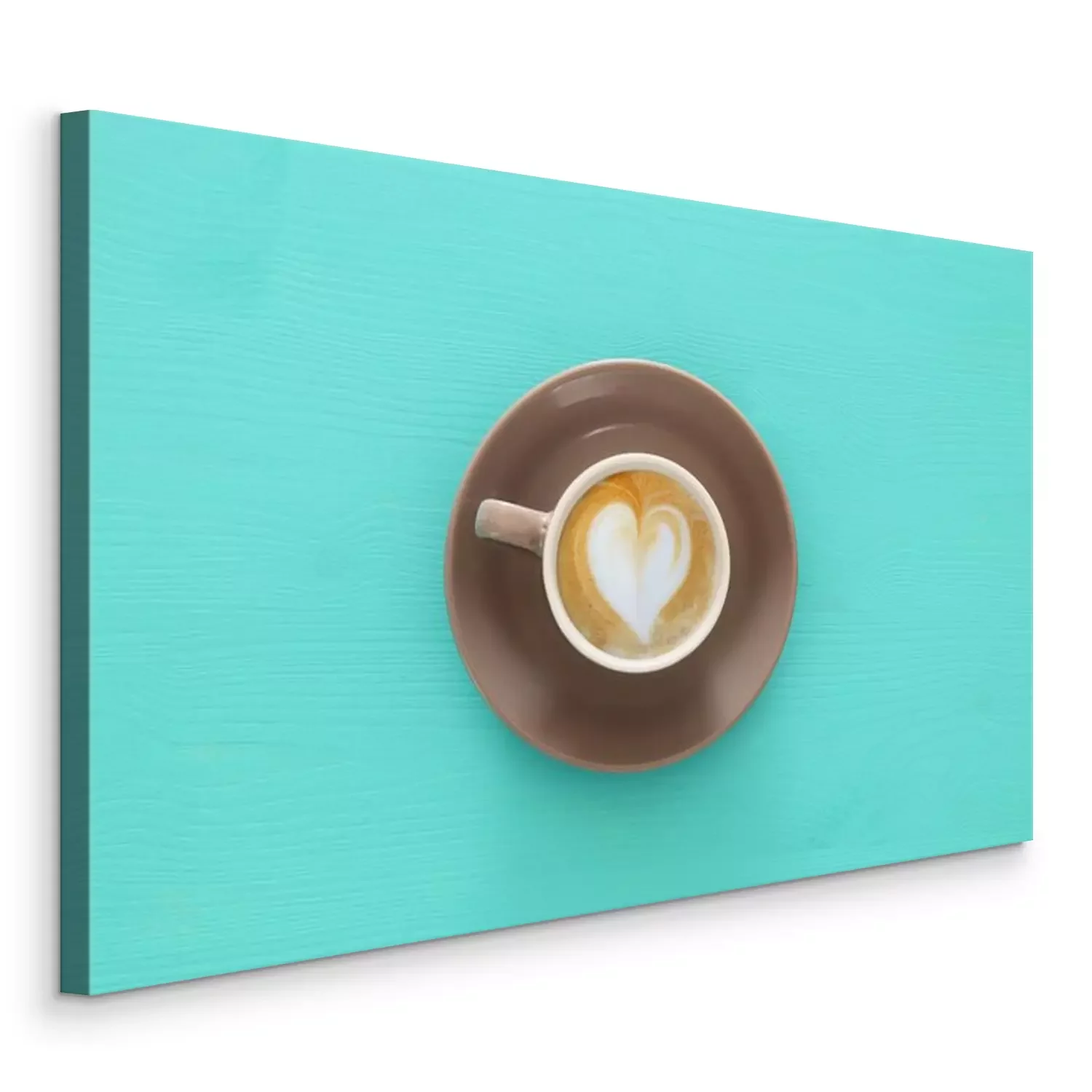 Canvas: afbeelding van koffie beker met schuim van hartvorm over houten blauwe tafel.