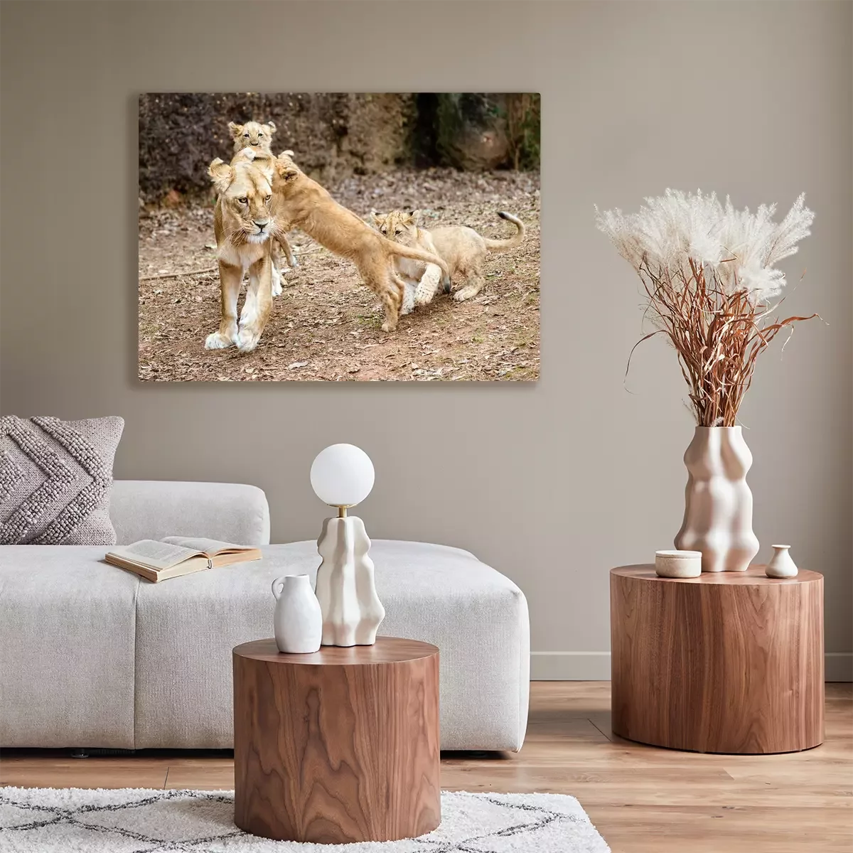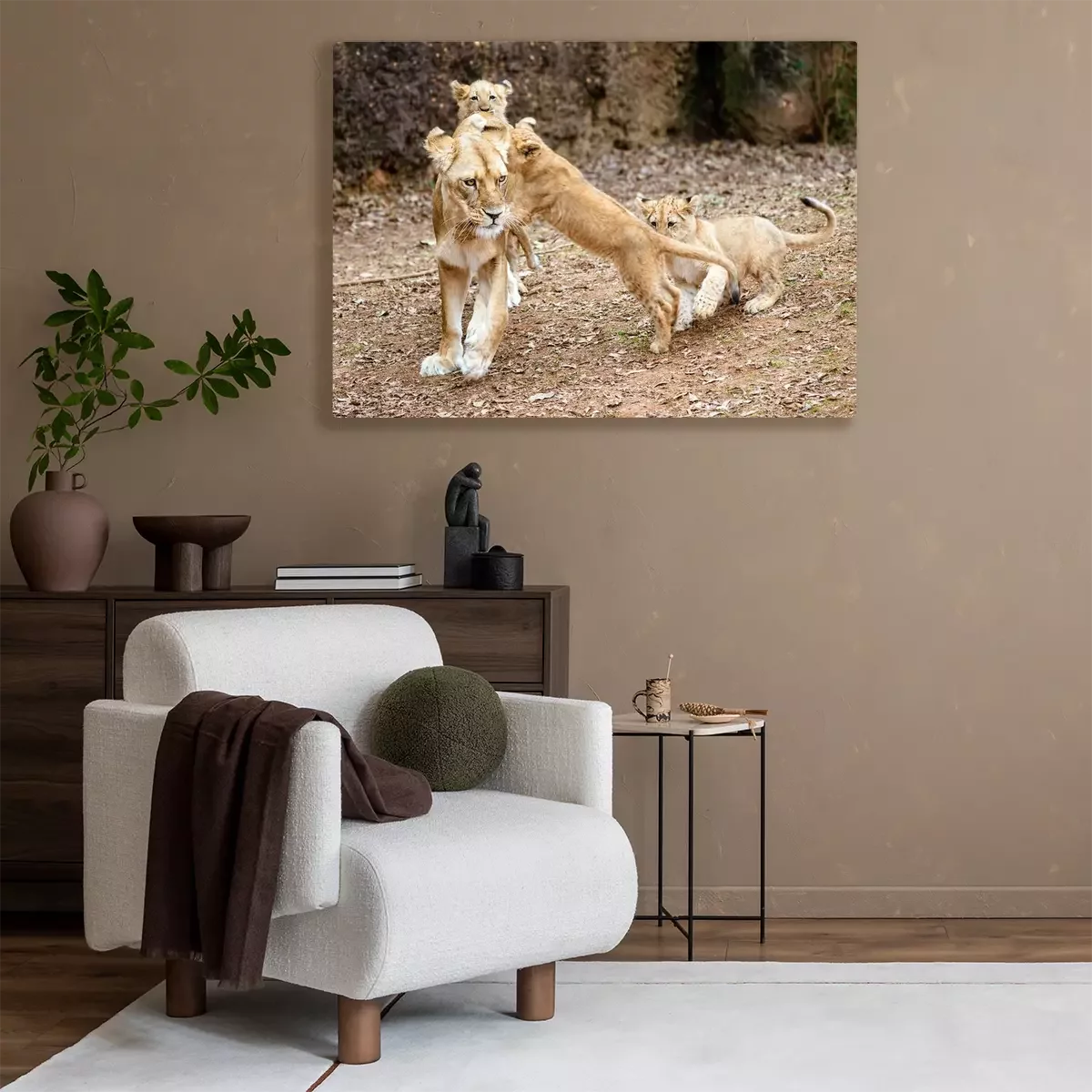 Canvas: Afrikaanse leeuw welpen spelen met hun moeder leeuwin
