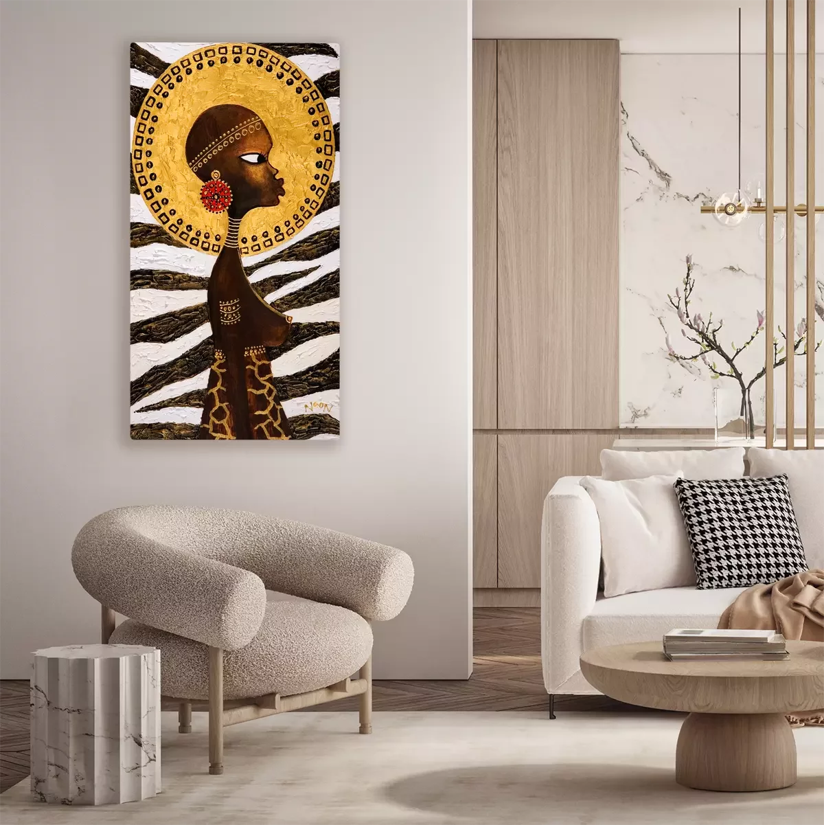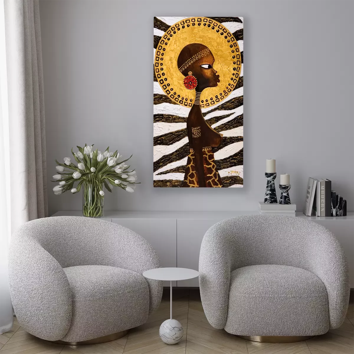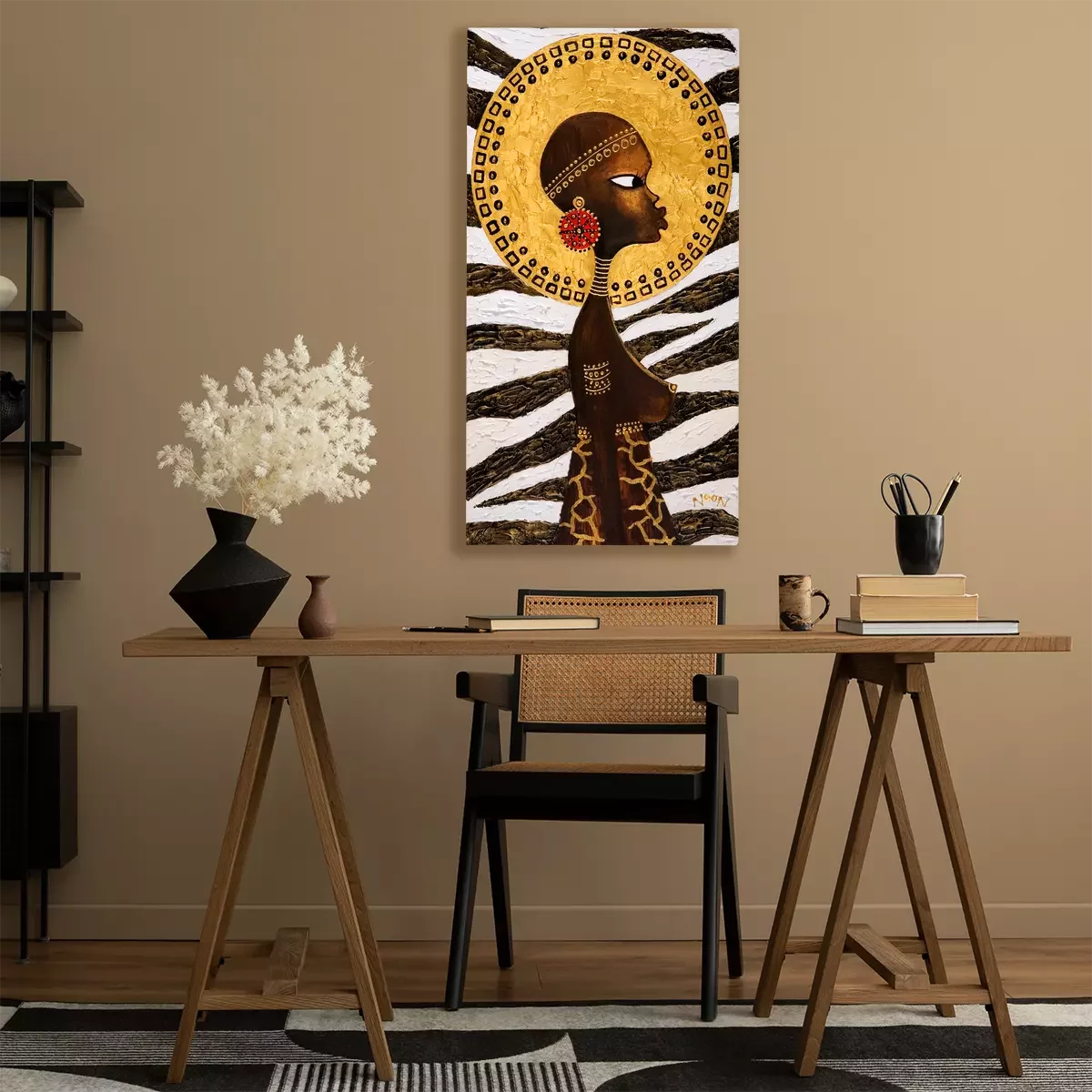 Afrikaanse vrouw met een diermotief op de achtergrond