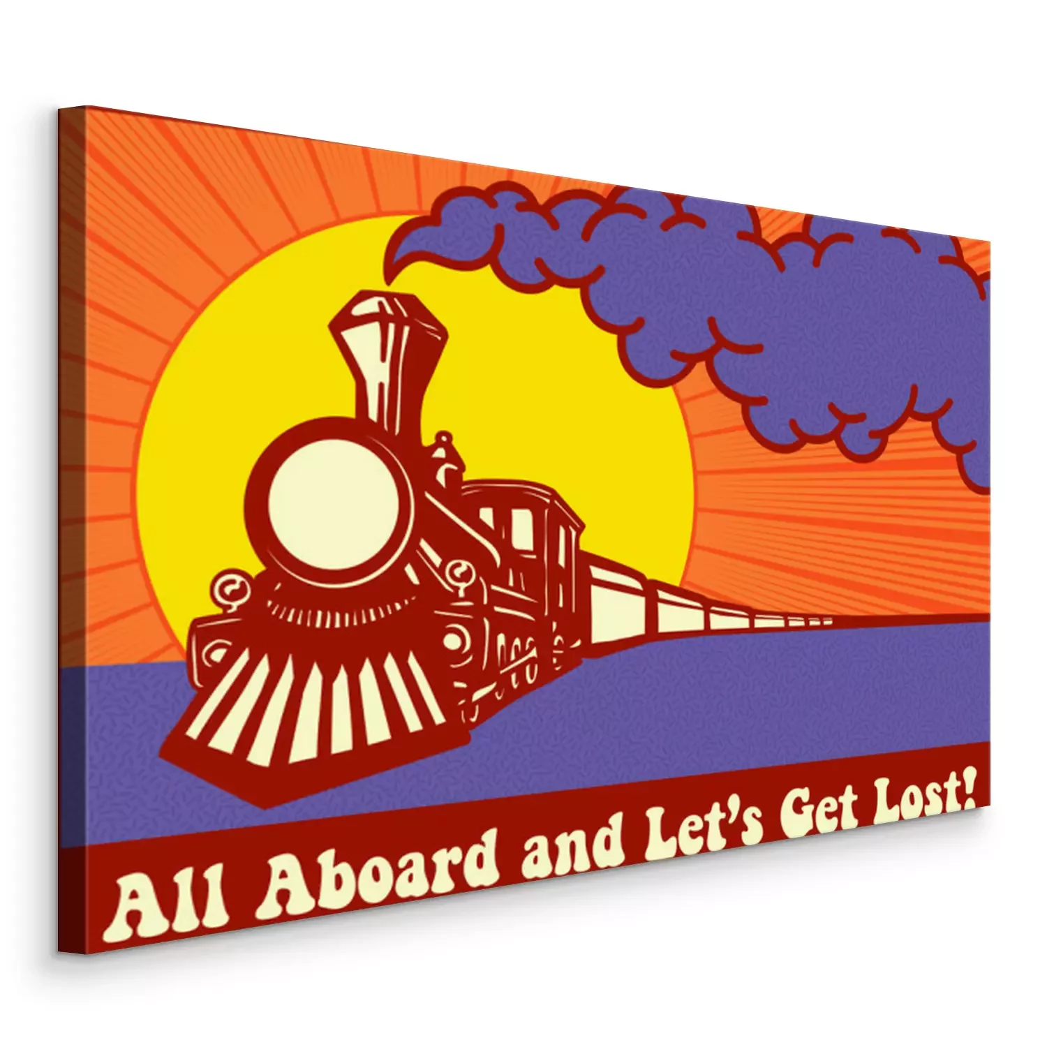 Canvas All aboard and let's get lost! Retro puffing steam train engine at sunset, express train