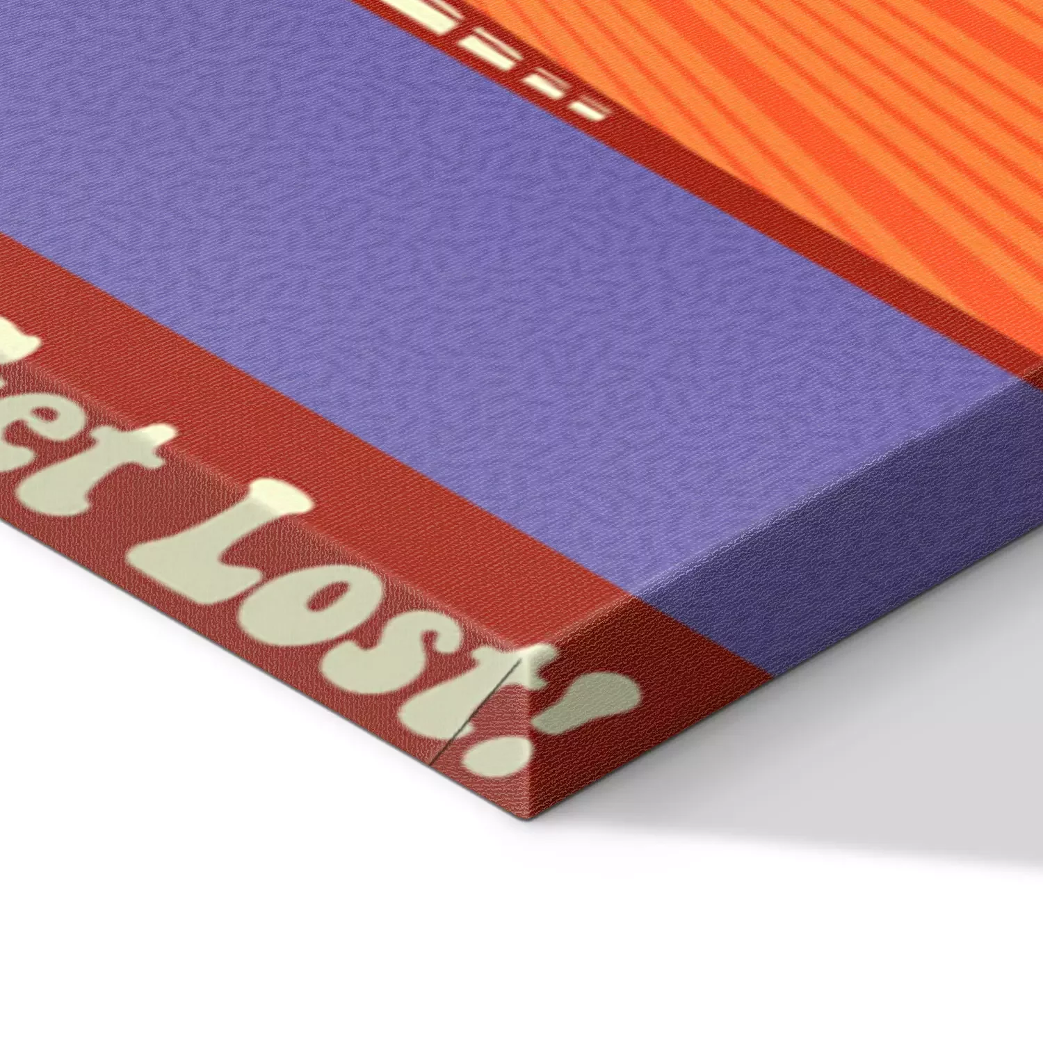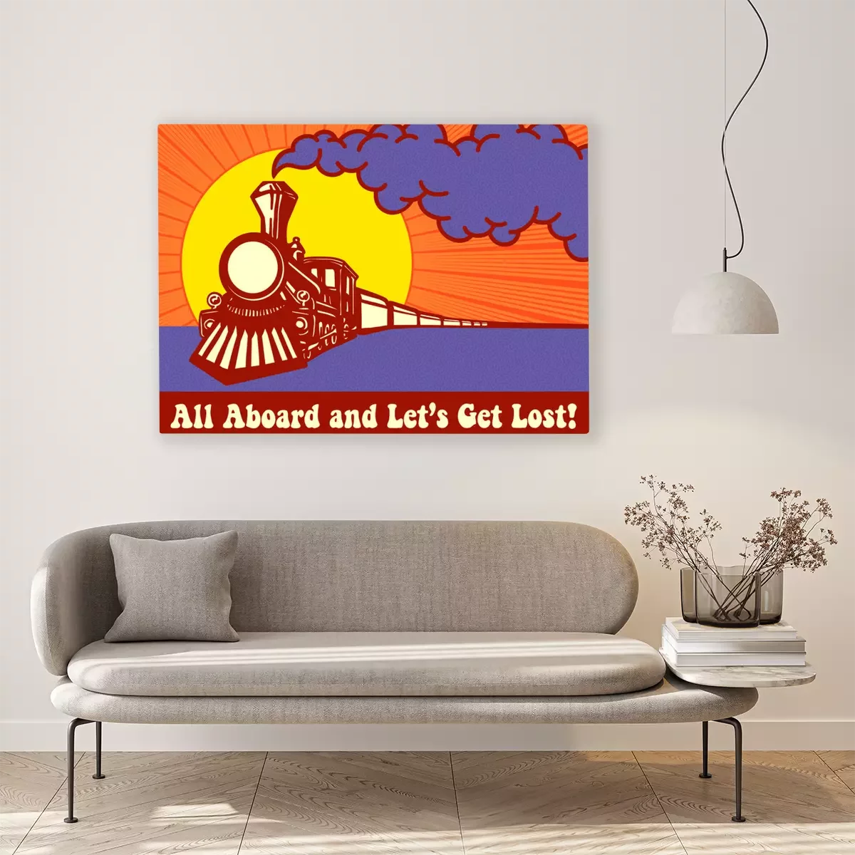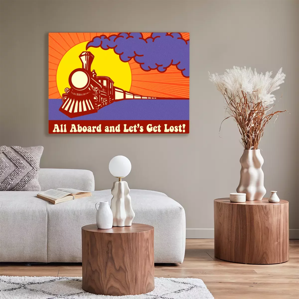Canvas: All aboard and let's get lost! Retro puffing steam train engine at sunset, express train