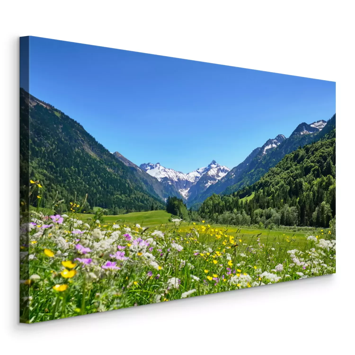 Canvas: Alpen, Blumenwiese in den Bergen mit Schnee auf Gipfel