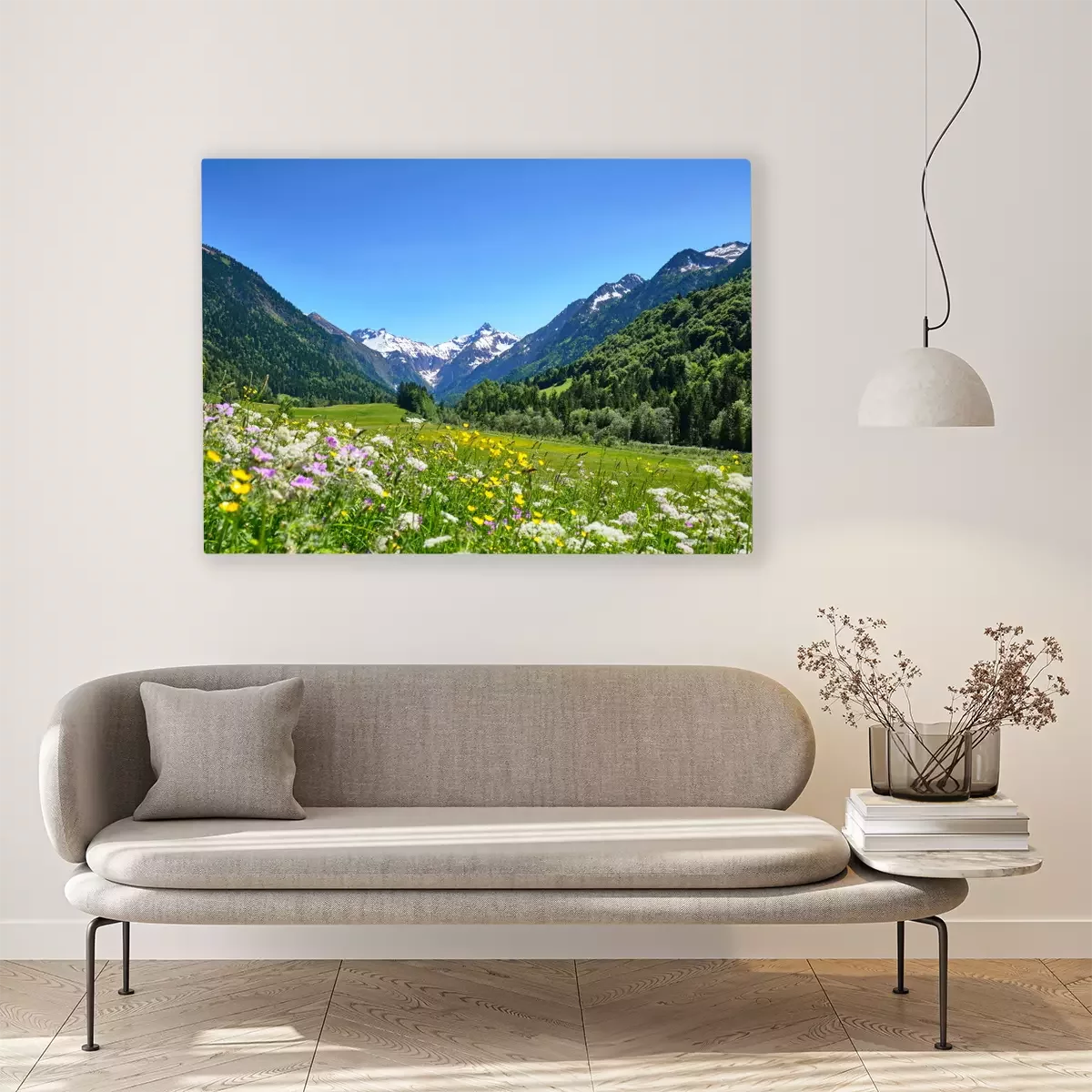 Canvas  Alpen, Blumenwiese in den Bergen mit Schnee auf Gipfel