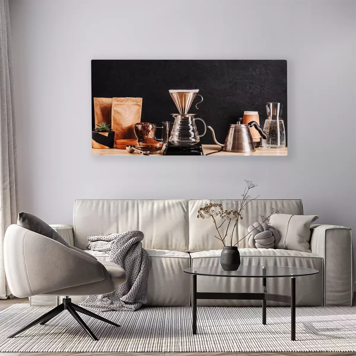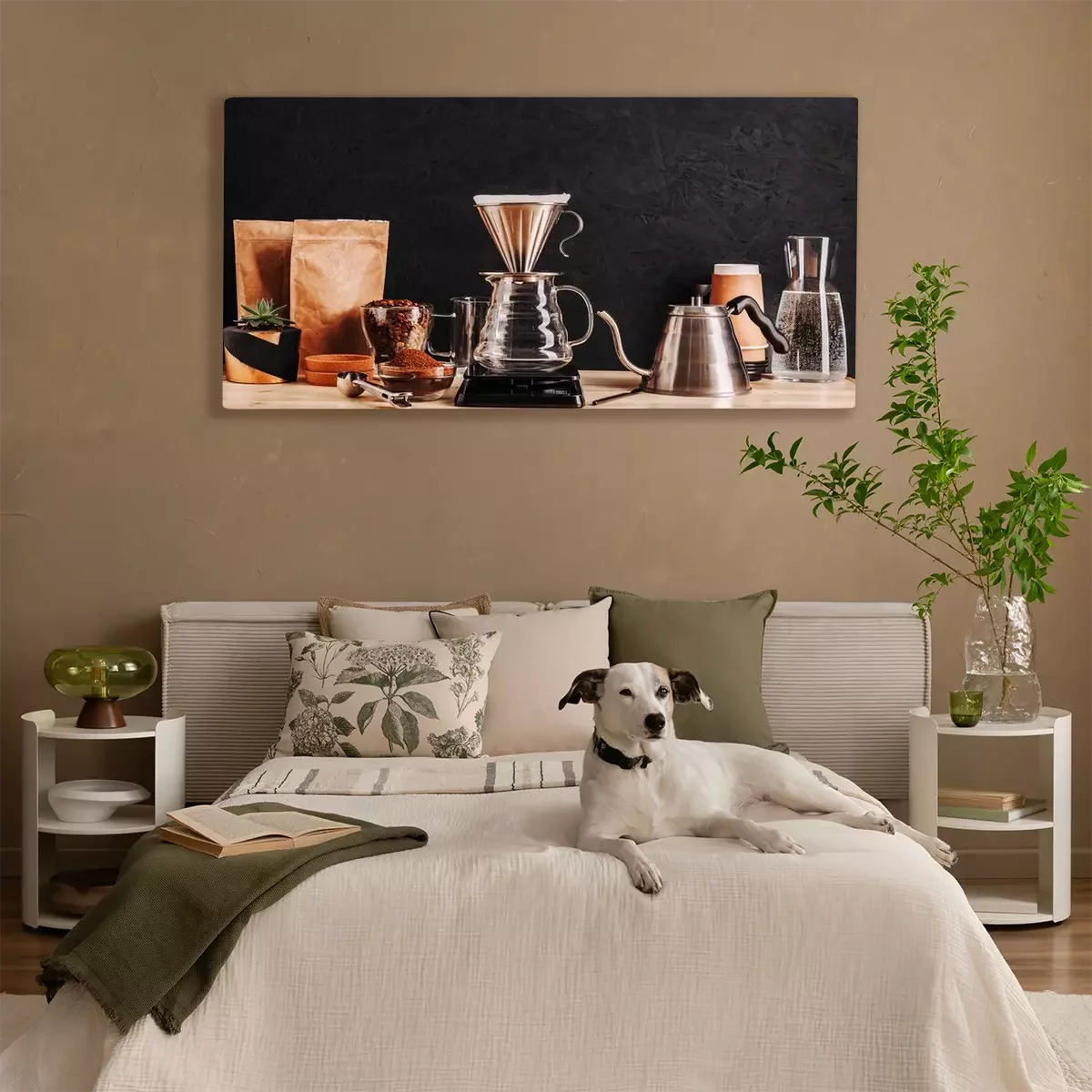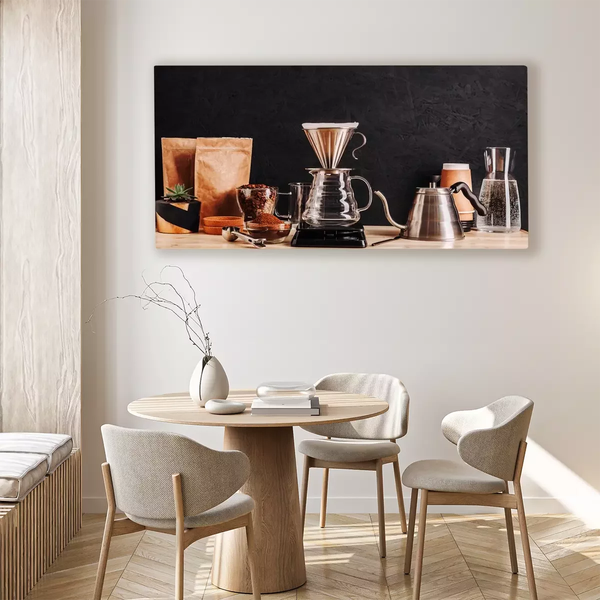 Canvas Alternative method of making coffee using a funnel filter, accessories for coffee drinks on a wooden table