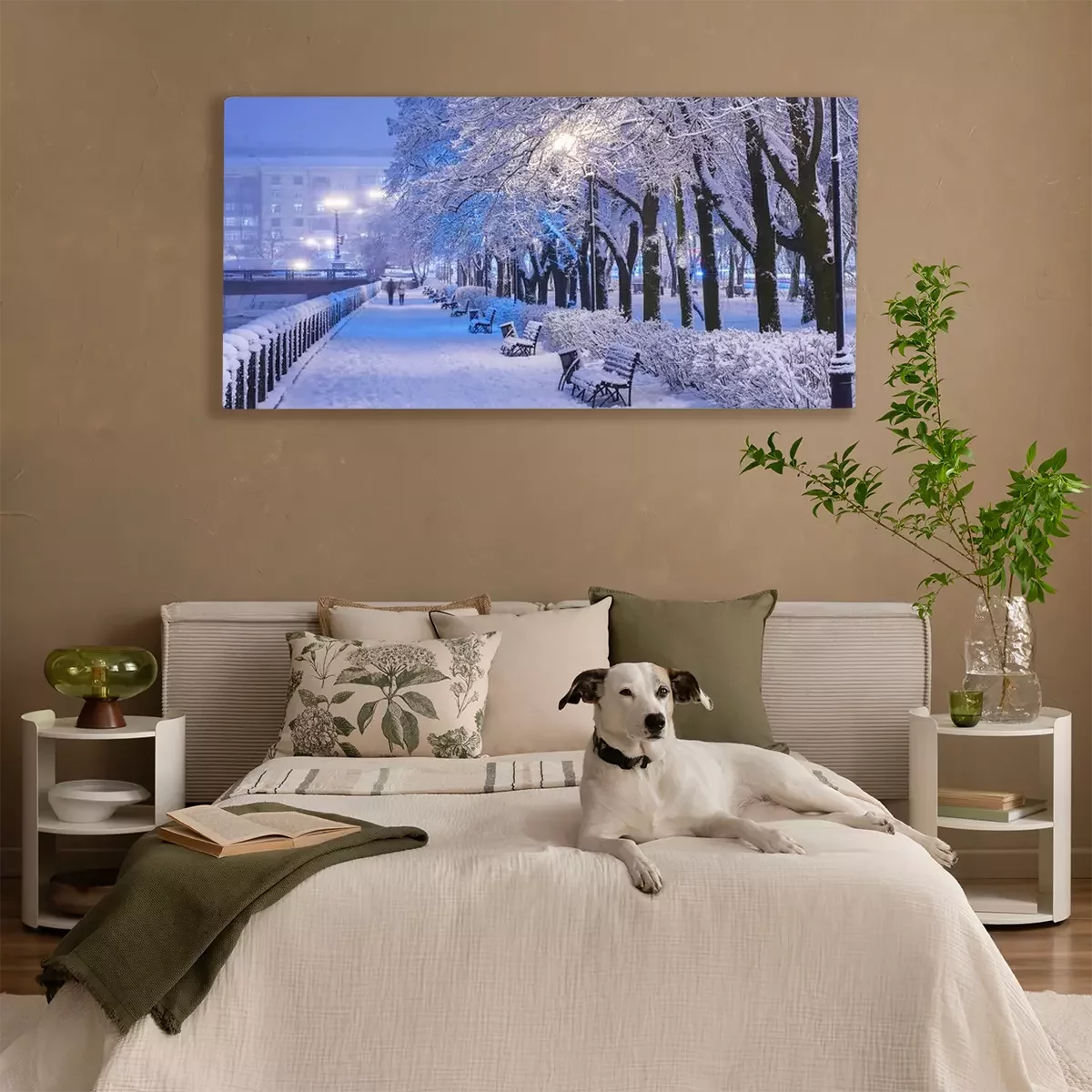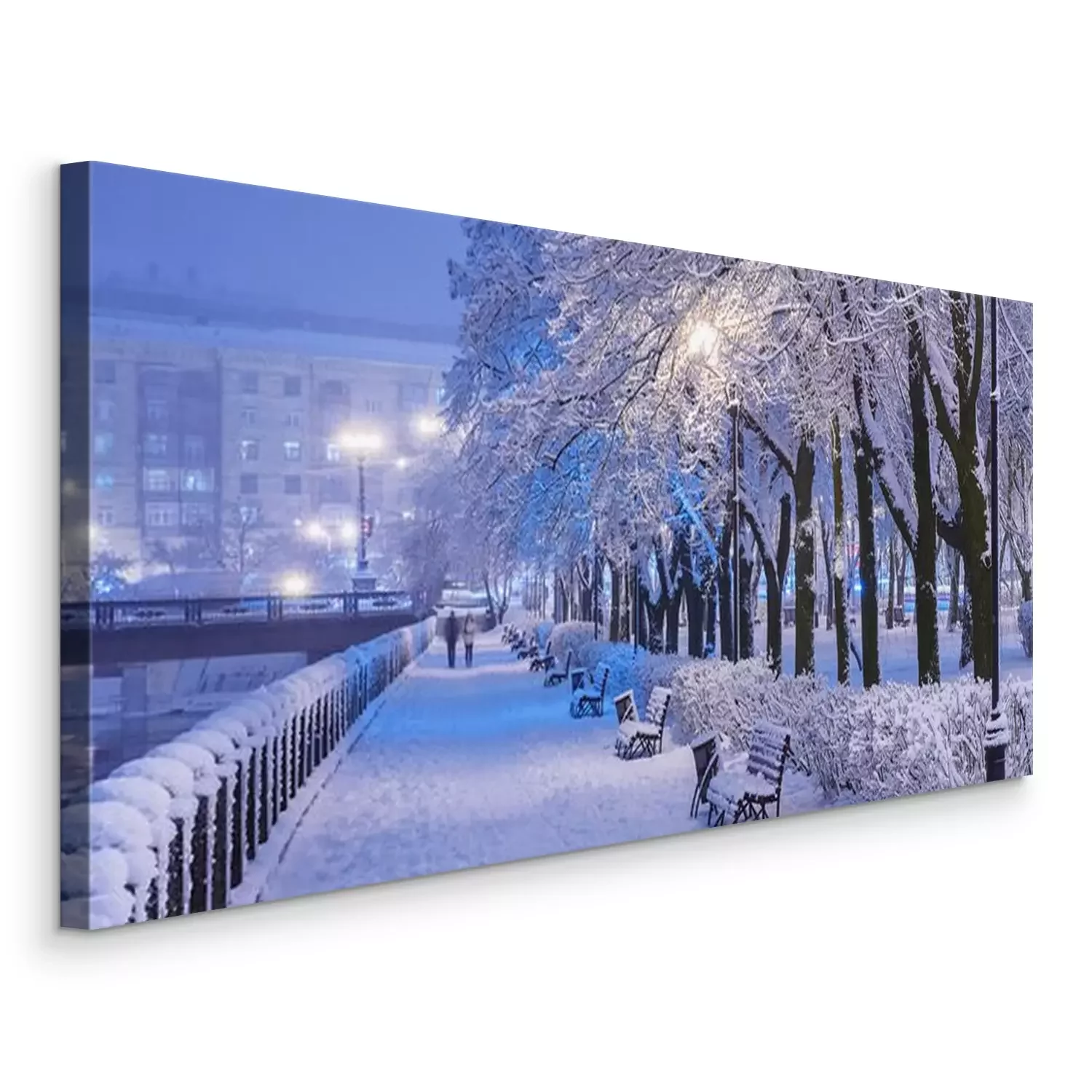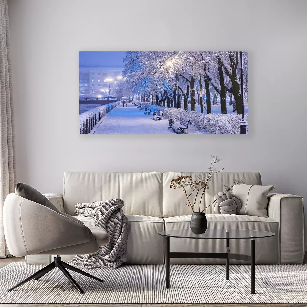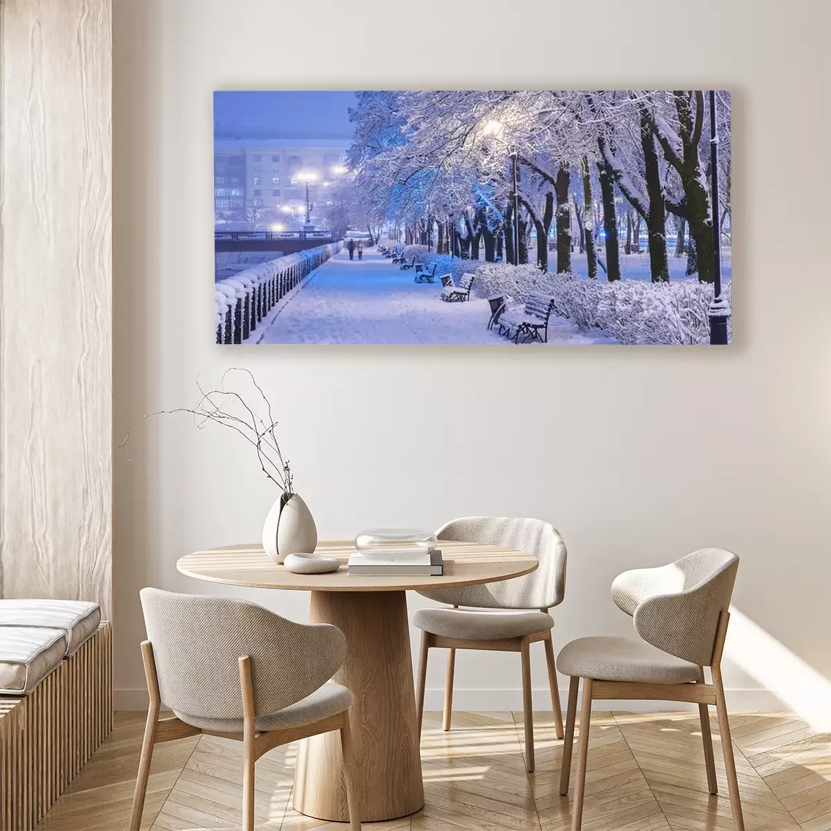 Canvas: Amazing winter night landscape of snow covered bench among snowy trees and shining lights during the snowfall. Artistic picture. Beauty world. Panorama